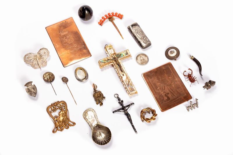 a cross in wood and mother of pearl; a brooch in the shape of a butterfly in silver filigree; a silver teaspoon; a metal and enamel elephant; a decoration in the shape of a crowned shield in metal; a lucky charm; two metal tie pins; a decoration in metal foil; a brooch in mother of pearl and metal with monogram; a brooch with two silver llamas; a small crystal egg with engraved two-headed eagle; a red glass scorpion (missing two legs); a token; two copper engraving plates; a silver crucifix; a match holder; a coral hair clip; a silver earring; a circular metal brooch; a small oval metal photo frame.