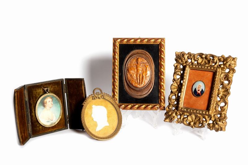 profile of Napoleon in biscuit within a gilt bronze frame; a miniature depicting a female figure, dated 1917 ; the other miniature depicting the Madonna; the high relief depicting the Madonna and Child, signed H. Steiner Merano