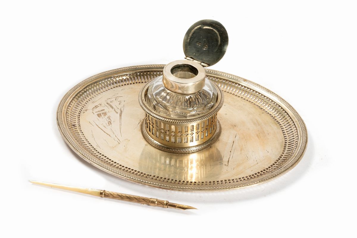 composed of a silver tray, Mantua 1781; silver inkwell, England 1890; and a mother-of-pearl and golden metal nib