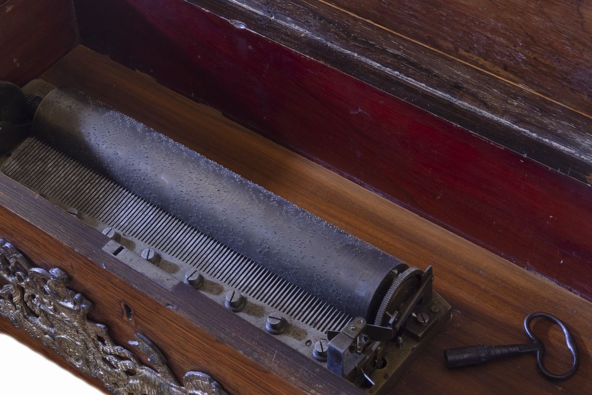 furniture in wood and metal, inlaid with rocaille motifs on the top and on the front frieze in gilded bronze depicting a chariot drawn by horses, preceded by winged fame and surmounted by a female figure with a lyre; signed on the top left music Ducommun Girod and with serial number 16309