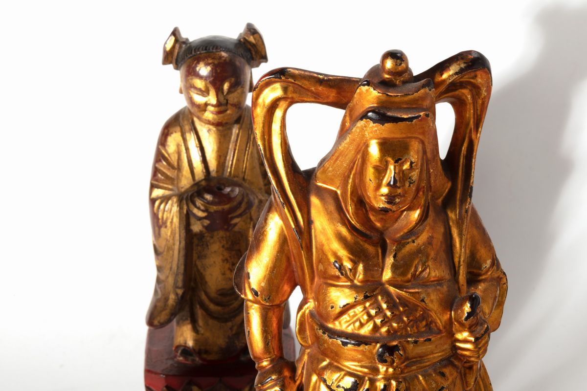 Lot consisting of eight lacquered and gilded wood sculptures depicting dignitaries, China, Qing dynasty