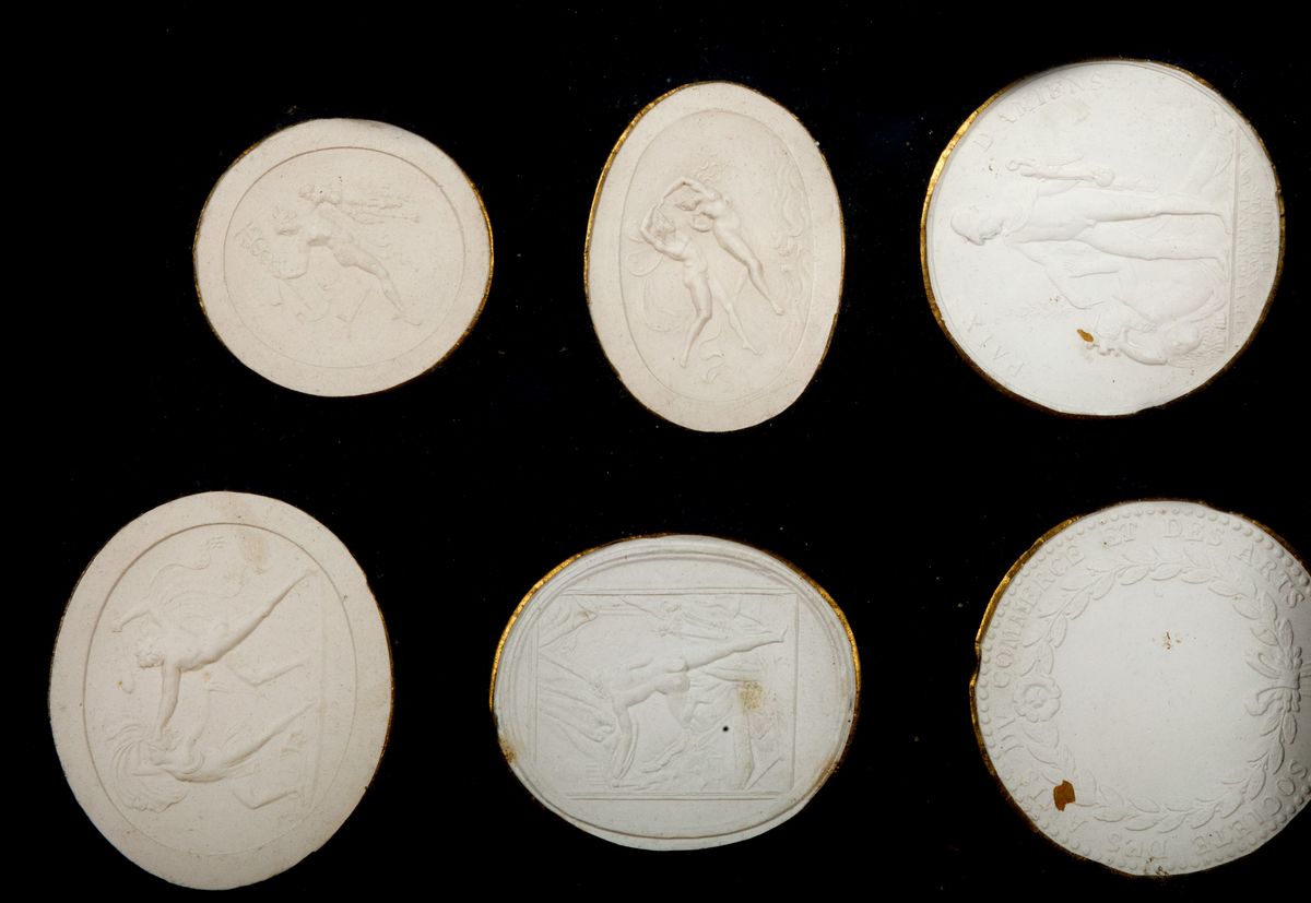 Pair of faux tortoiseshell frames with plaster casts of cameos, neoclassical style