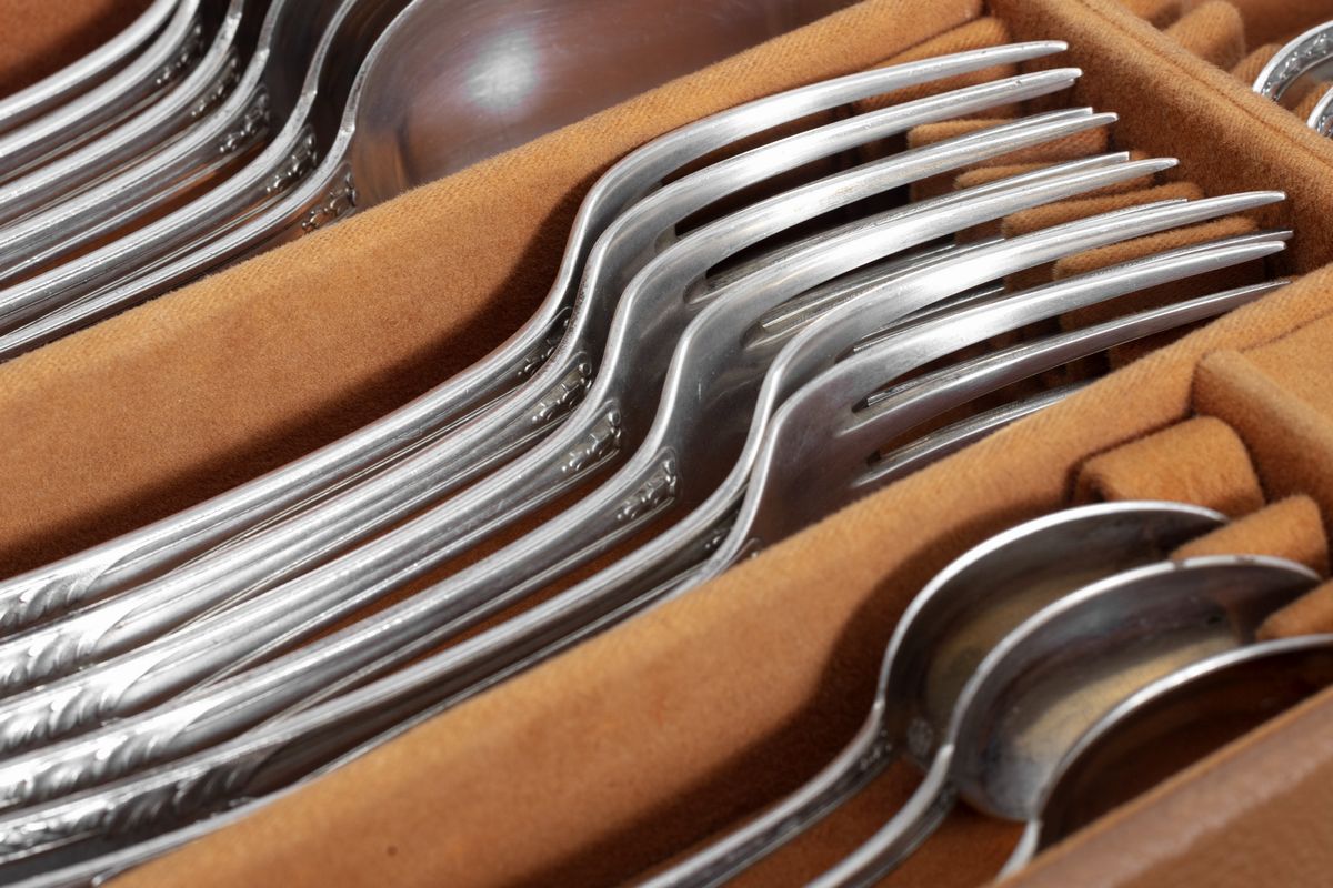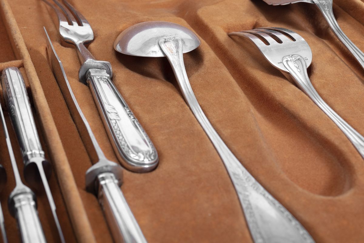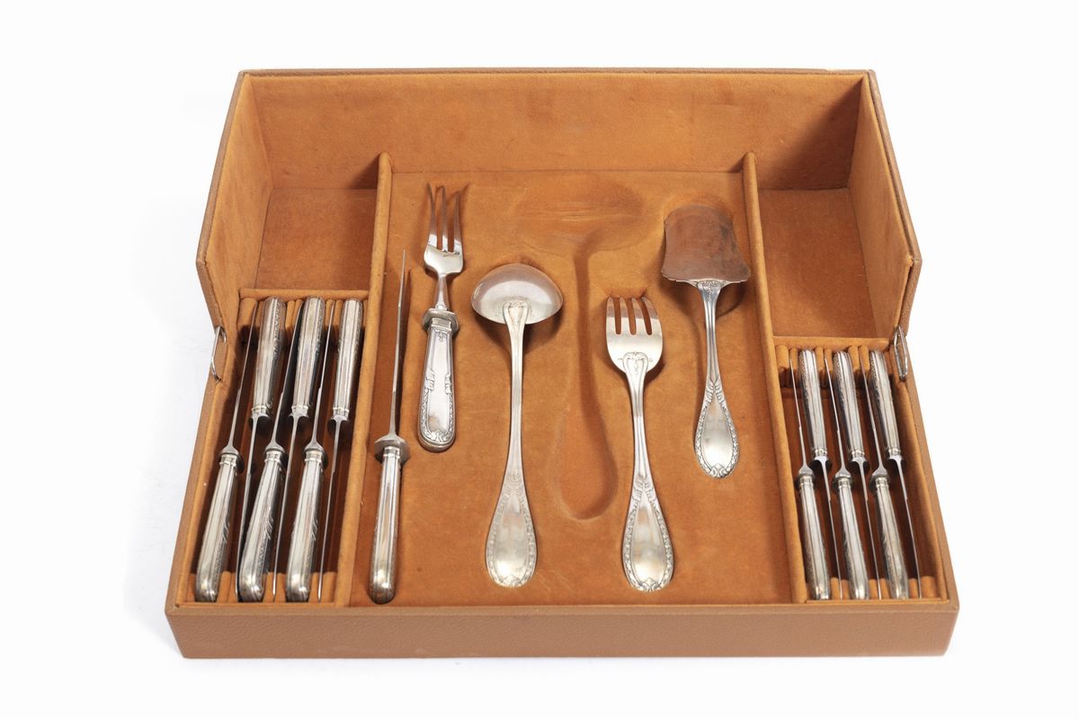 consisting of 12 knives, 6 spoons, 6 forks, 5 dessert spoons, 3 dessert forks, 6 coffee spoons, 5 serving cutlery