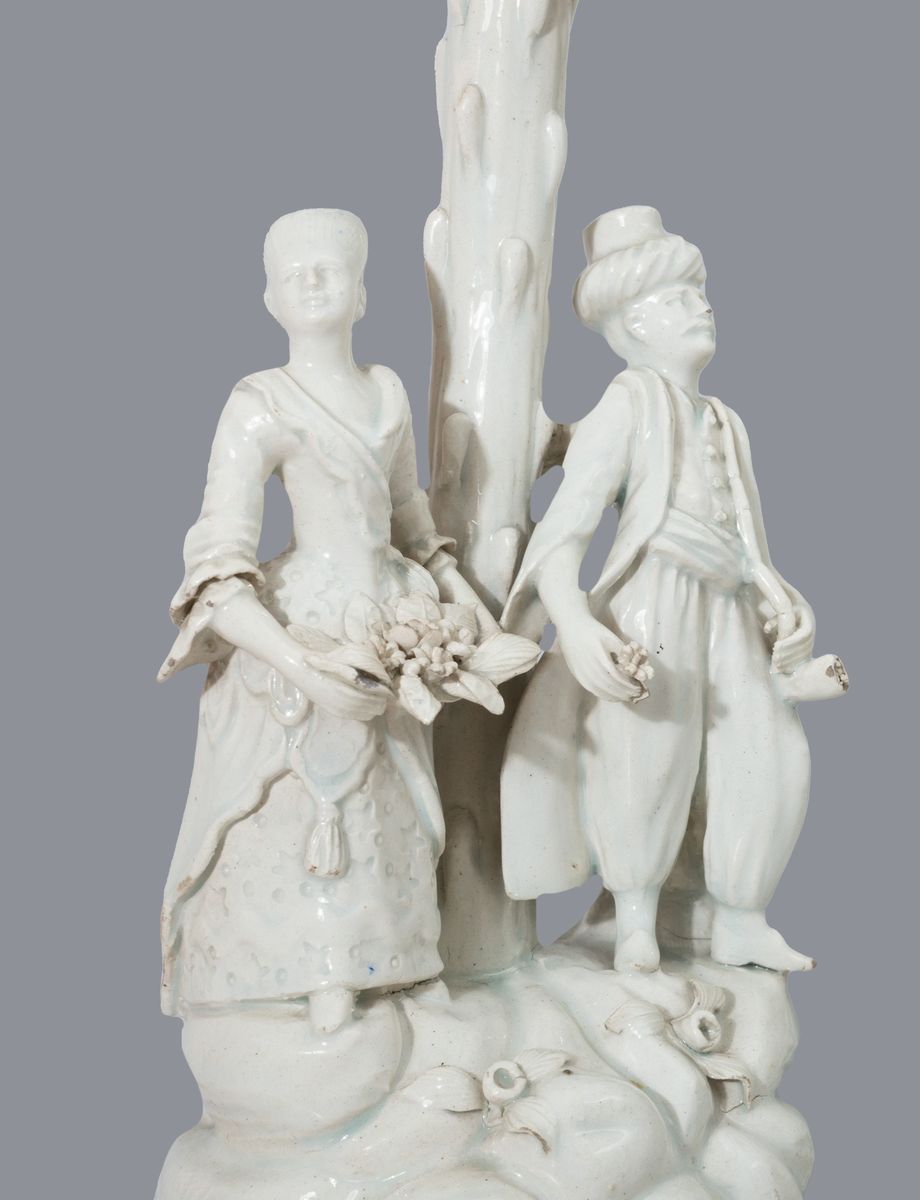 Sculptural group in white majolica from Nove di Bassano depicting two musicians leaning against a...