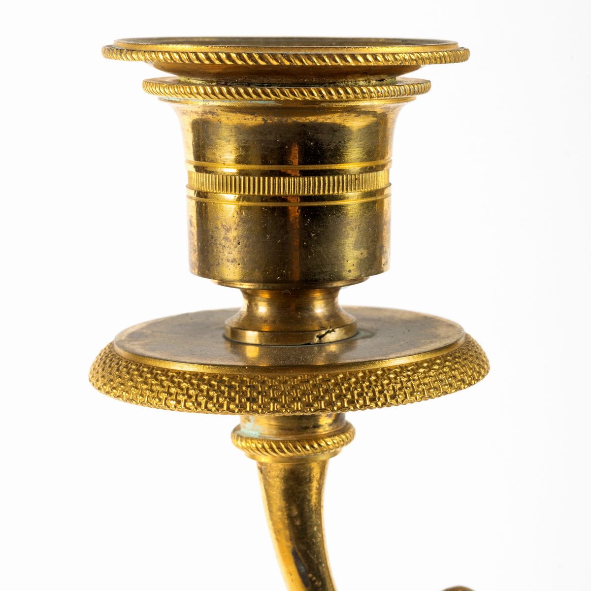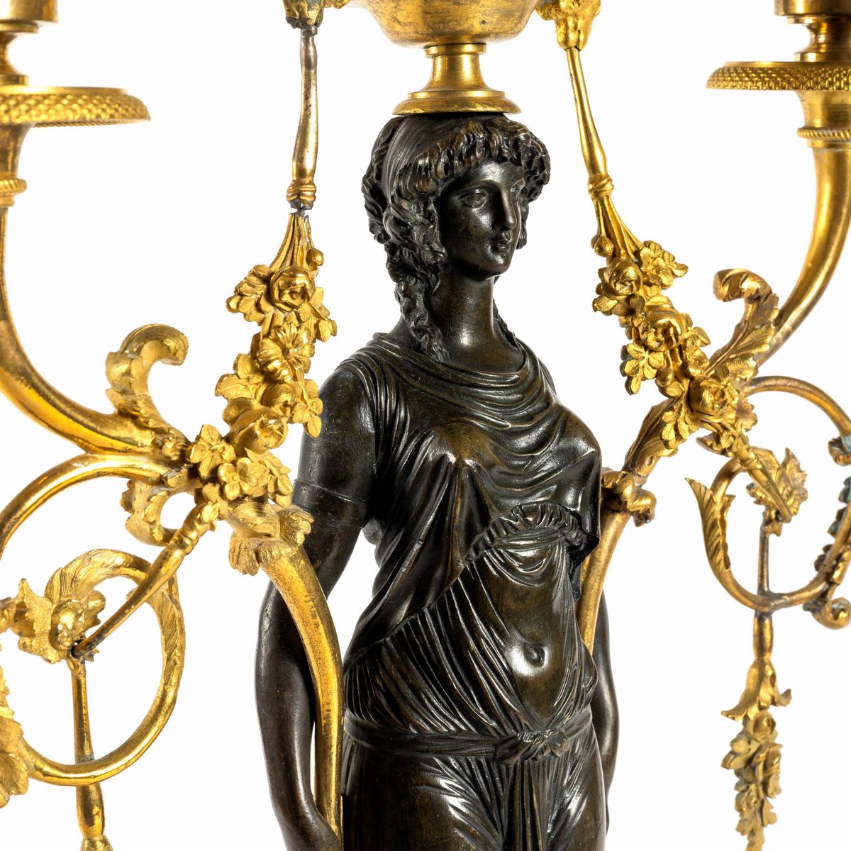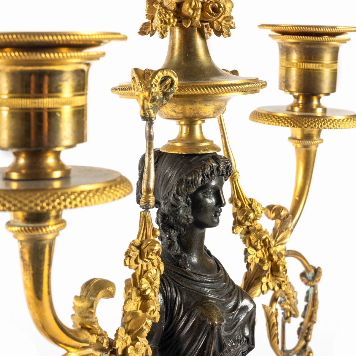 Pair of two-armed Empire candlesticks in gilded bronze and dark patina with caryatids, France, early 19th century