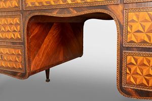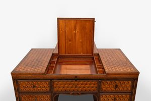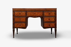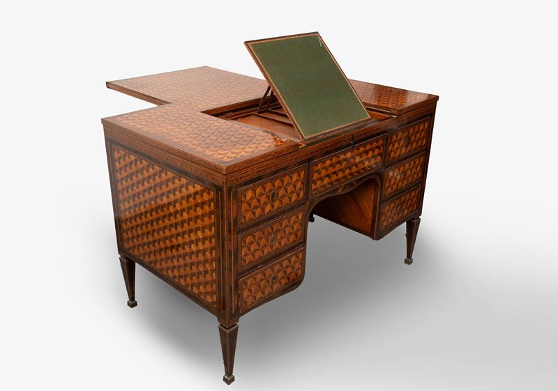 Exceptional Louis XVI center desk inlaid in various essences with geometric motifs, Northern Italy, 18th century
