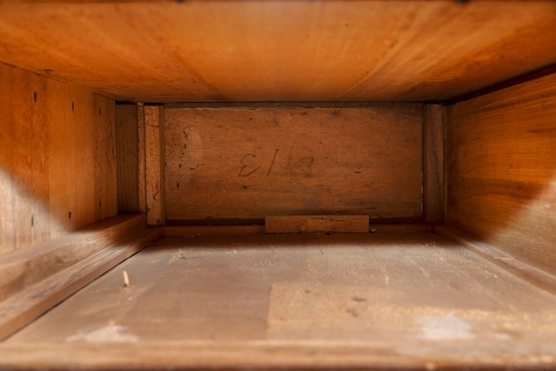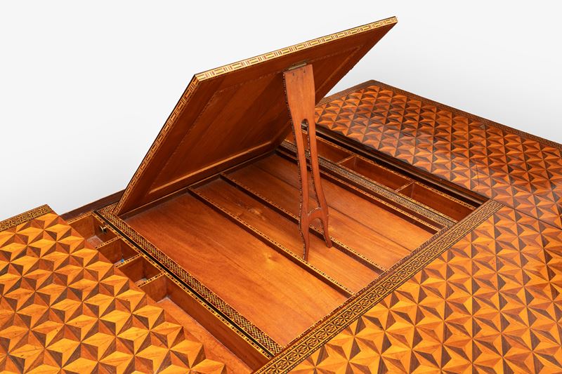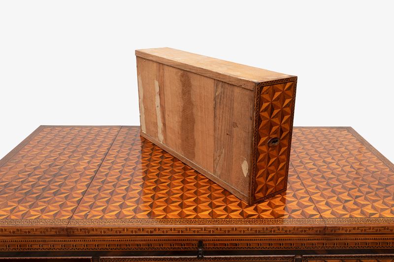six drawers on the front and a false drawer in the center under the top; sliding top that hides a writing surface, a mirror, an inclined surface, two containers on the sides and various drawers with secrets; inlaid with geometric motifs on all sides and on the top; on the back seven fake drawers; also slabbed in the lower and internal part; Inverted obelisk legs with square bronze feet