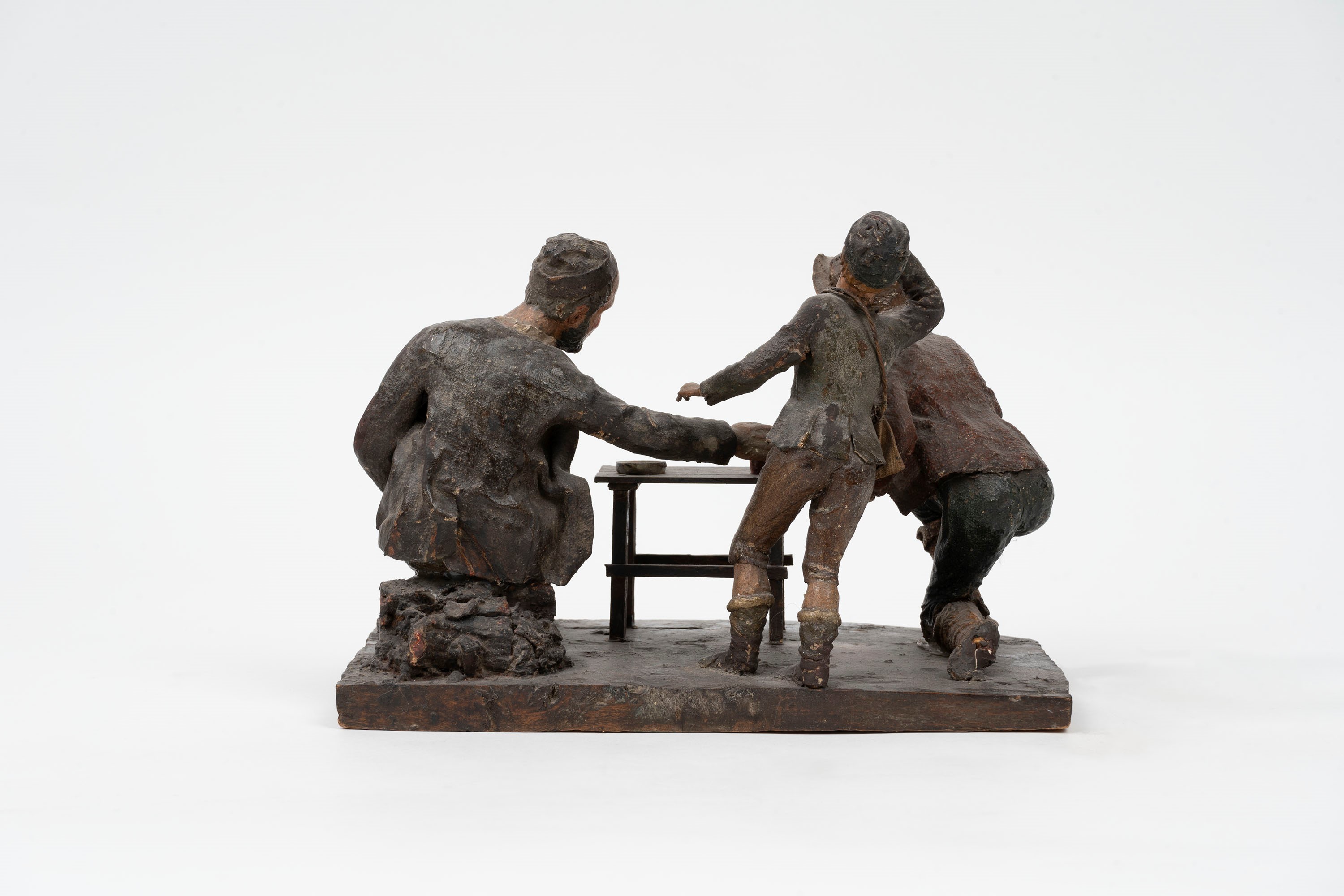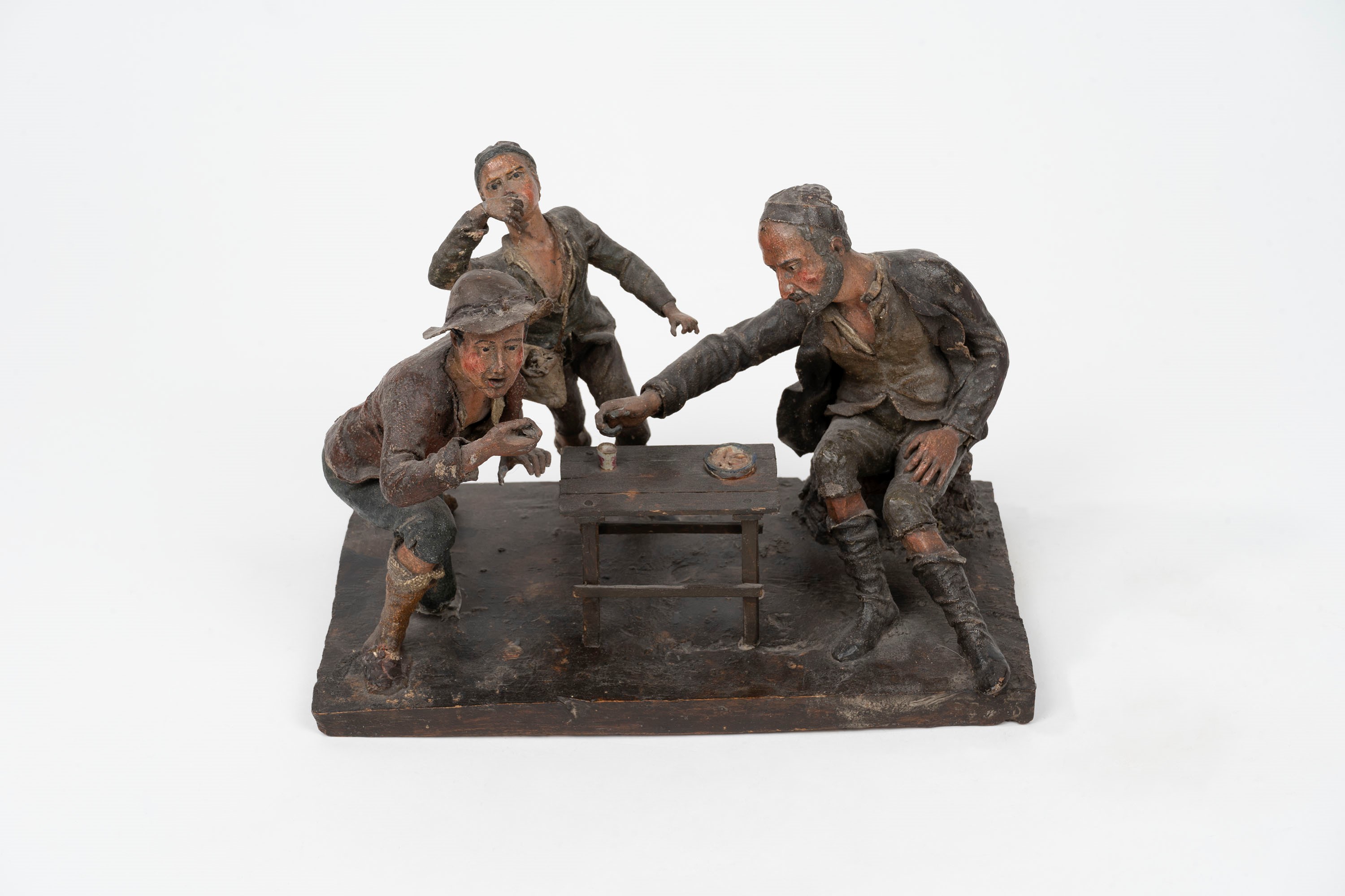 in papier-mâché, canvas and wood painted in a single composition, depicting drinkers in a tavern, Sicily, 18th century