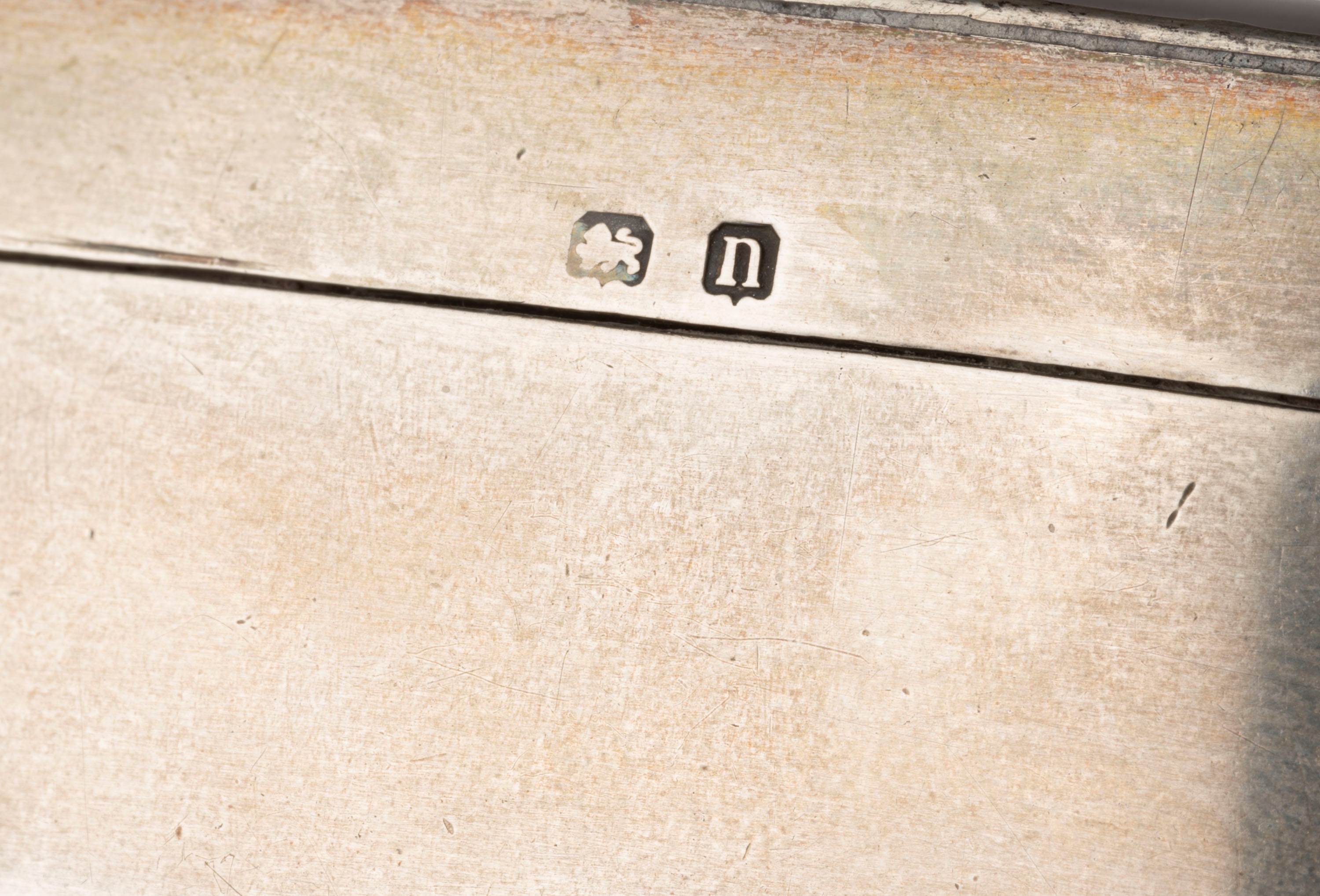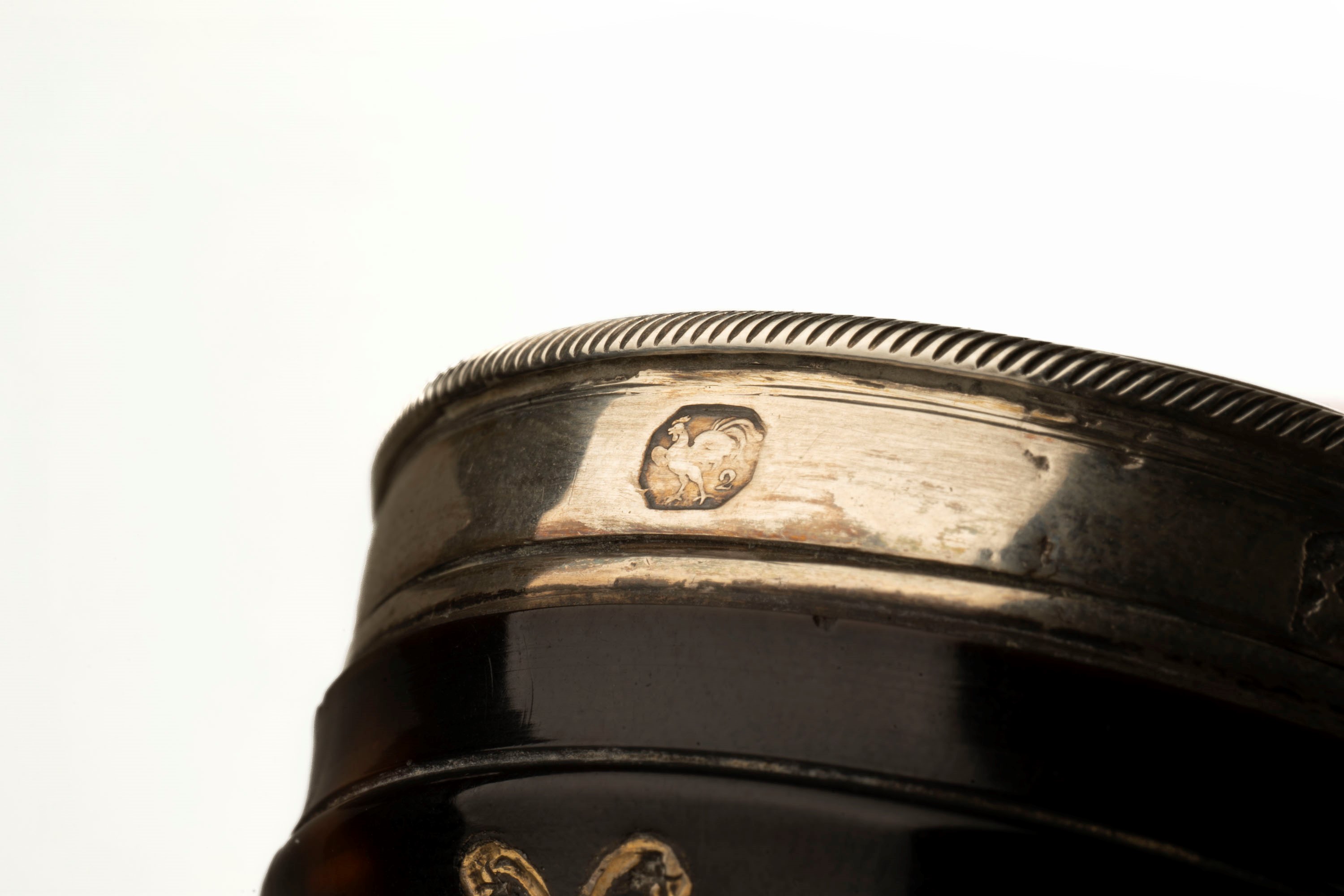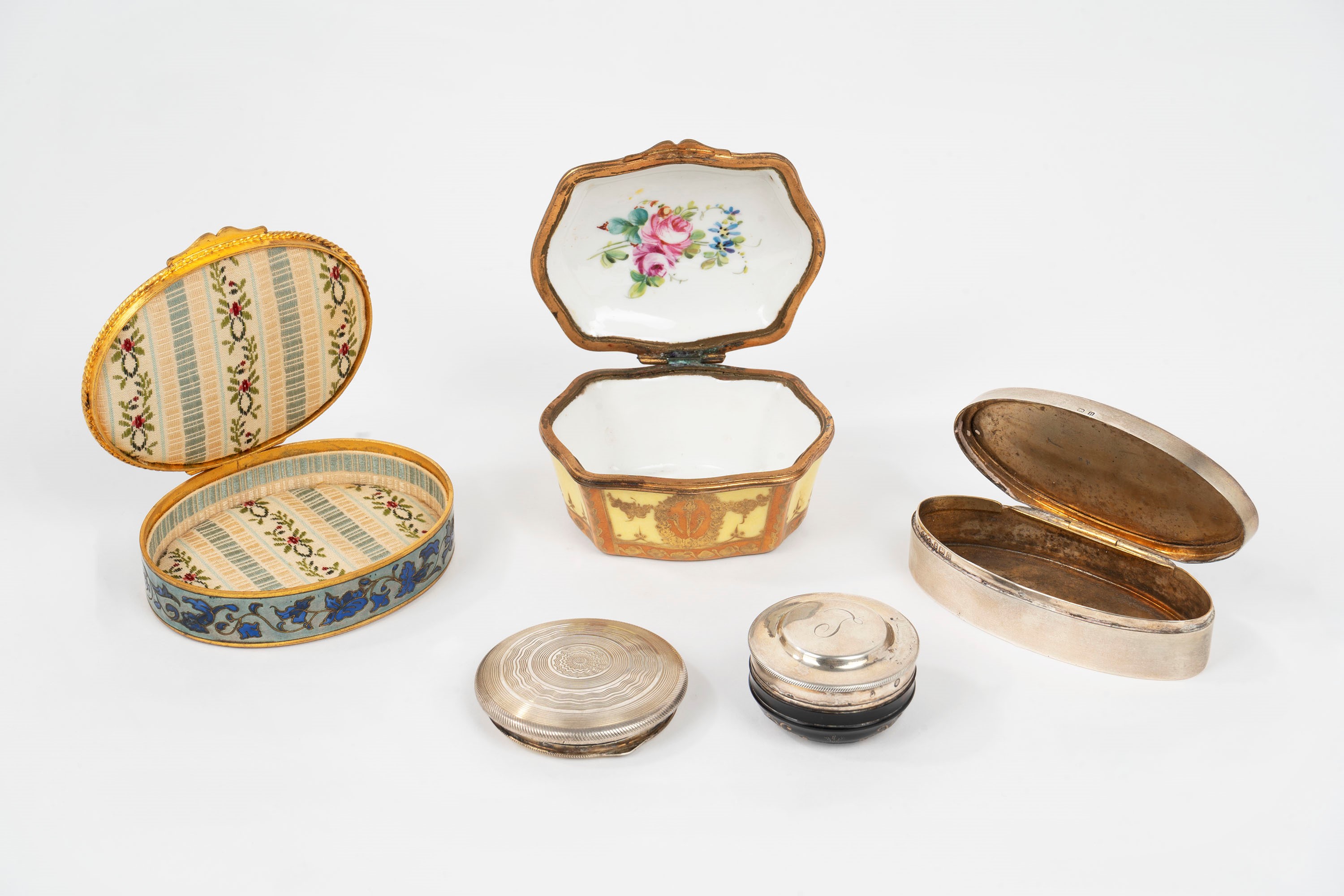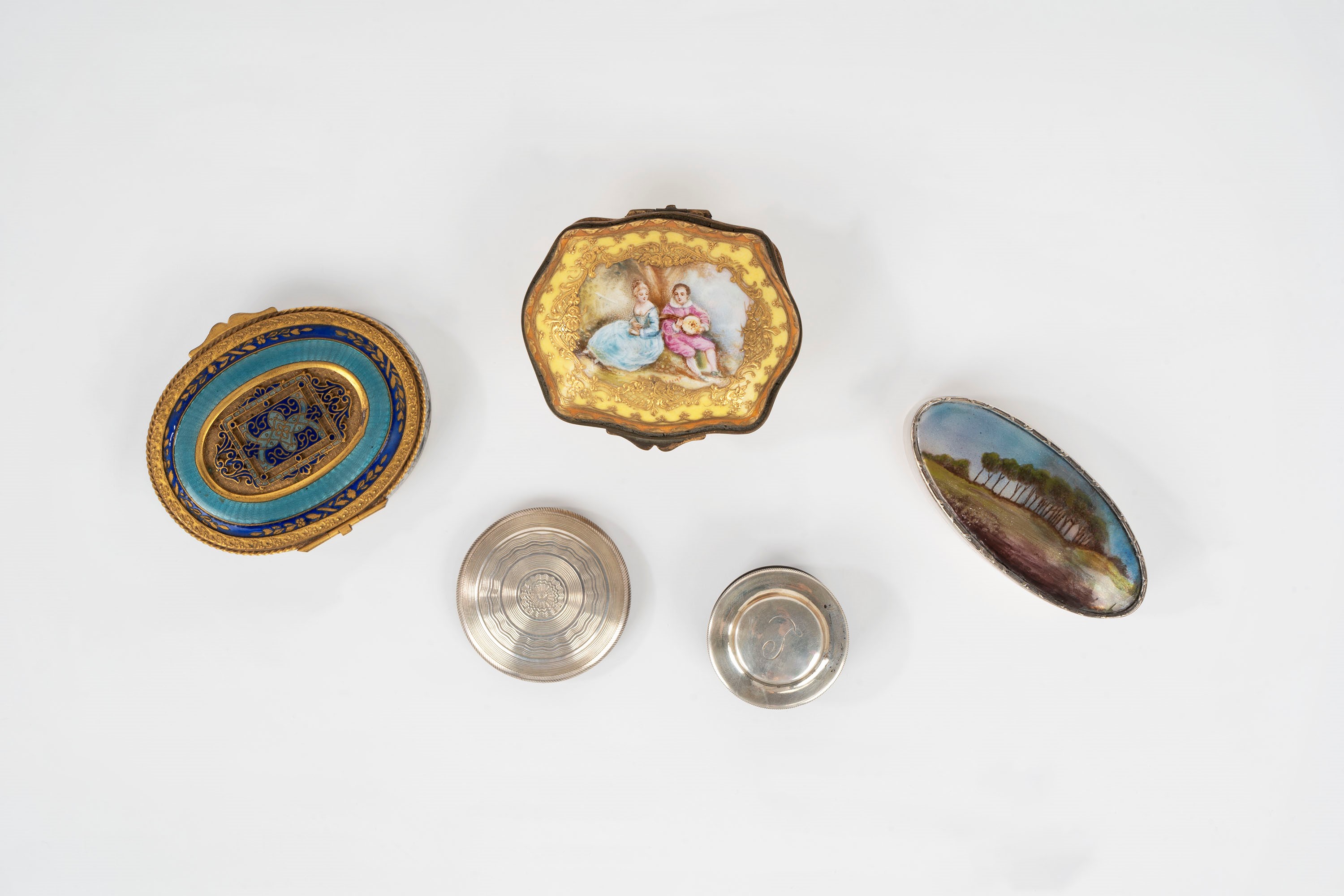 a porcelain and bronze box, with a romantic scene; hallmark under the base "crossed ears", France; a silver box with enamel depicting a landscape, Birmingham, early 20th century; a golden metal box with cloisonné enamel with floral and geometric pattern; a horn and silver box, 2nd Coq hallmark, France, early 19th century; a silver and enamel powder compact with a pierced and engraved vase in the center; mirror inside, Austria, 20th century
