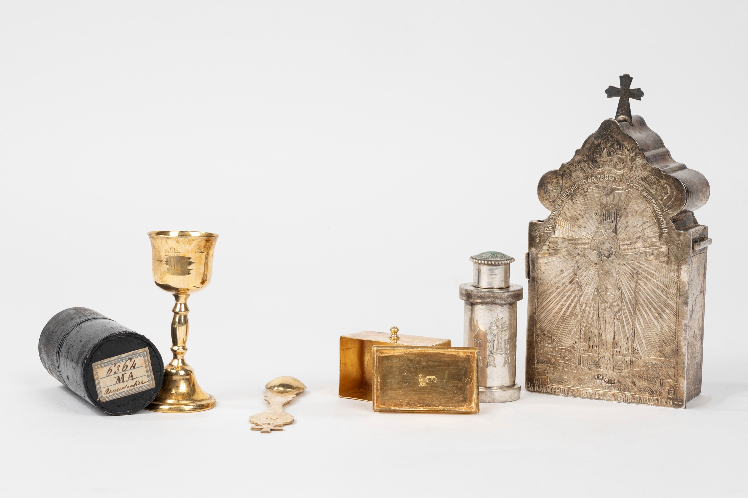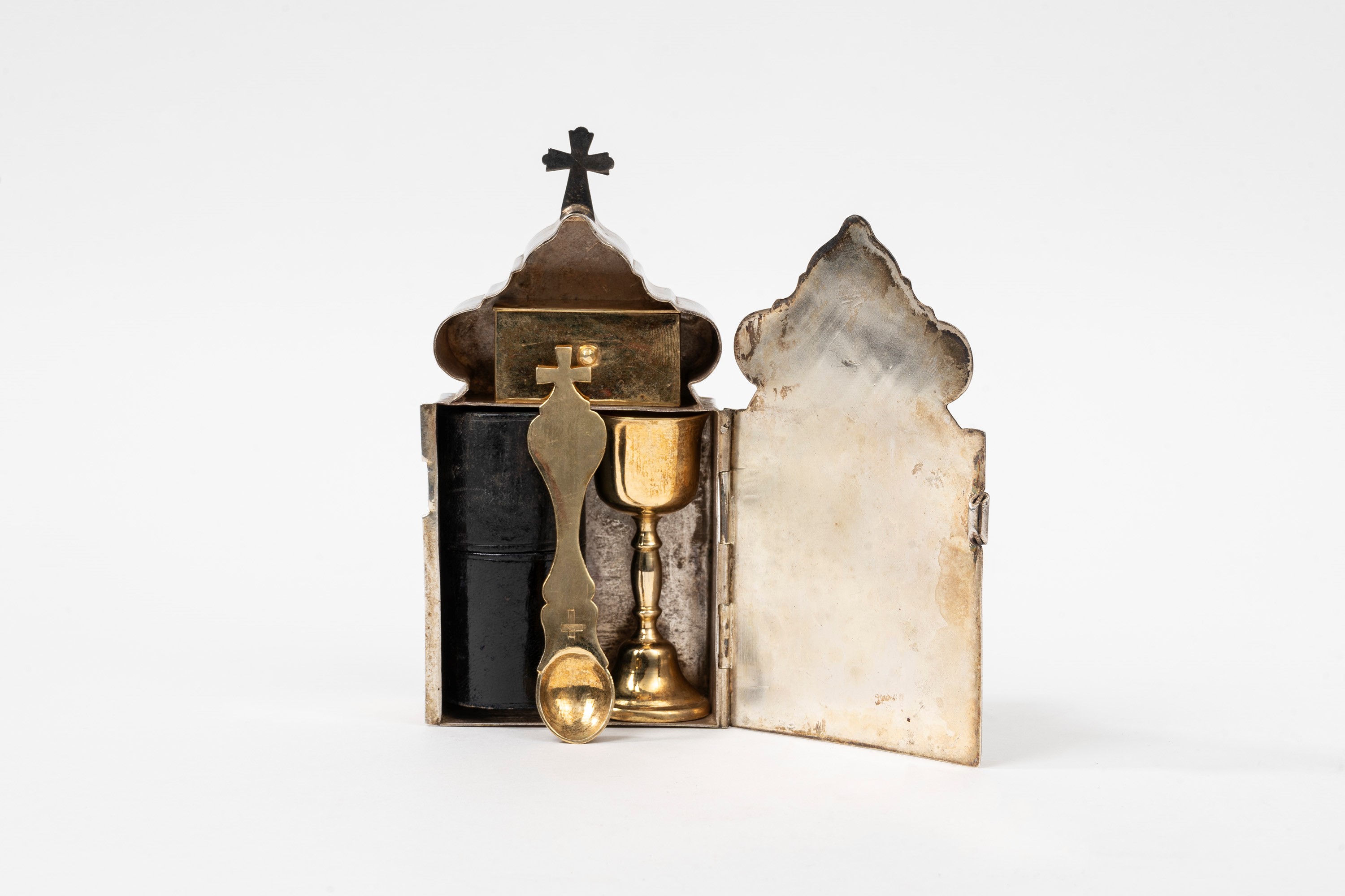 contains a small chalice, a small urn for hosts and a teaspoon in gilded silver, and a small silver sprinkler in a case