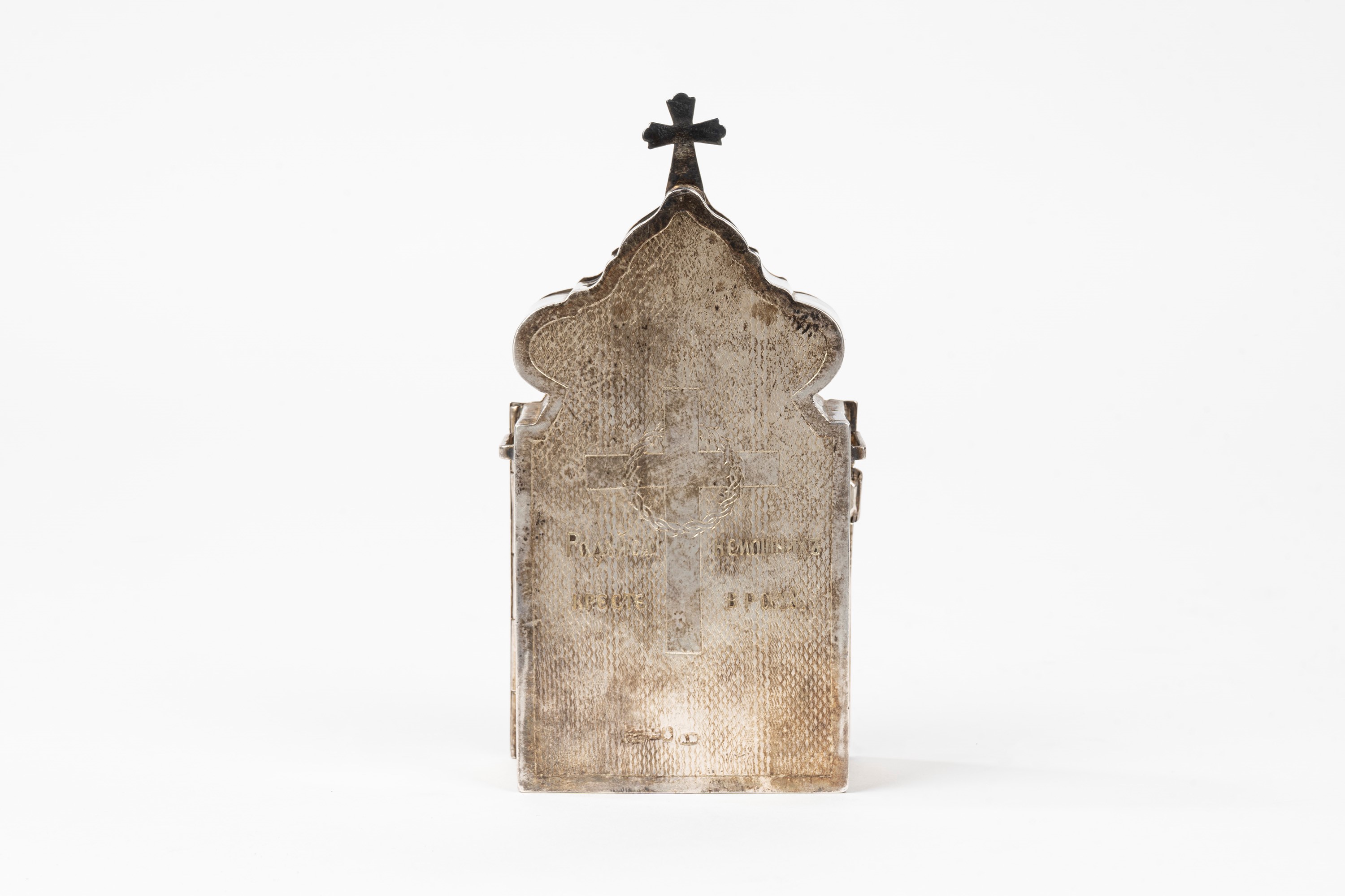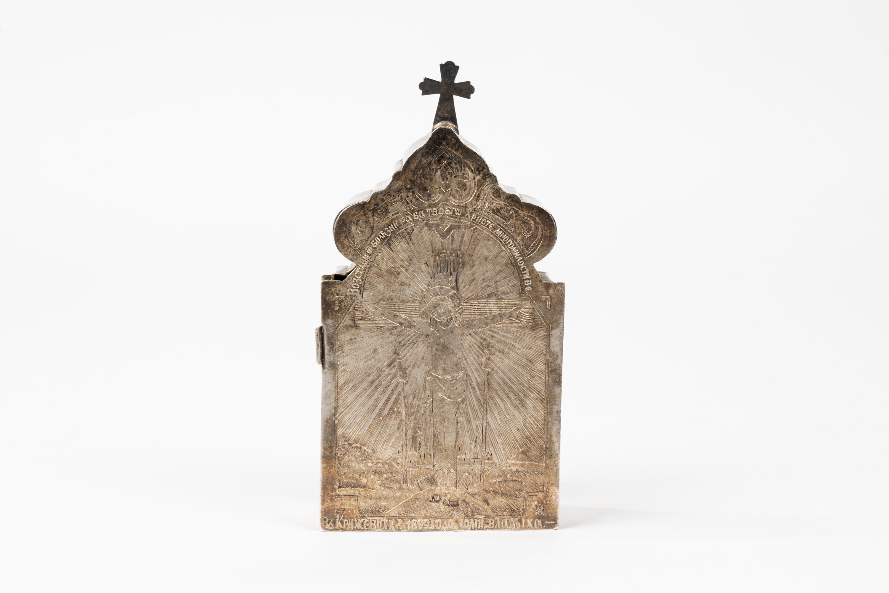 decorated on the front with the Crucifixion and inscriptions in Russian also on the back