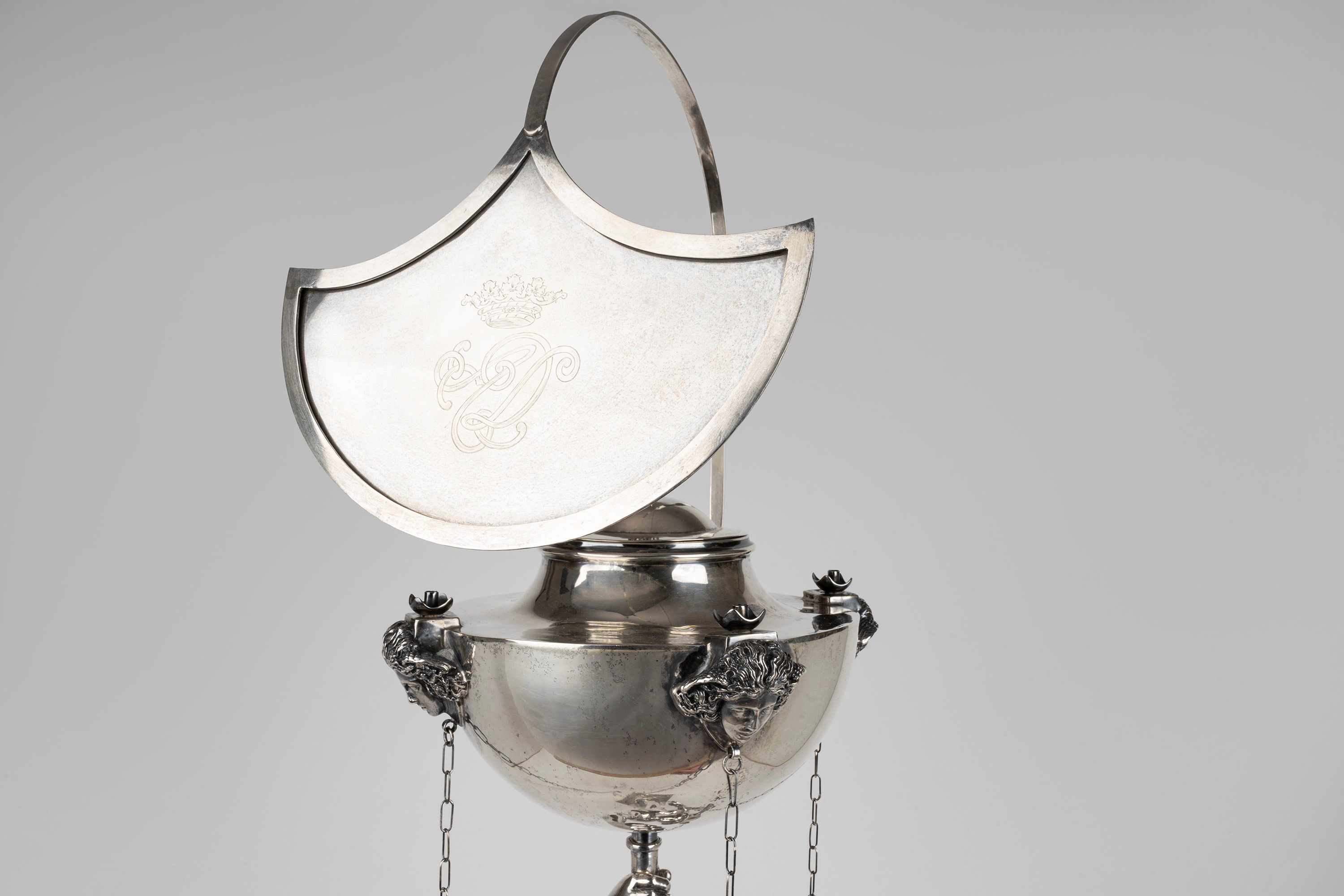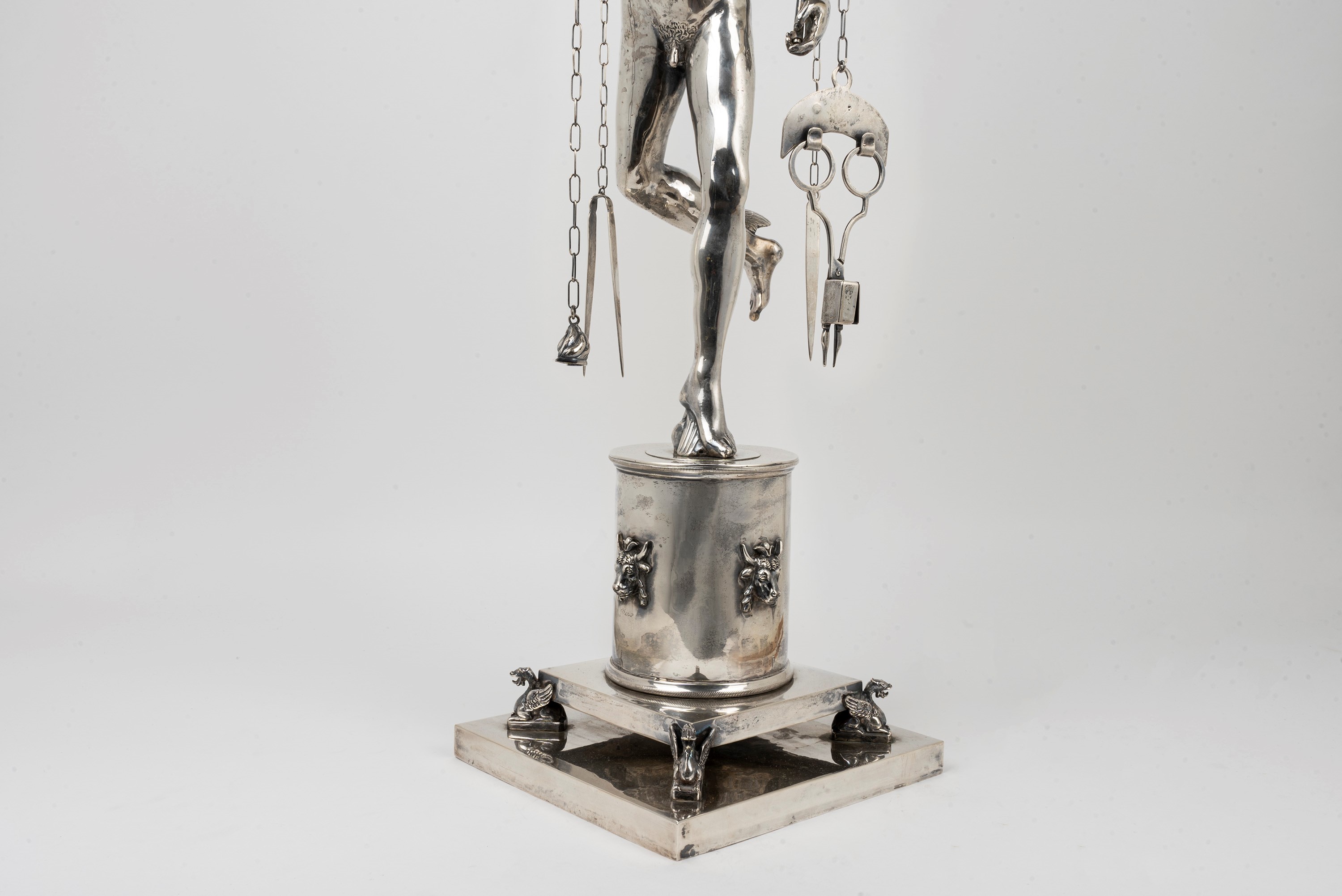 lantern with fan, decorated with Medusa heads, cylindrical base with bull heads, resting on a base with griffin-shaped feet