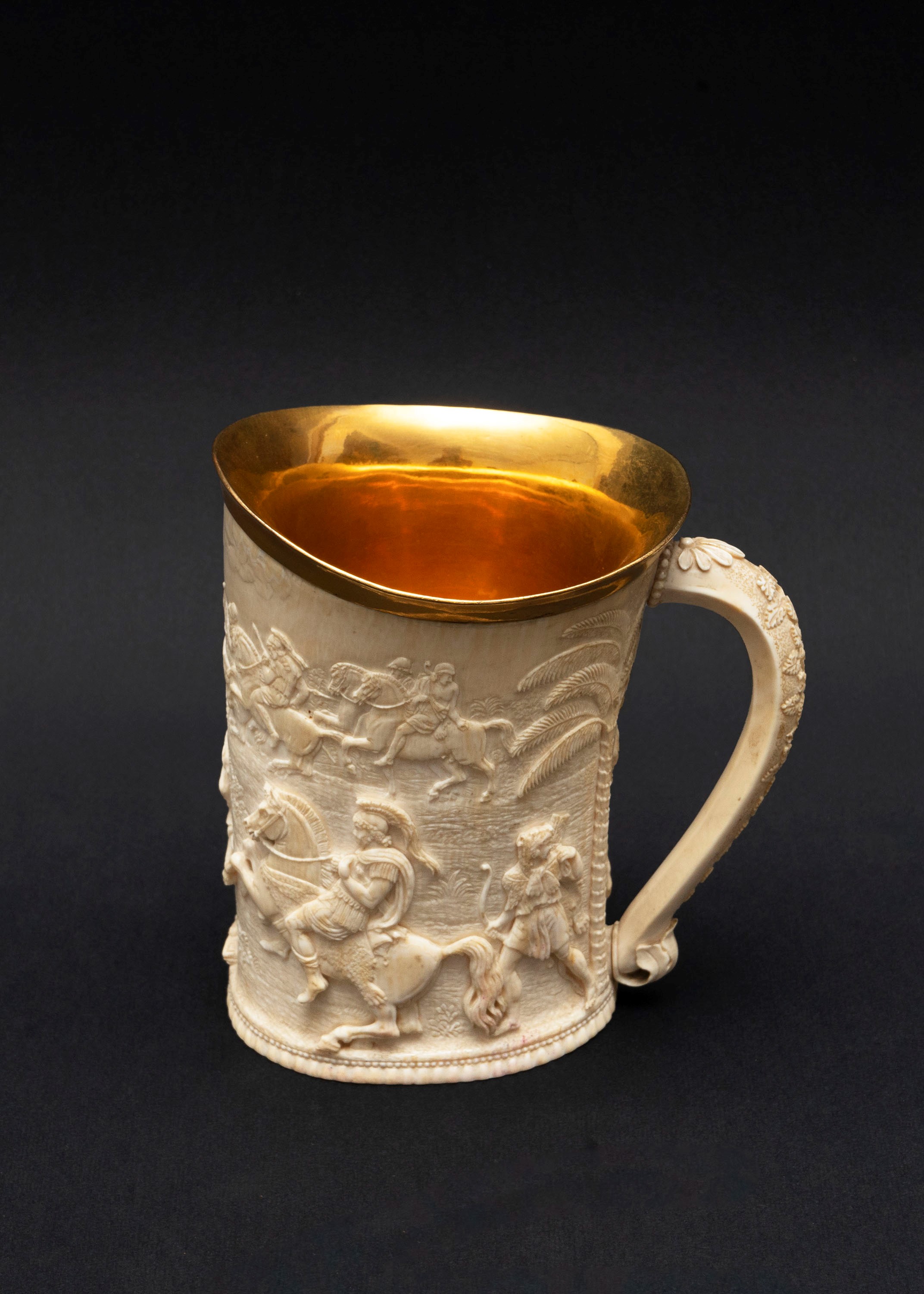 carved on the body with warrior on horseback, archer and quadriga led by winged Fama