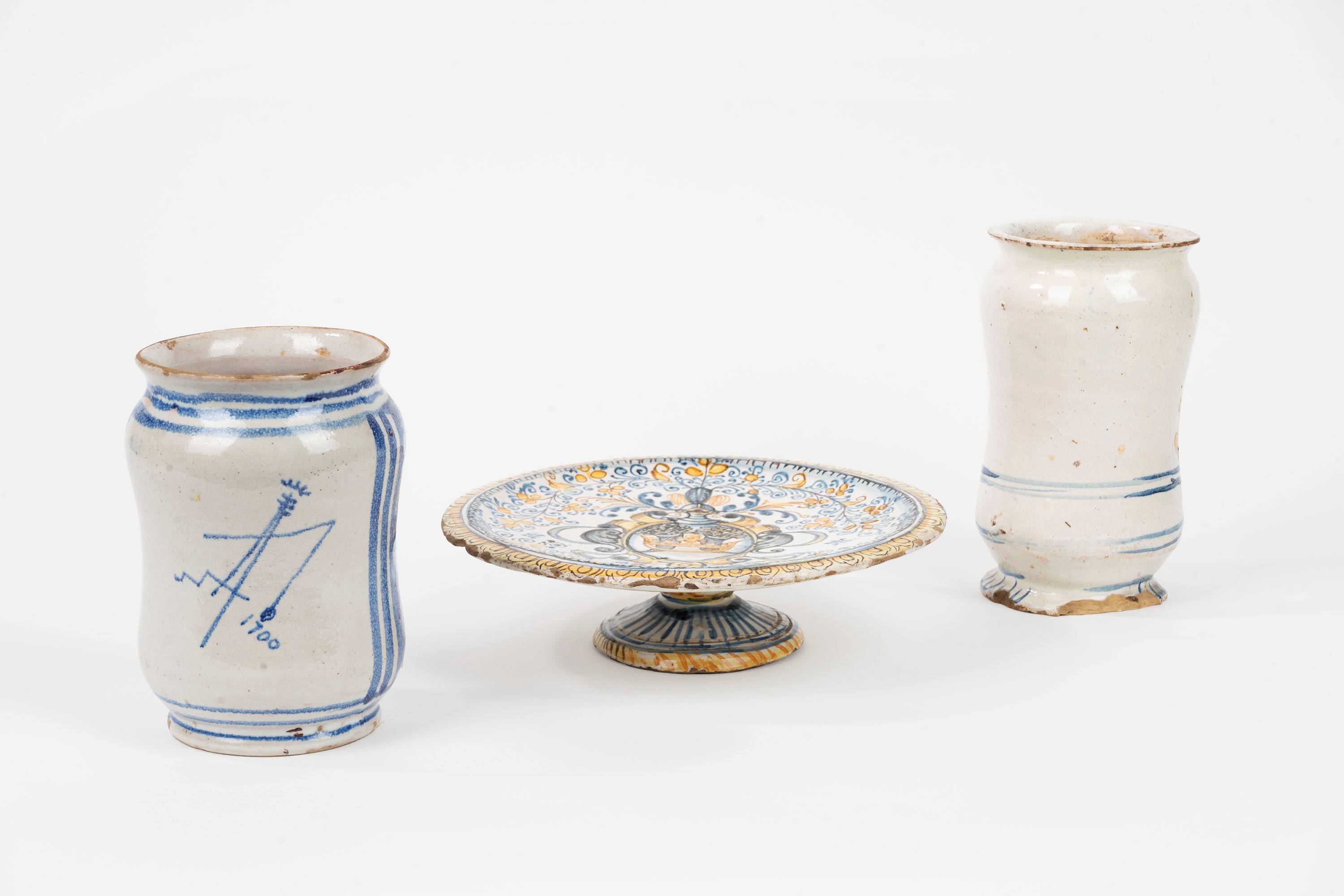 Two albarelli and a polychrome majolica stand, 17th-18th centuries