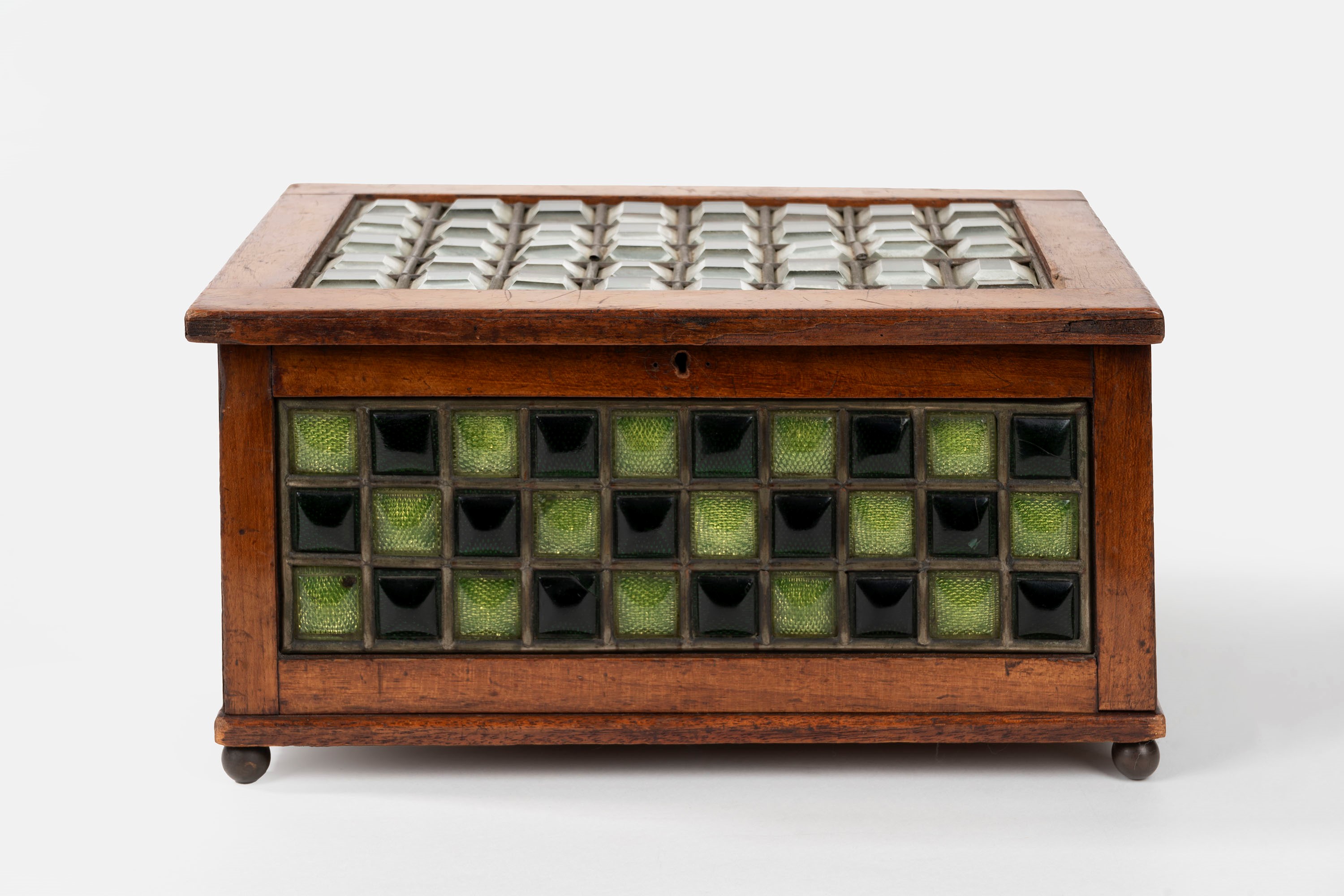Wooden chest decorated with checkerboard motifs with crystals and glass, early 20th century