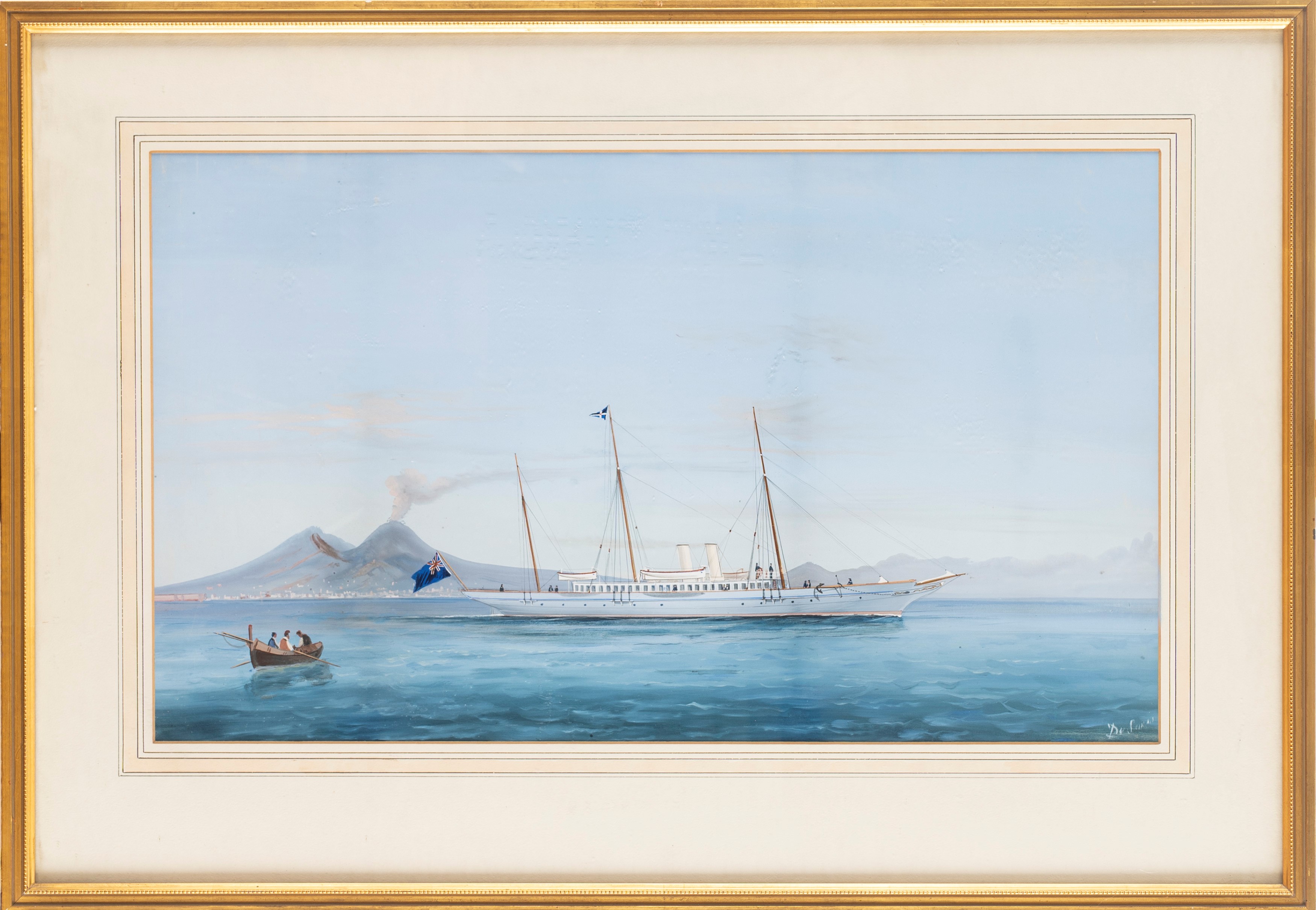 Three-masted steam yacht with English flag sailing in the Gulf of Naples