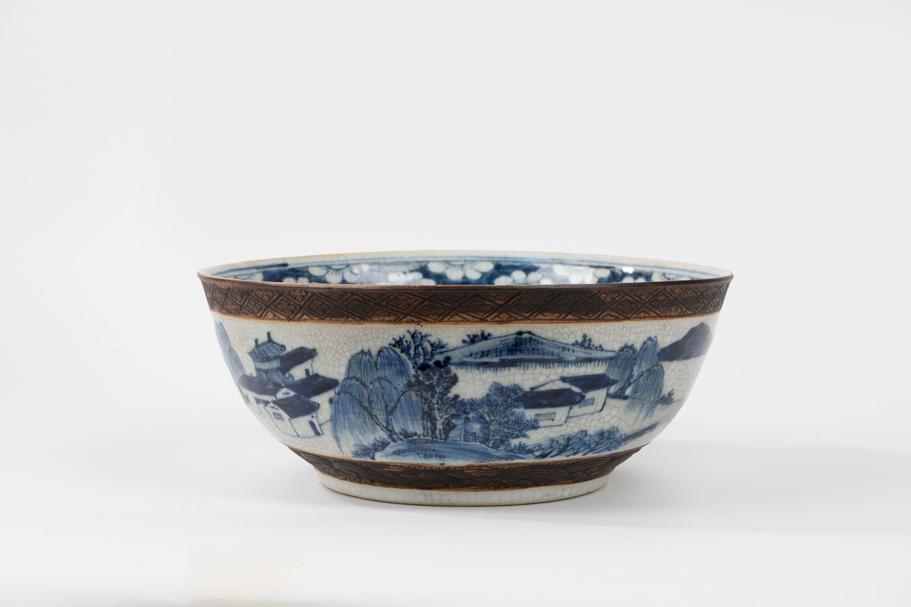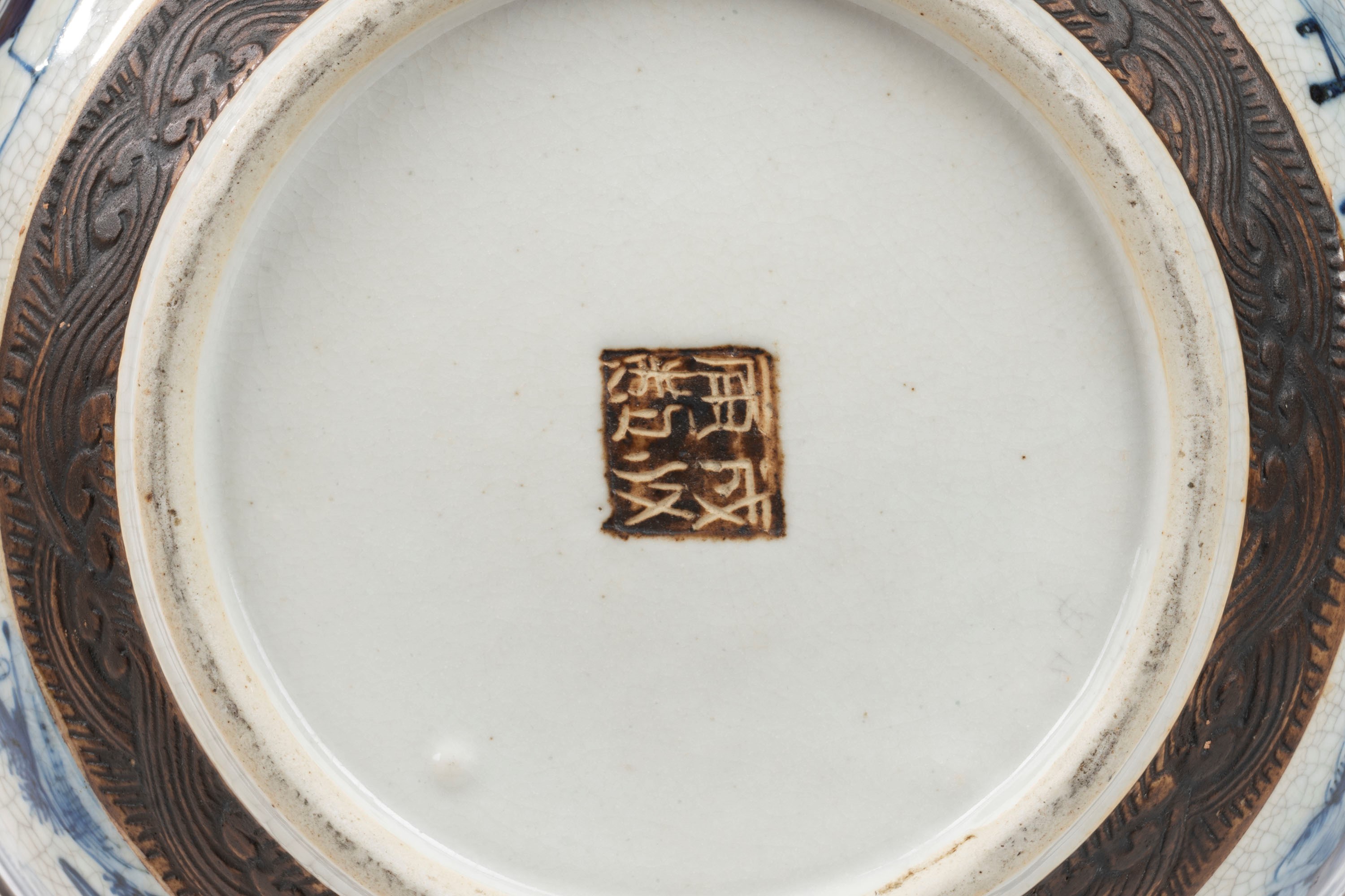 Blue and white porcelain basin with relief band decorations, China, Qing dynasty, late 19th century