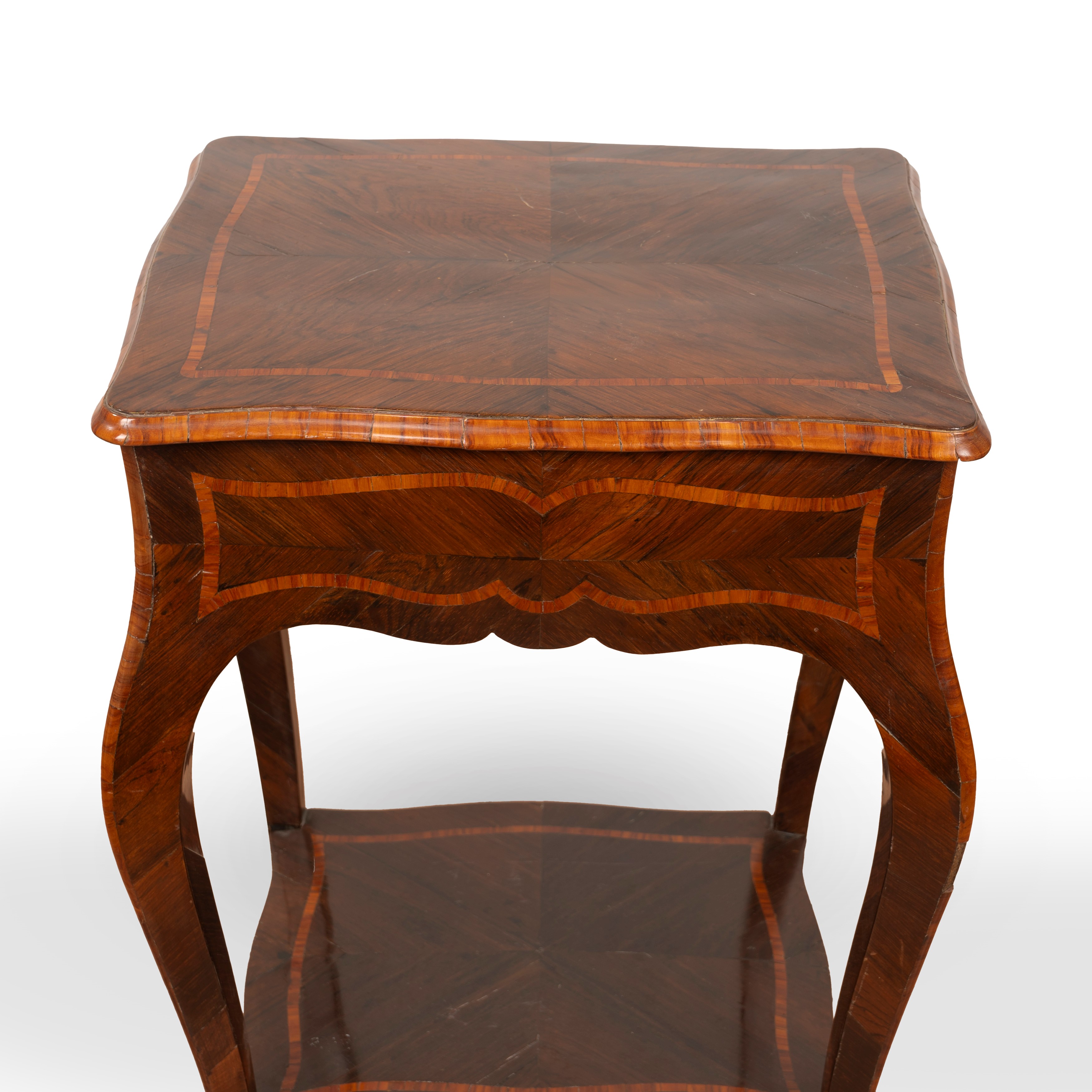 slabed and inlaid in various woods, with gilded bronze feet, and connecting surface between the legs