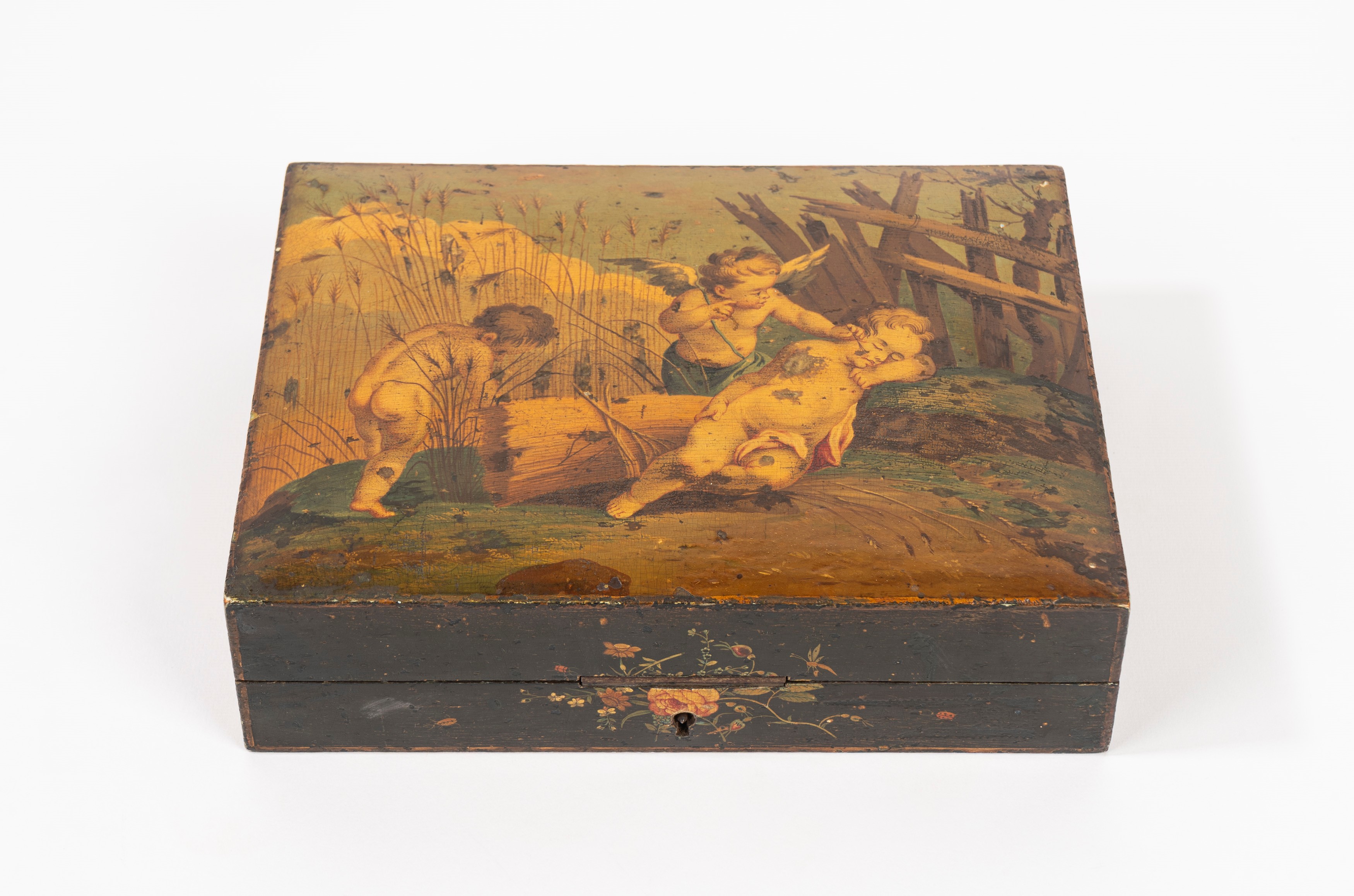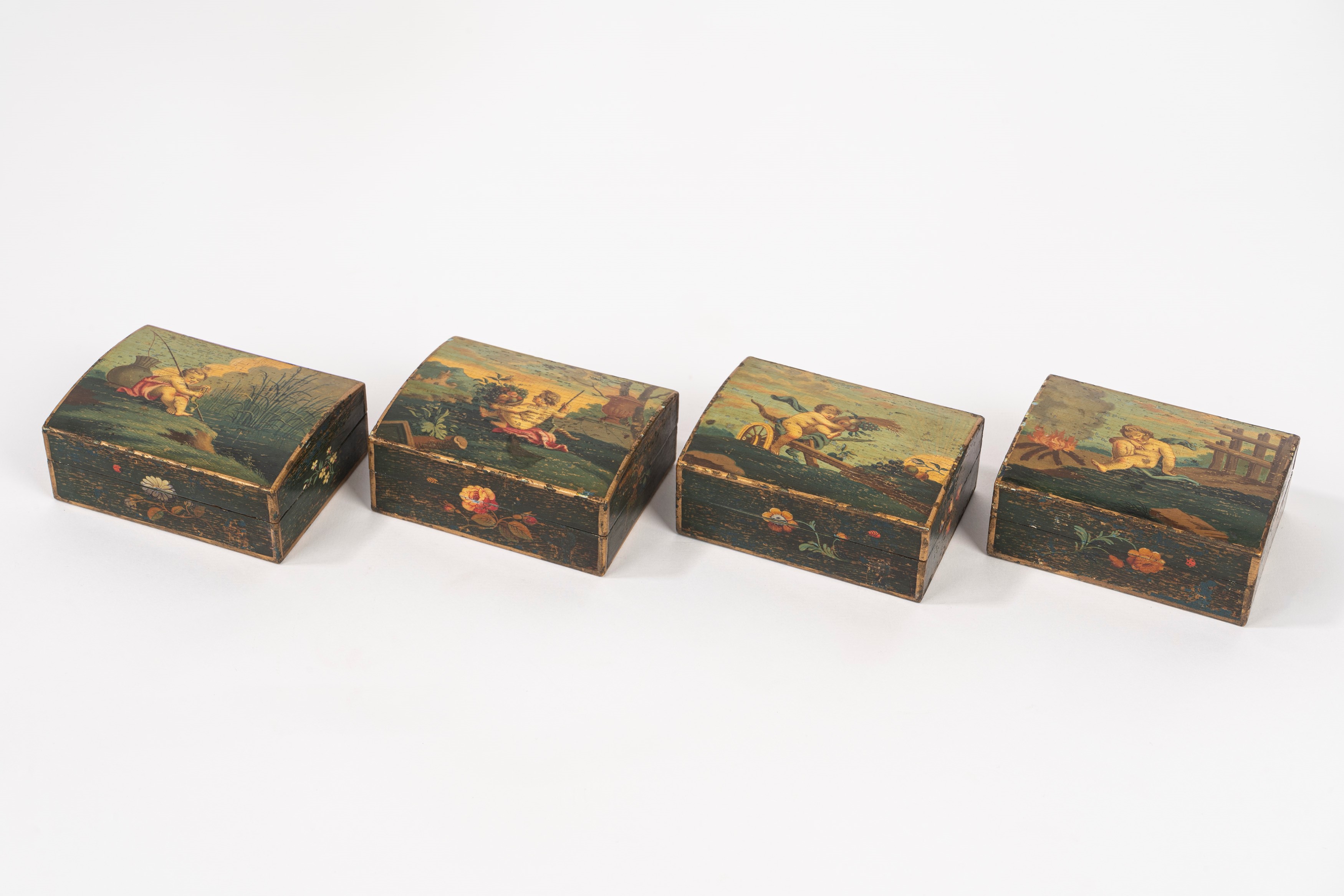 depicting cherub games on the lid; with four smaller boxes inside containing mother-of-pearl gaming chips, depicting allegories of the four seasons on the lid