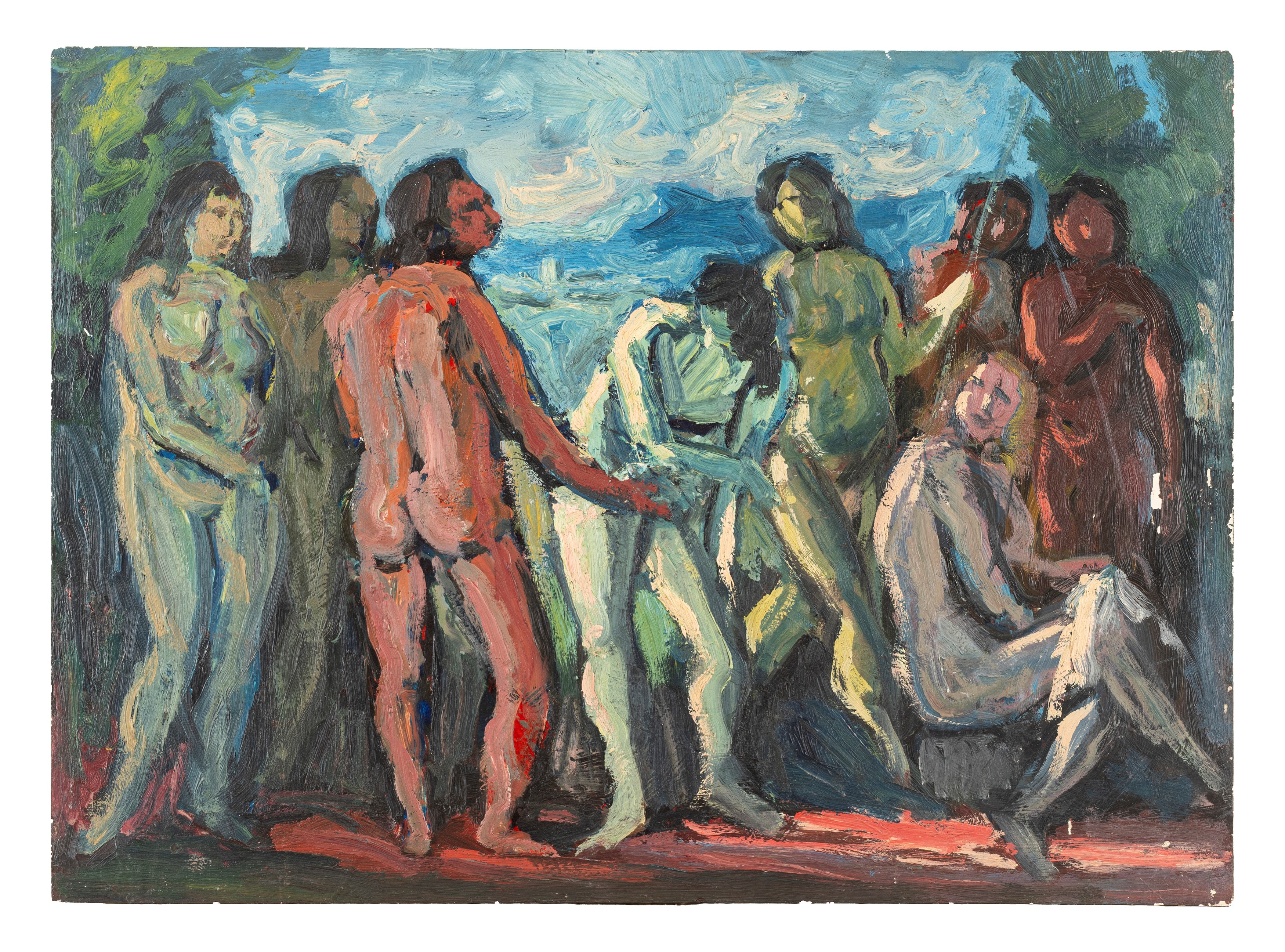 the largest depicts nudes in a landscape; the smallest depicts mourners at the foot of the Cross