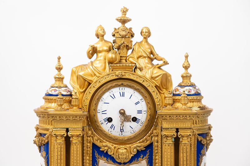 a double pair of gilded bronze columns and Sèvres porcelain plaques decorated with floral motifs, birds, scenes and cherubs; on the top two female figures allegories of Astronomy and History