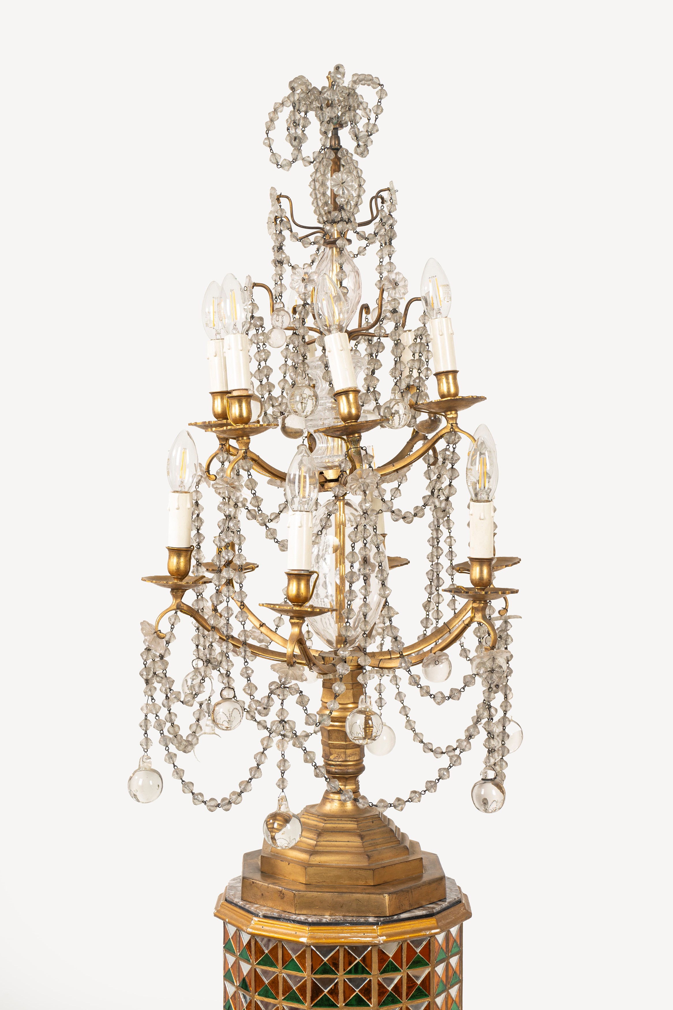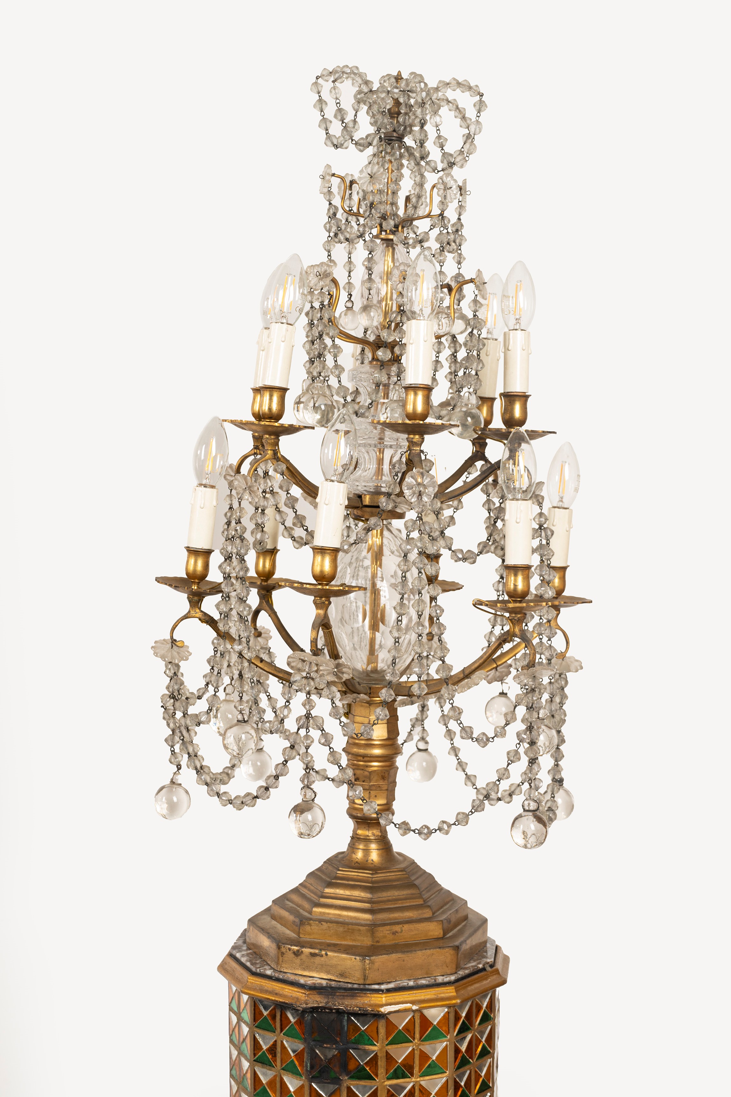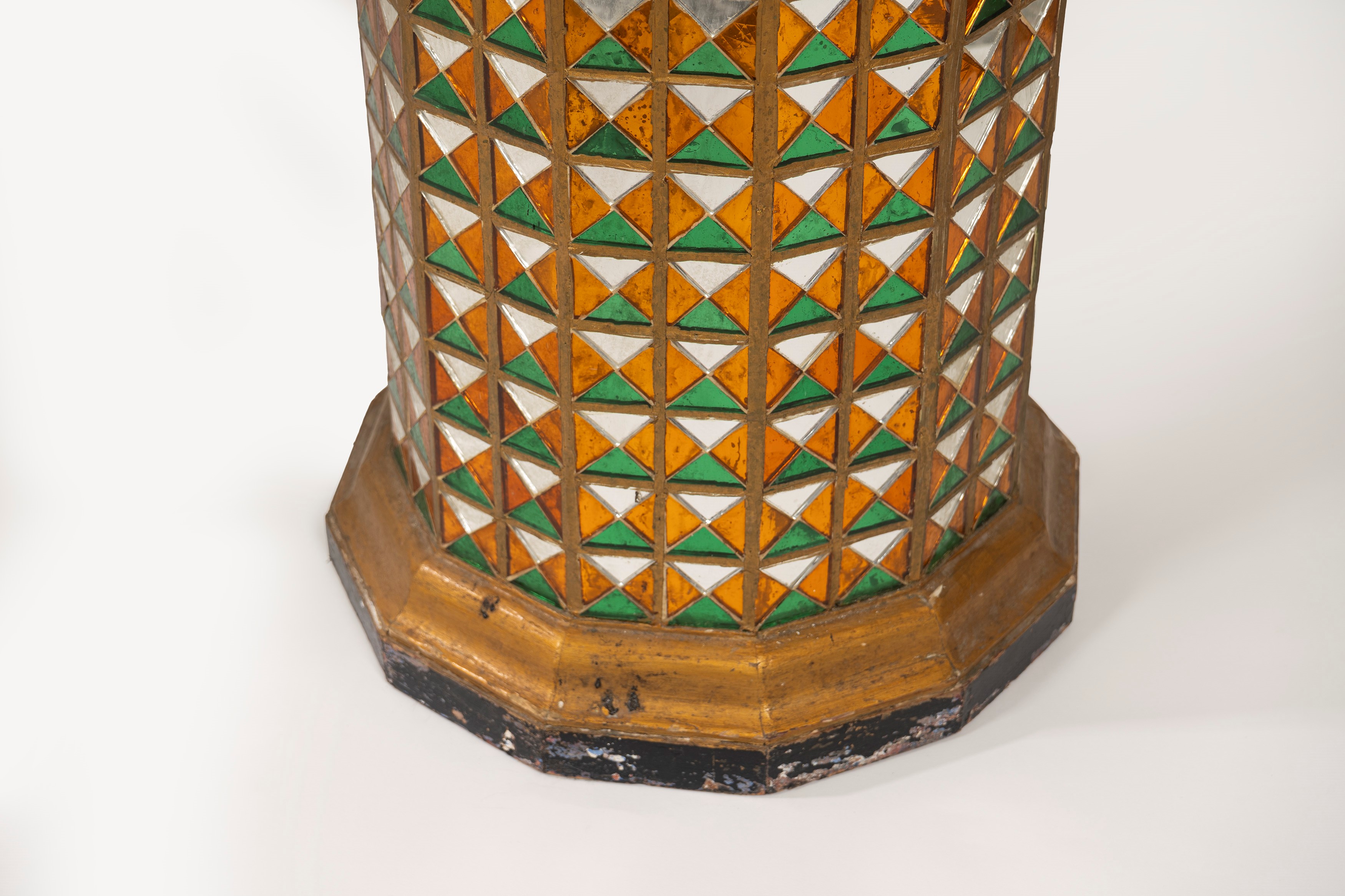resting on non-coeval columns covered with mosaics of colored mirrors and with a twelve-sided marble top