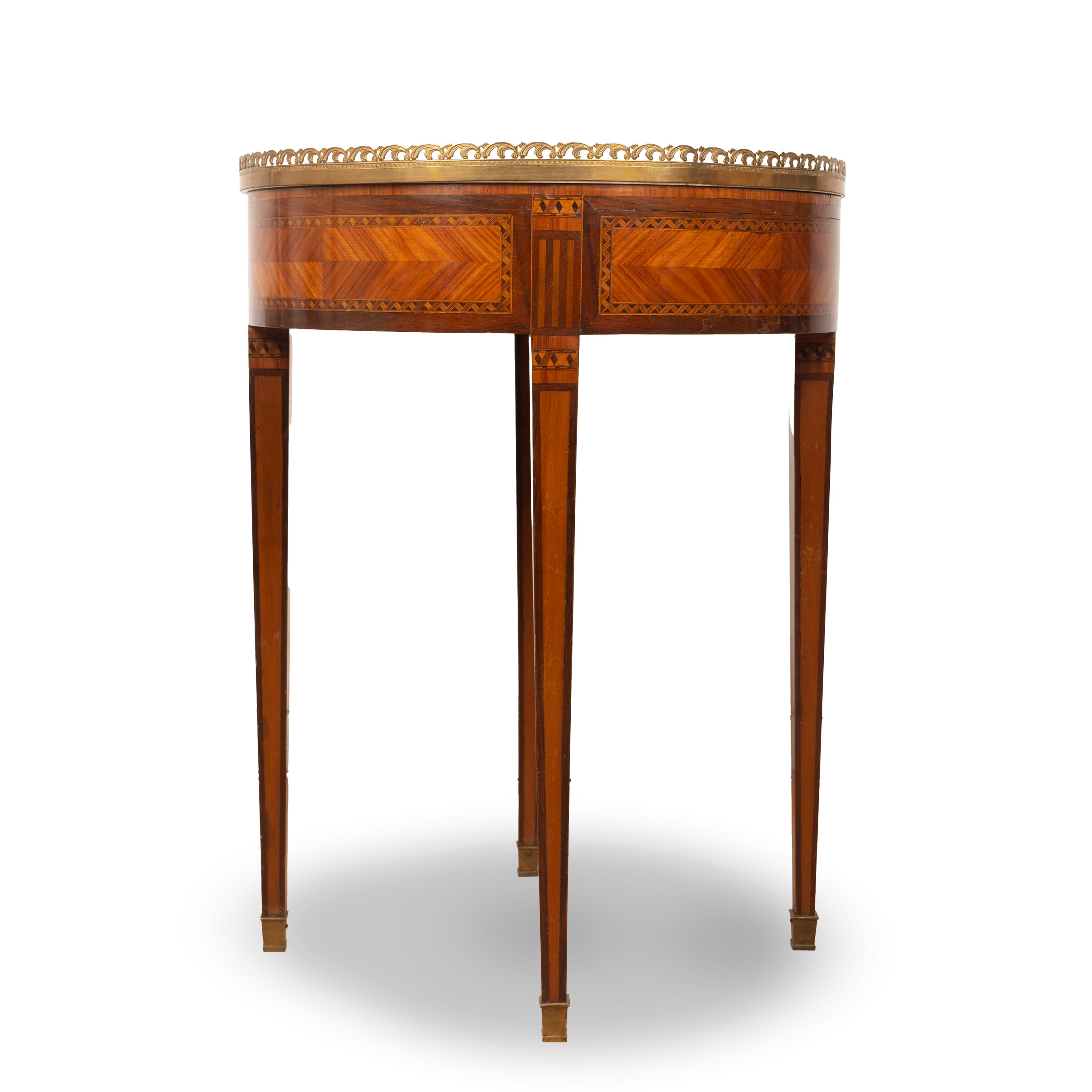 in inlaid wood, with marble top and gilded bronze railing