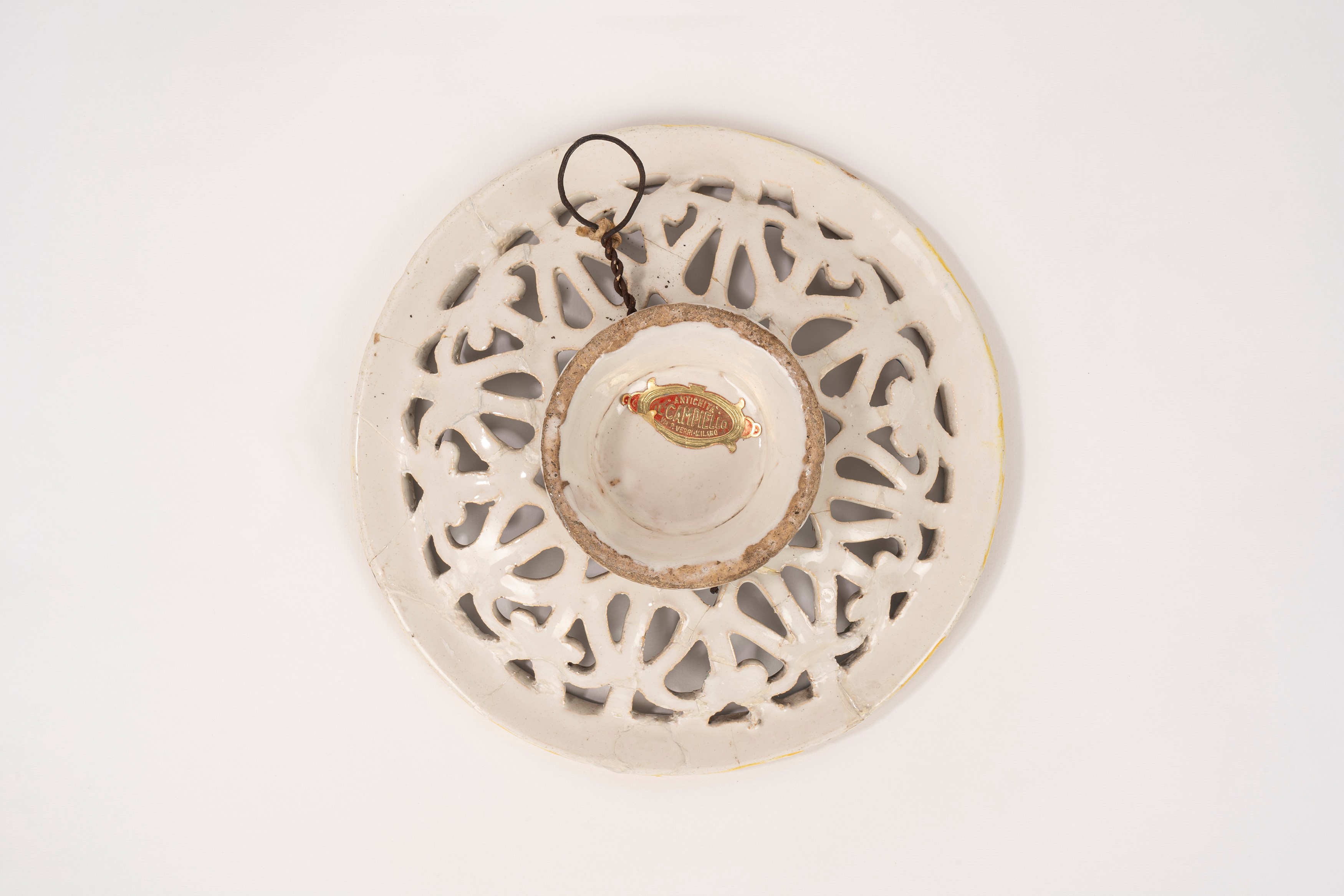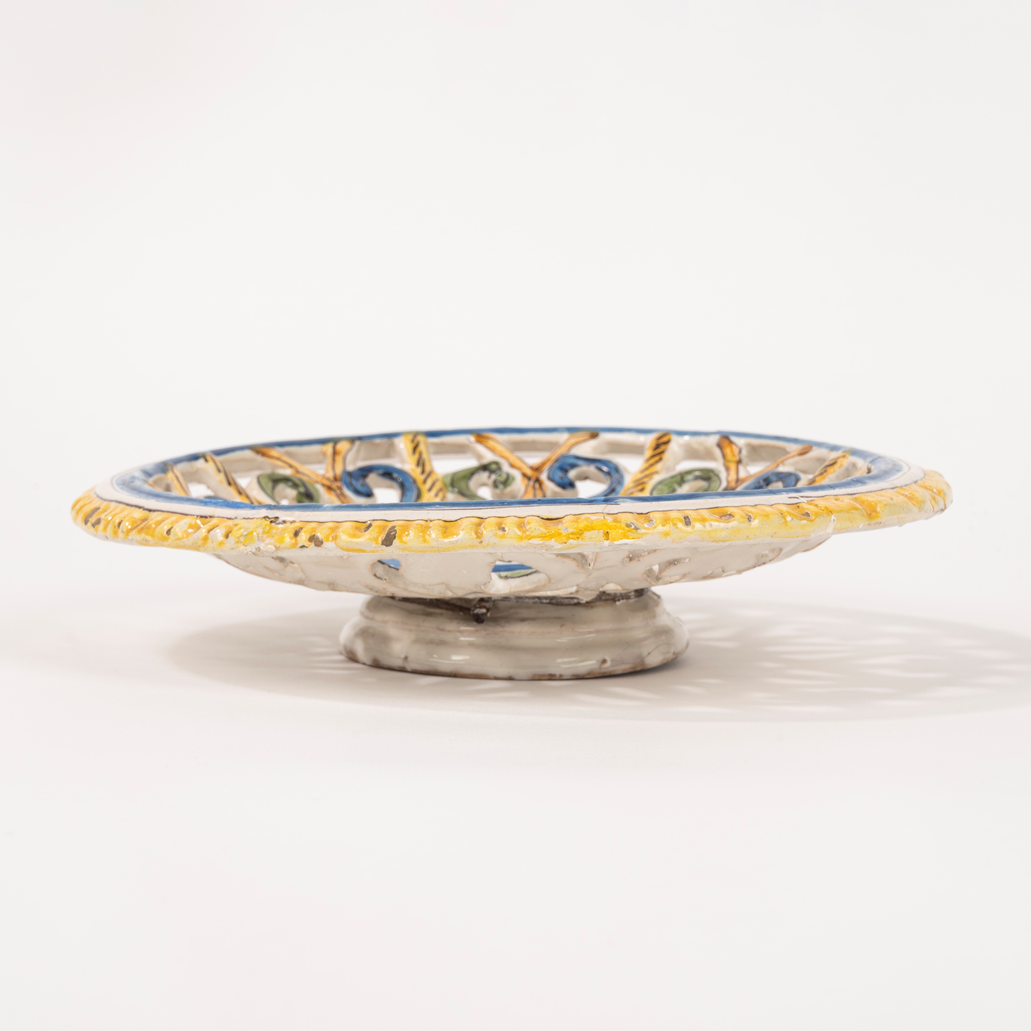 Round perforated crespina in polychrome majolica, Savona, 17th century