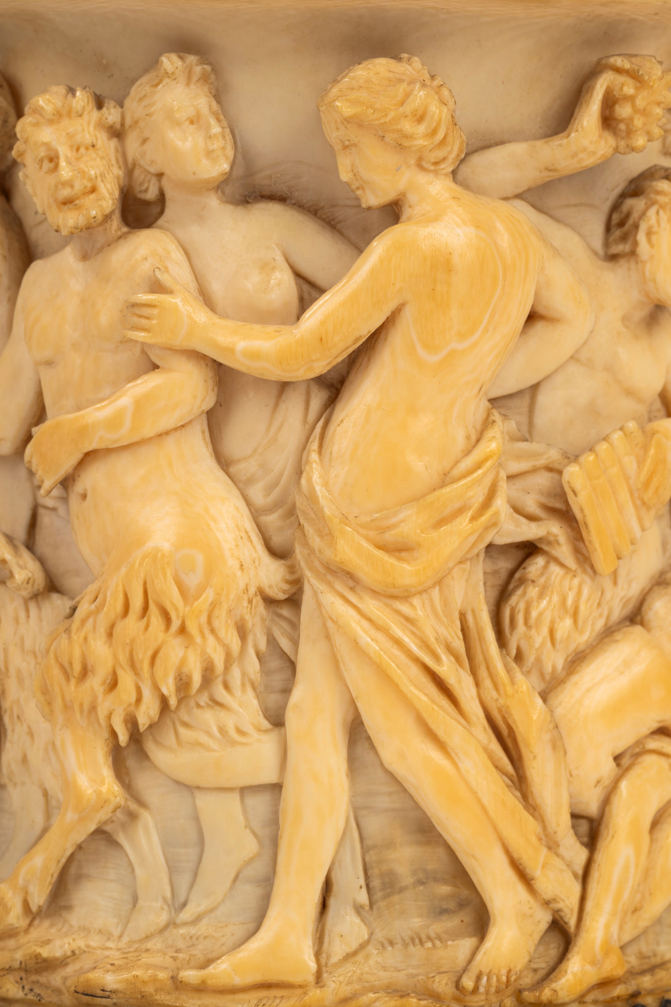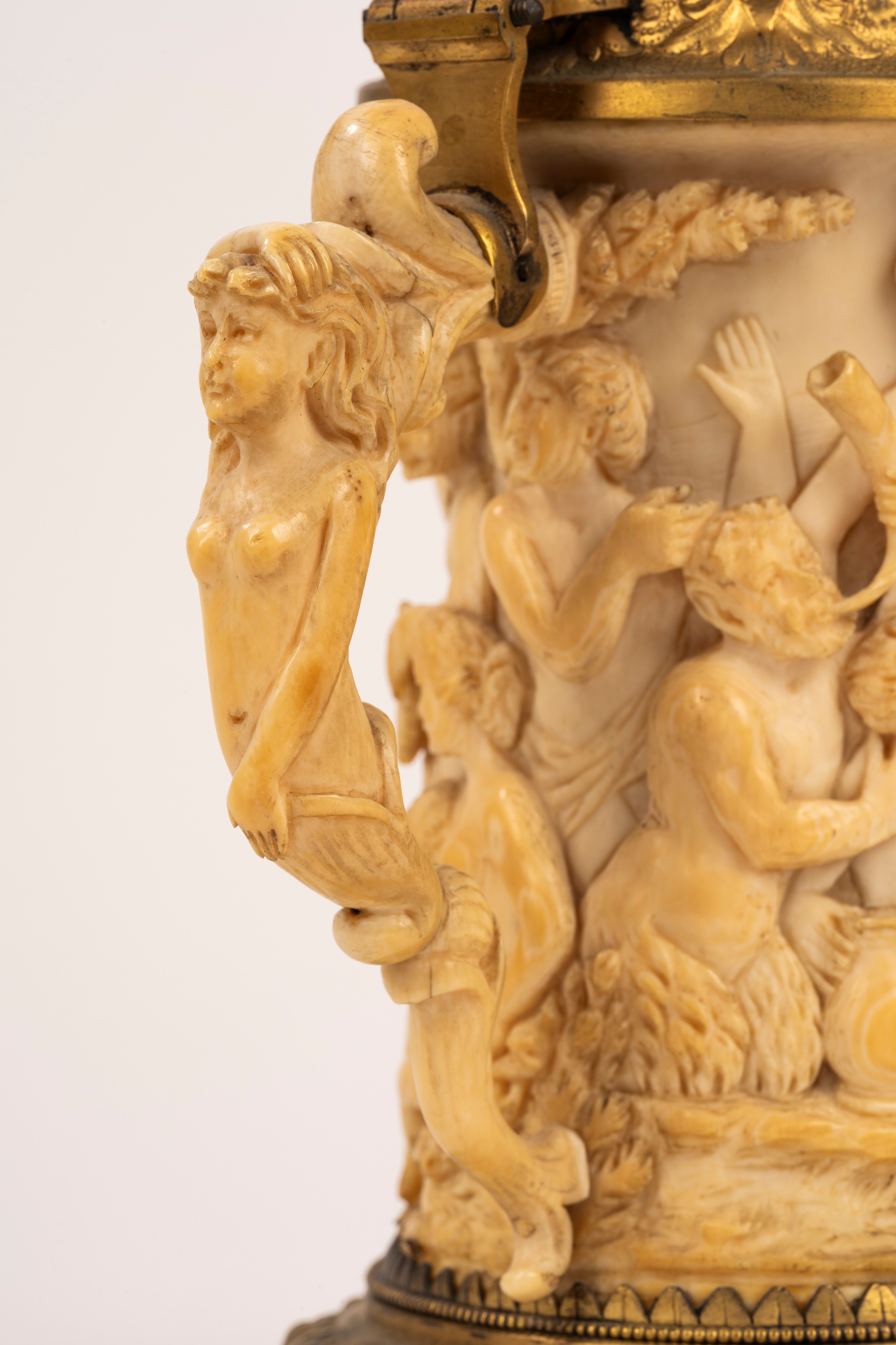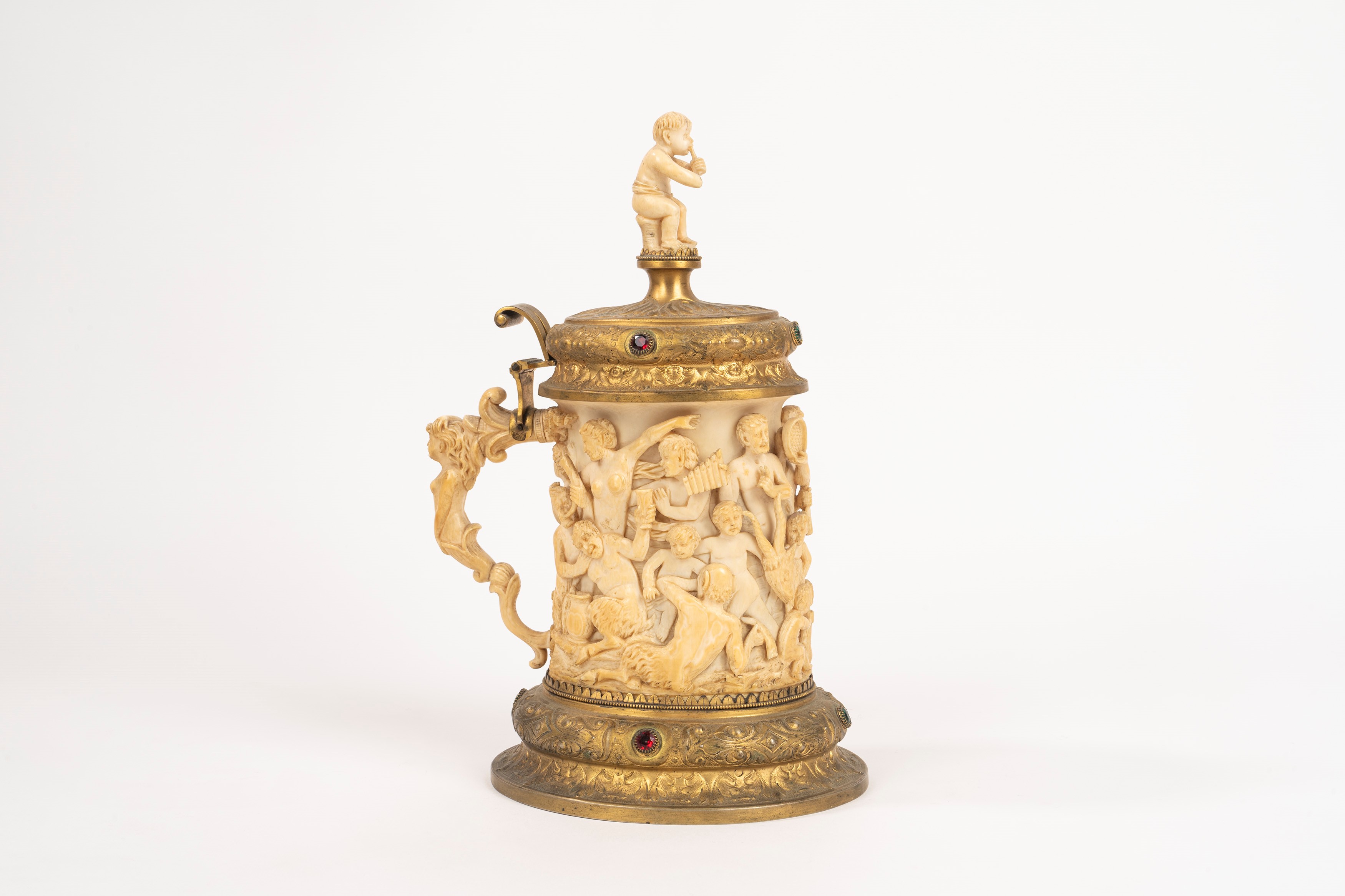 finely carved on the body with Bacchanal scene; handle in the shape of a mermaid and grip with a putto playing the flute.