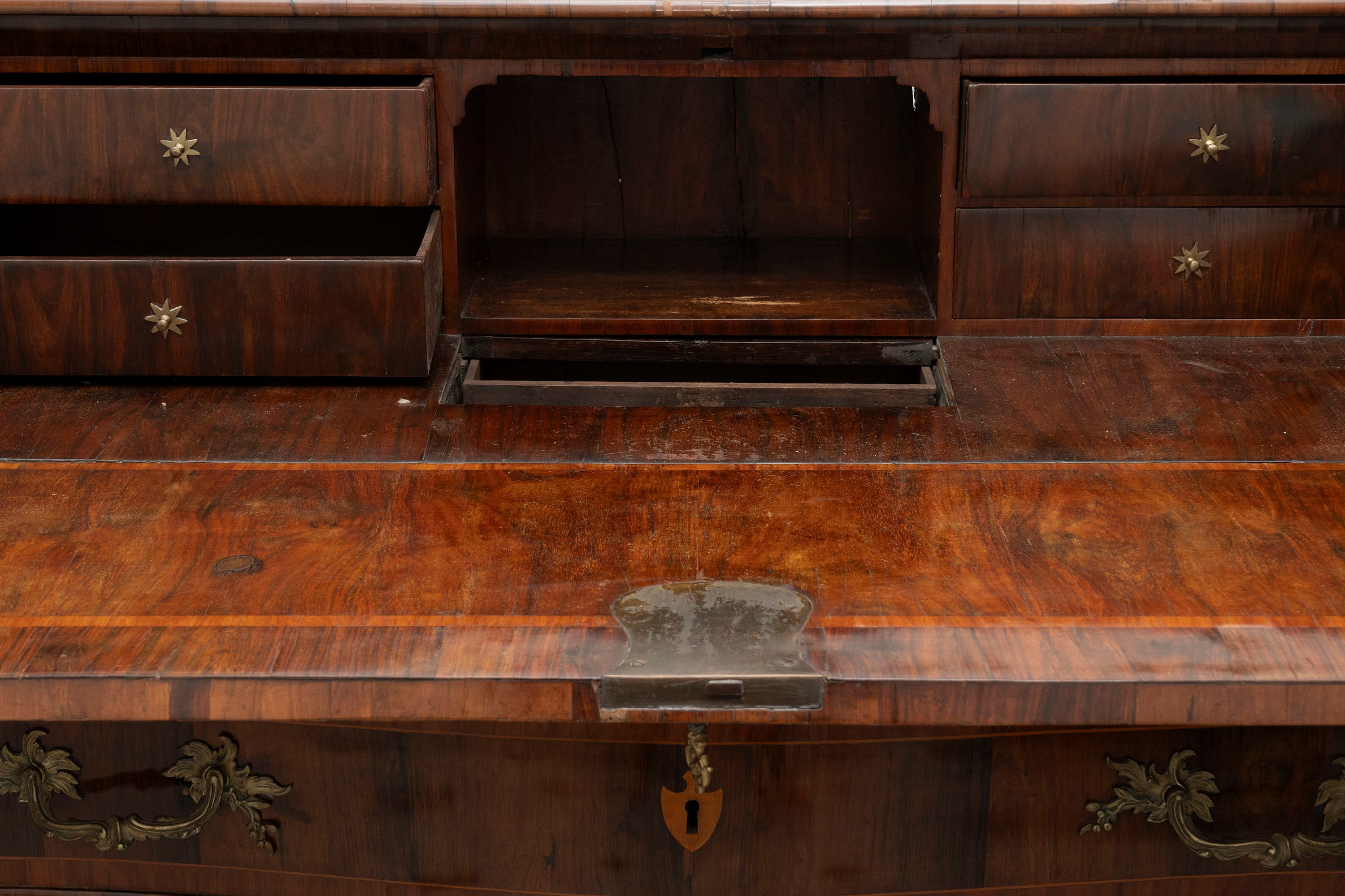 with three front drawers, flap top with cabinet inside with 4 drawers and a secret, wavy sides, glass-fronted upper part with two doors and mixtilinear frieze on the top