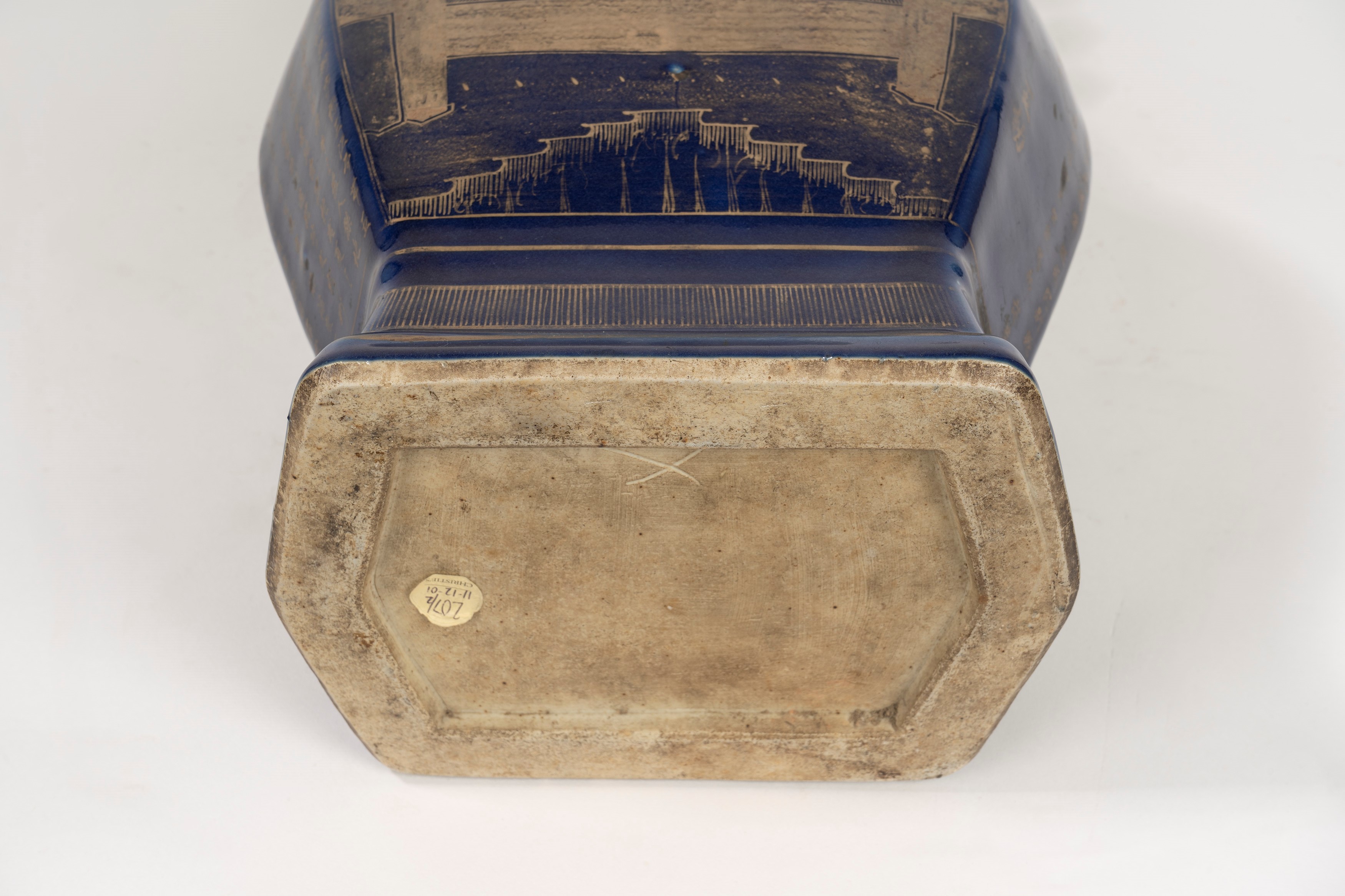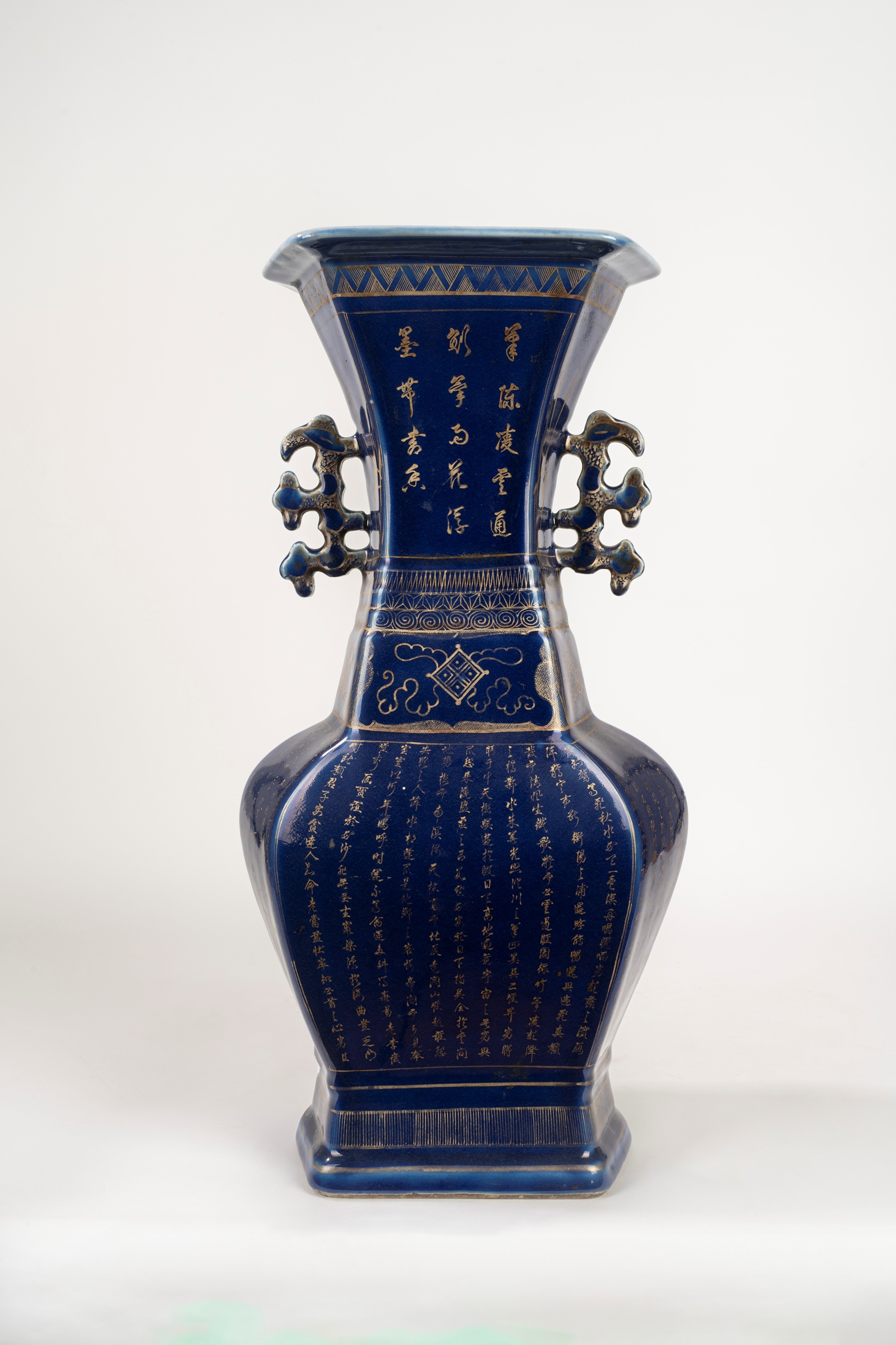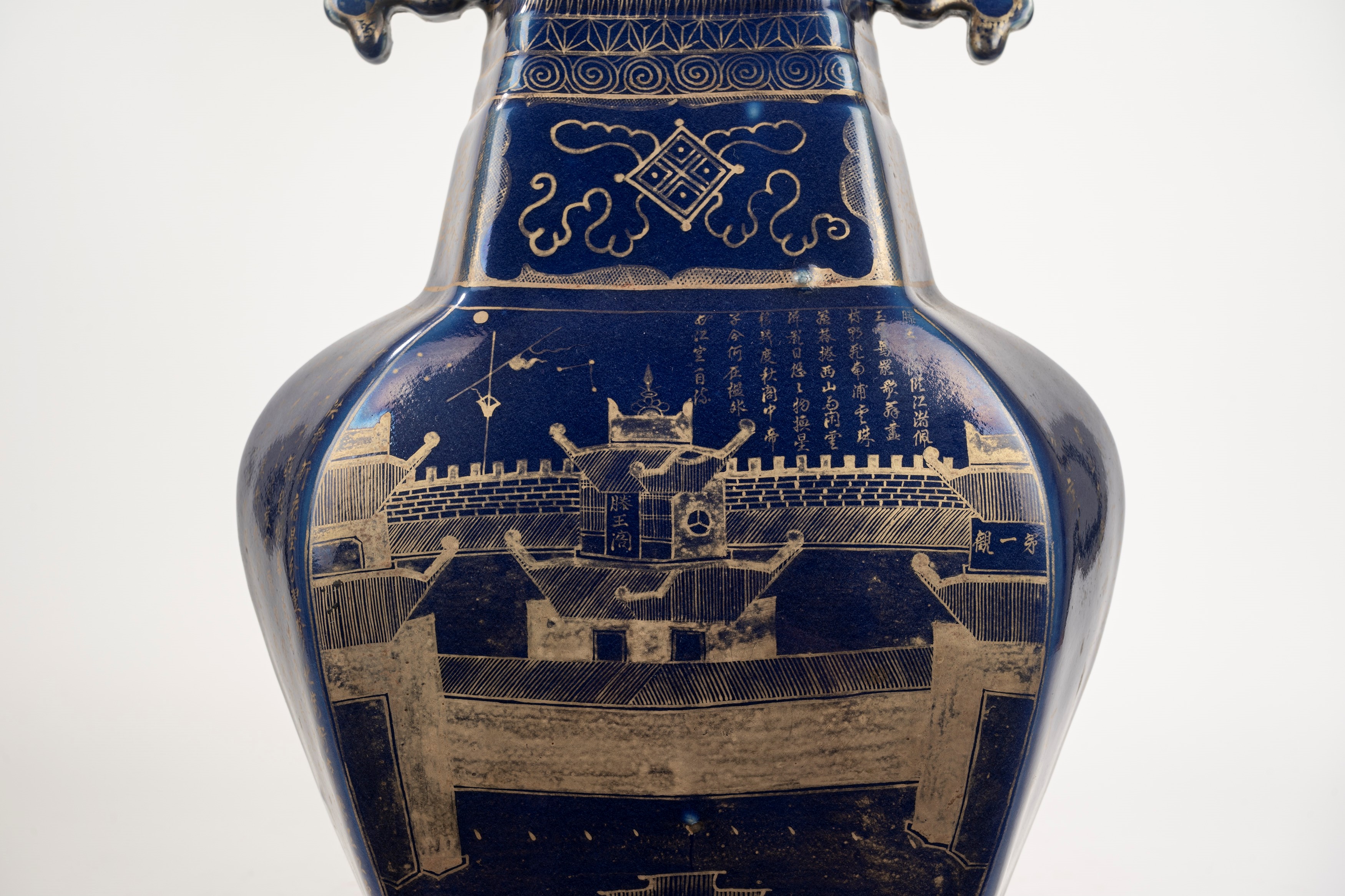 Blue porcelain lamp-mounted double-handed vase with gold decorations, China, Qing dynasty