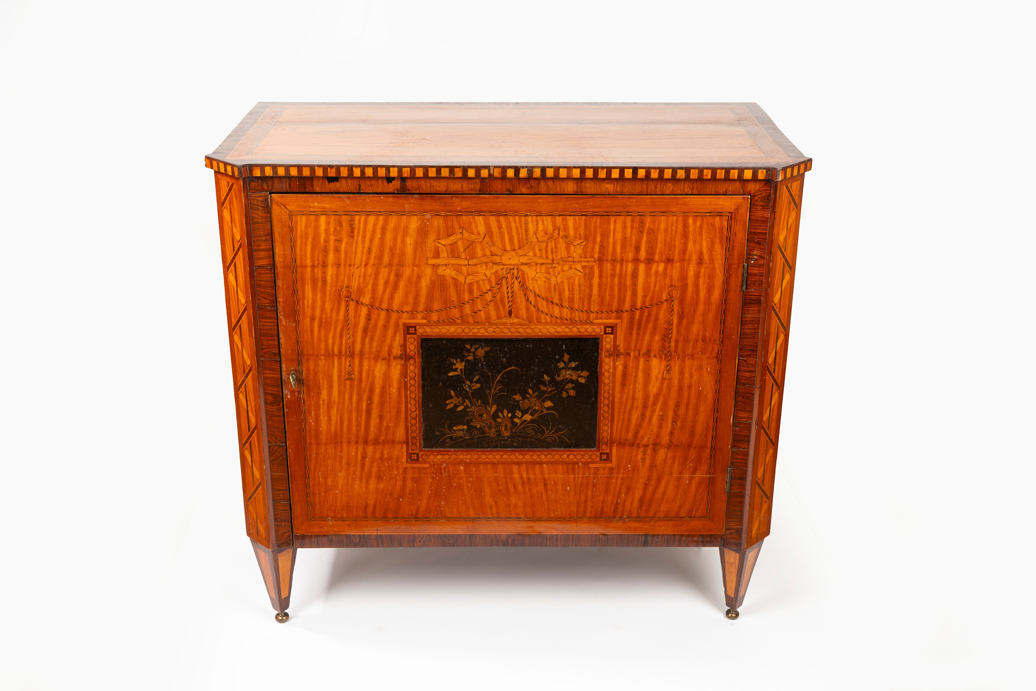 veneered in satinwood, rosewood and other precious woods, the front with a single door centered by a lacquered panel and concealing shelves, rounded corners, truncated pyramidal feet. Holland, late 18th century/early 19th century