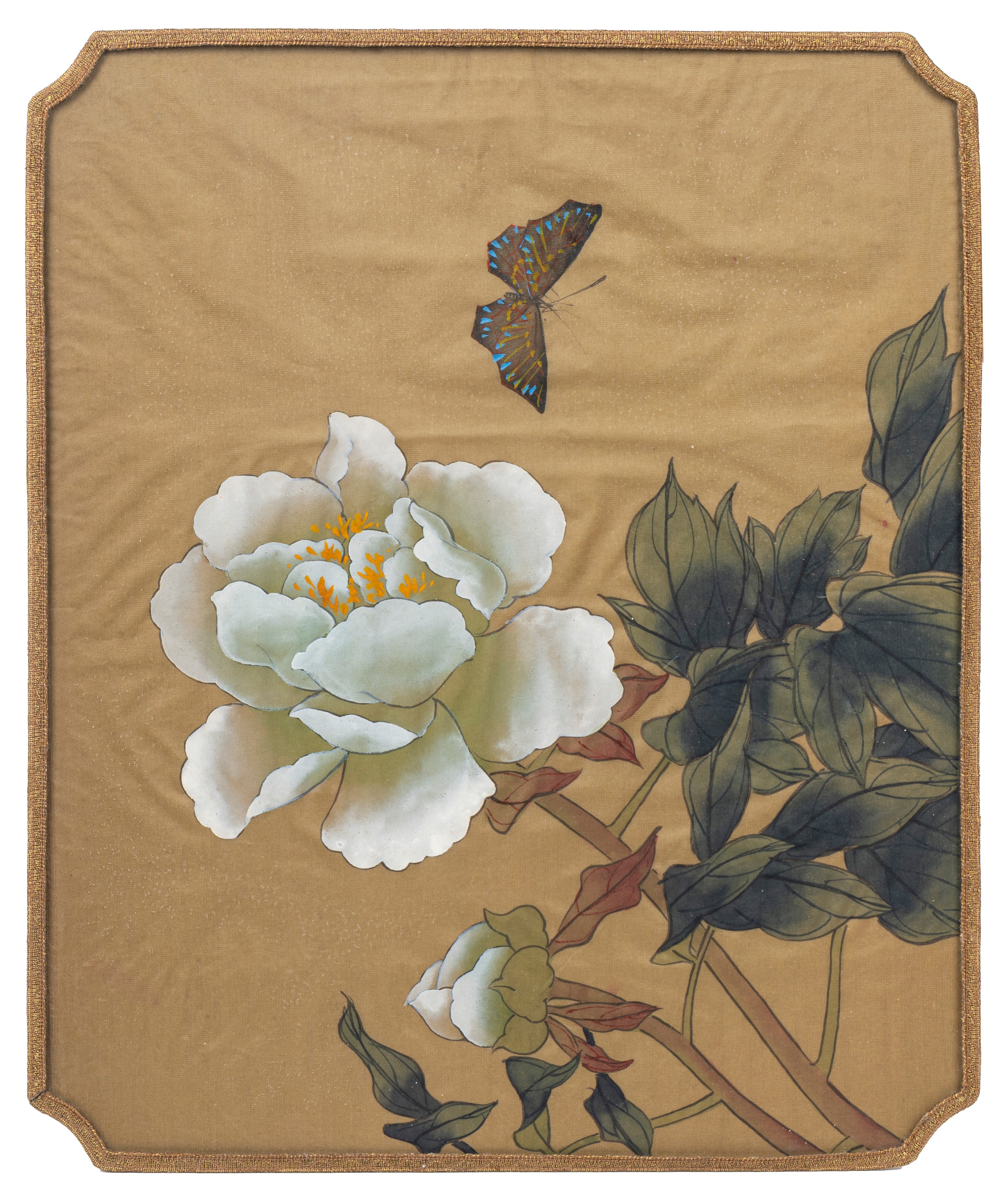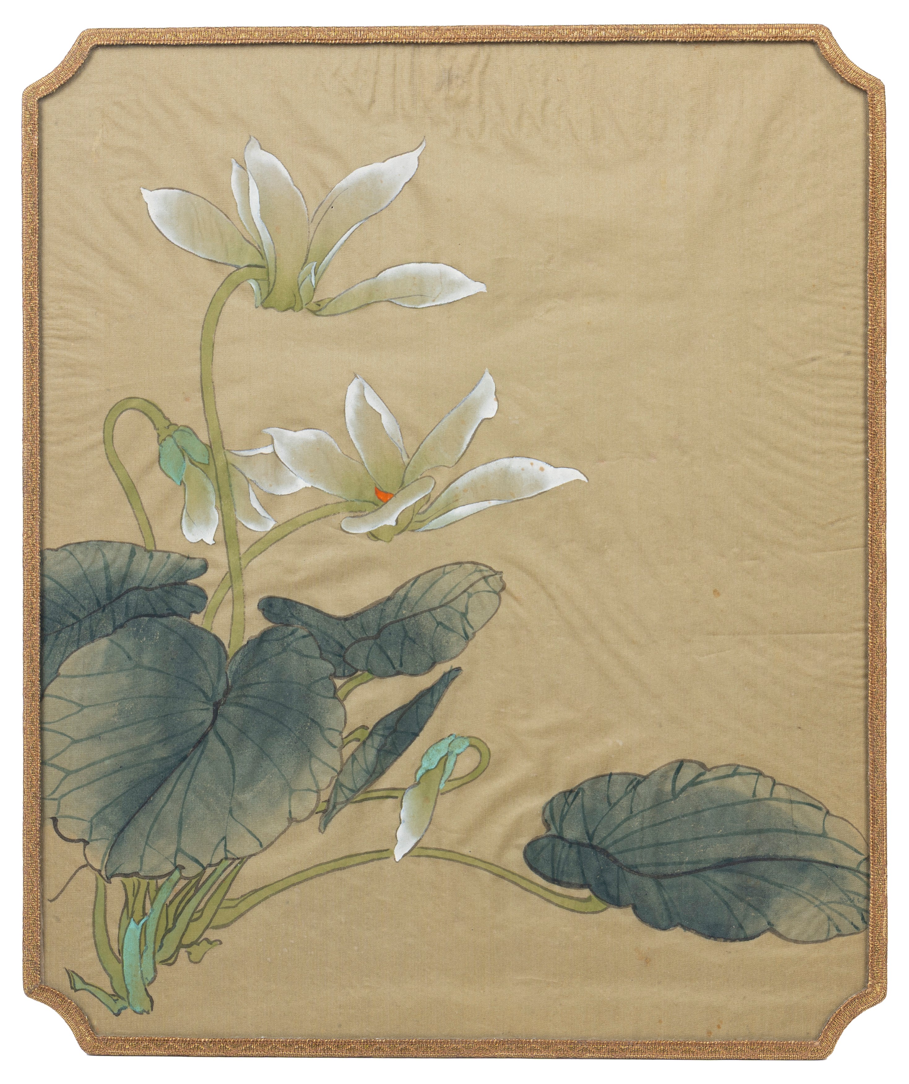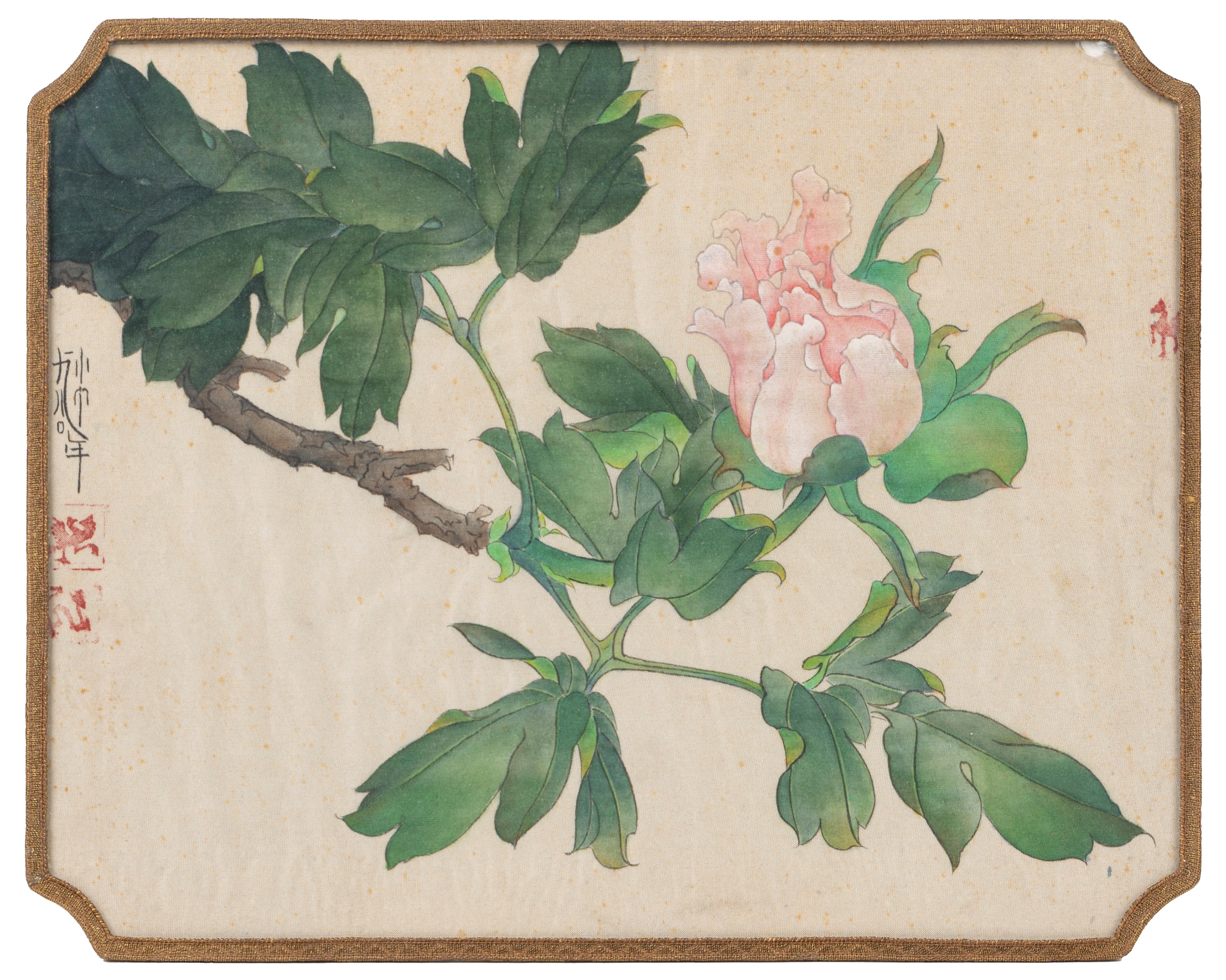 Chinese-style depicting floral motifs, with syllabic kana and seals (in frame)