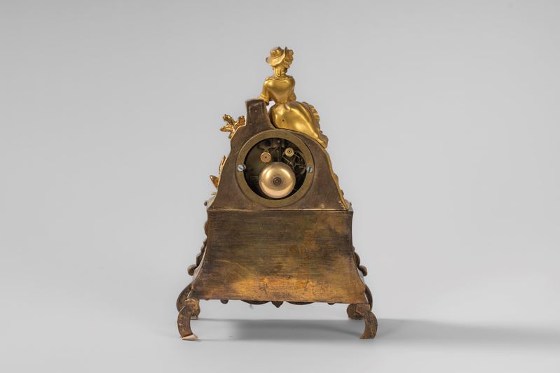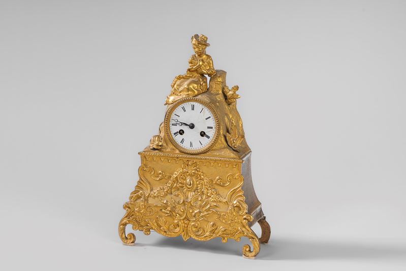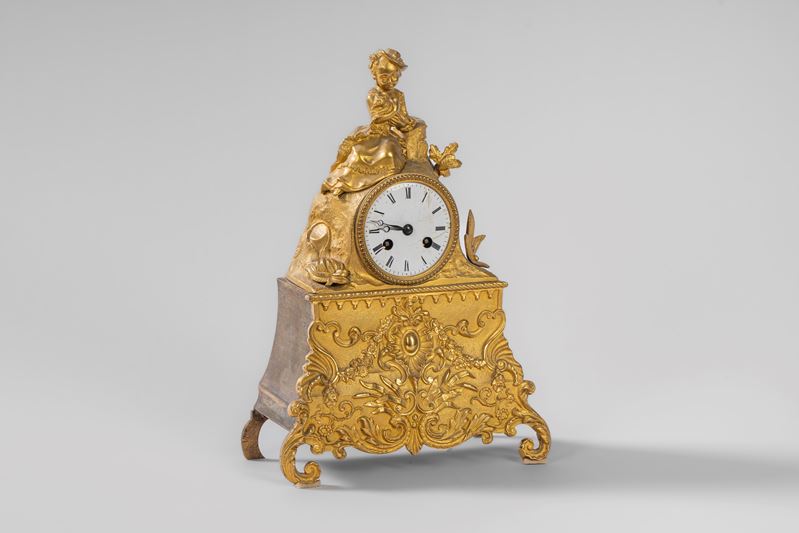 A wavy plinth base decorated with rich relief plant and floral motifs, with volute front feet. Topped by a rock with natural elements, it houses the white enamel dial with Roman numerals; a two-train movement with a bell strike. At the top, a young girl with a hat and a small dog.