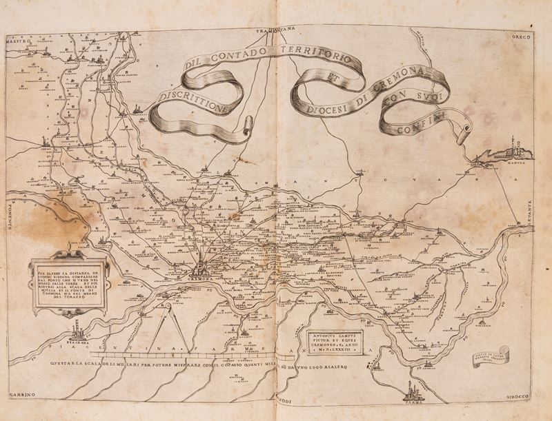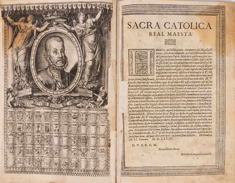 Cremona, in the house of the same author, 1585. In folio. 5 figures in two plates outside the text with the main buildings of the city and 1 map with the Discrittione dil contado territorio et diocesi di Cremona engraved in copper outside the text, allegorical frontispiece, on the verso portrait of Philip II in oval without cap, Apotheosis of the city of Cremona on folio +2v, portrait of the author on folio +4r, vignette depicting the exit of the Carrocium from the city on page 13, and 33 oval portraits (plus one left blank) of illustrious figures, all intaglio, woodcut frame framing the pages of text and many splendid figured initials engraved in wood. The large map of Cremona is missing, restorations, reinforcements, burnishing, and damp stains. 18th century half-leather and cardboard binding.