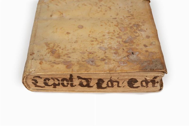 Venice, [at the fountain sign], 1550. In 4°. Printer's device on the title page, engraved initials, some light foxing and damp stains, contemporary parchment binding, handwritten title on the spine and lower edge, traces of binding, stains, minor defects, slightly loose.