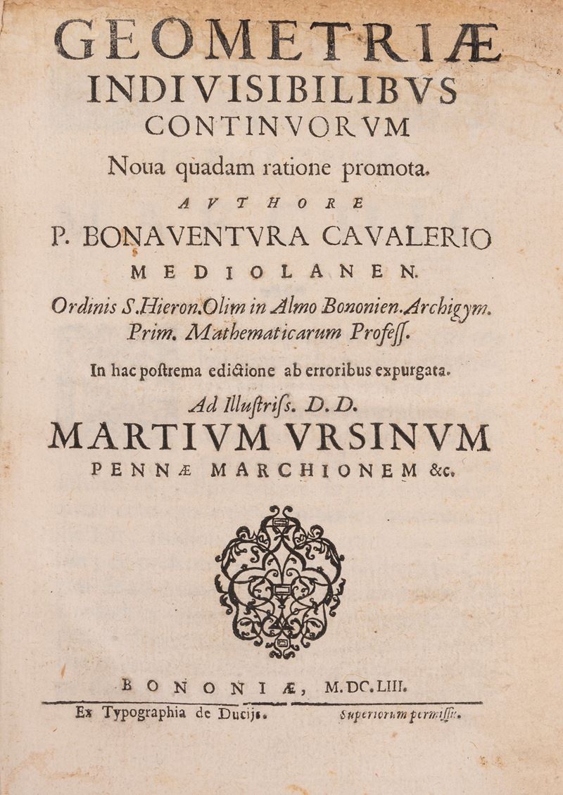 This is a particularly rare second edition of the work in which the mathematician Bonaventura Cavalieri (1589-1647) first presented his concept of "indivisibles," infinitesimal geometric elements. This text represented a true revolution for the discipline and laid the foundations for the theory of infinitesimal calculus.