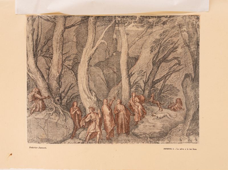 Milan, Treves, 1908. 2°. 430 x 315 mm. 66 color plates, mounted on heavy watermarked paper, reproducing illustrations by Federico Zuccari. Color title page. Unedited copy, with numerous illustrations interspersed throughout the text. Hardback binding.