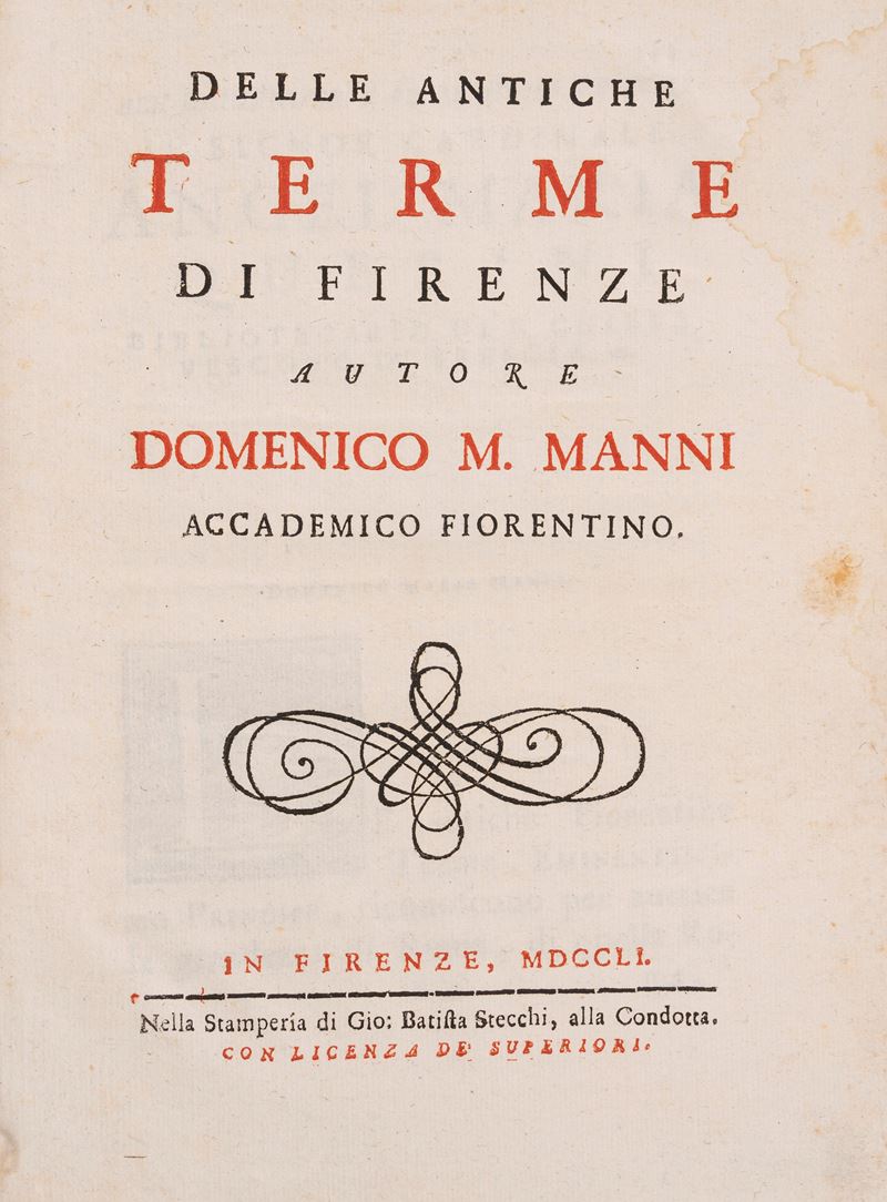 Florence, in the printing house of Gio Batista Stecchi, alla Condotta, 1751. In 4°. Title page in red and black with typographical decoration, woodcut initials and headpieces with two leaves of folded plates, illustrations in the text, partially detached A2-3 paper, slight foxing, light water staining on the outer margin of the last leaves, contemporary cardboard binding, handwritten title on the spine, some losses on the spine and defects.