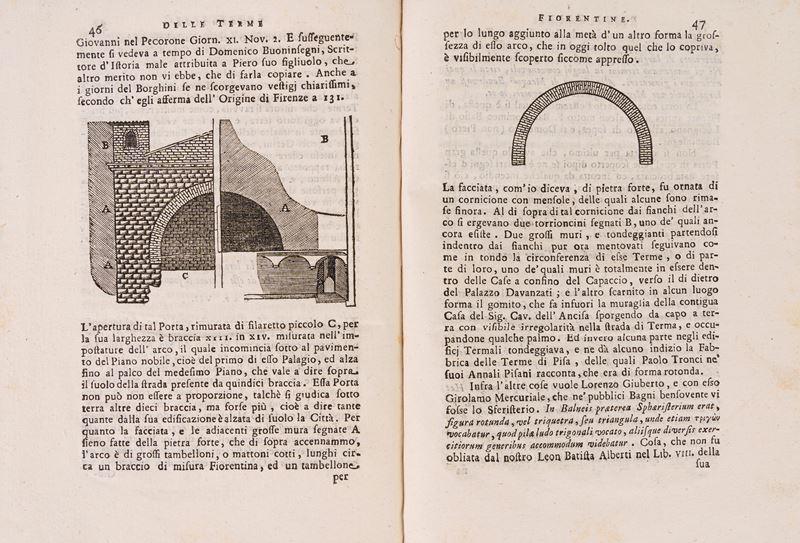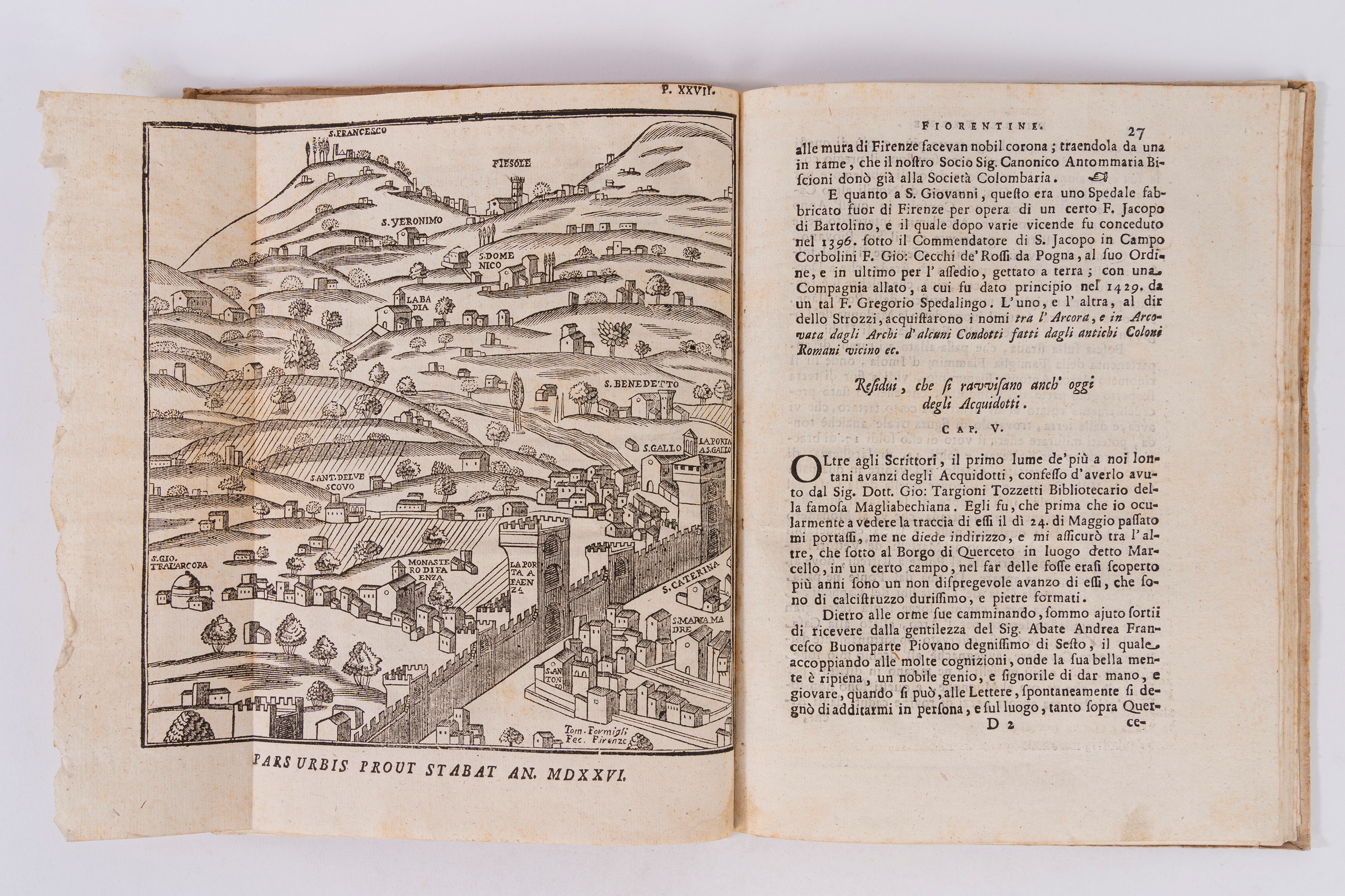 Original edition with two beautiful folded plates, containing a topographical map of Florence in 1526 and an ancient aqueduct.