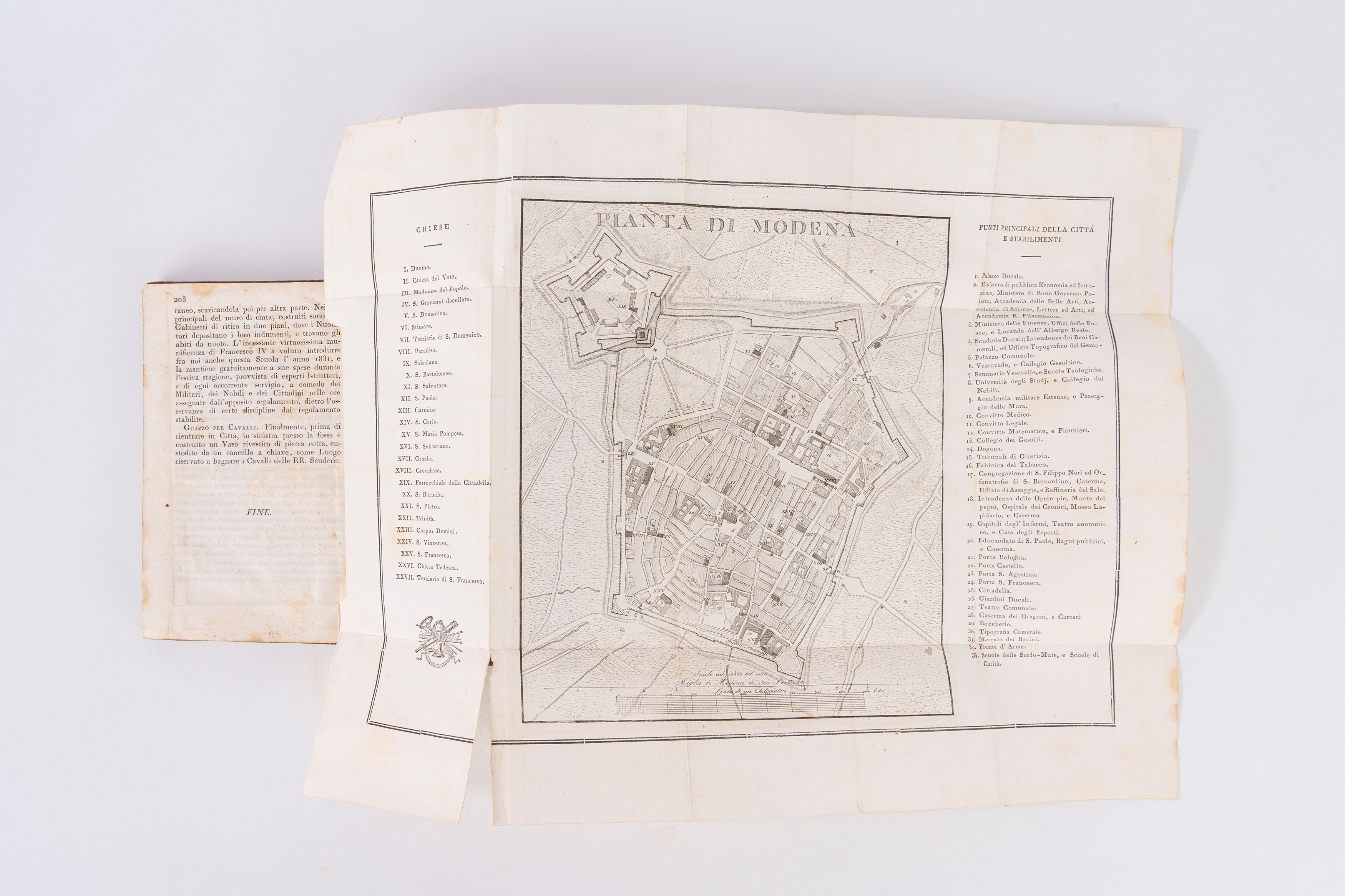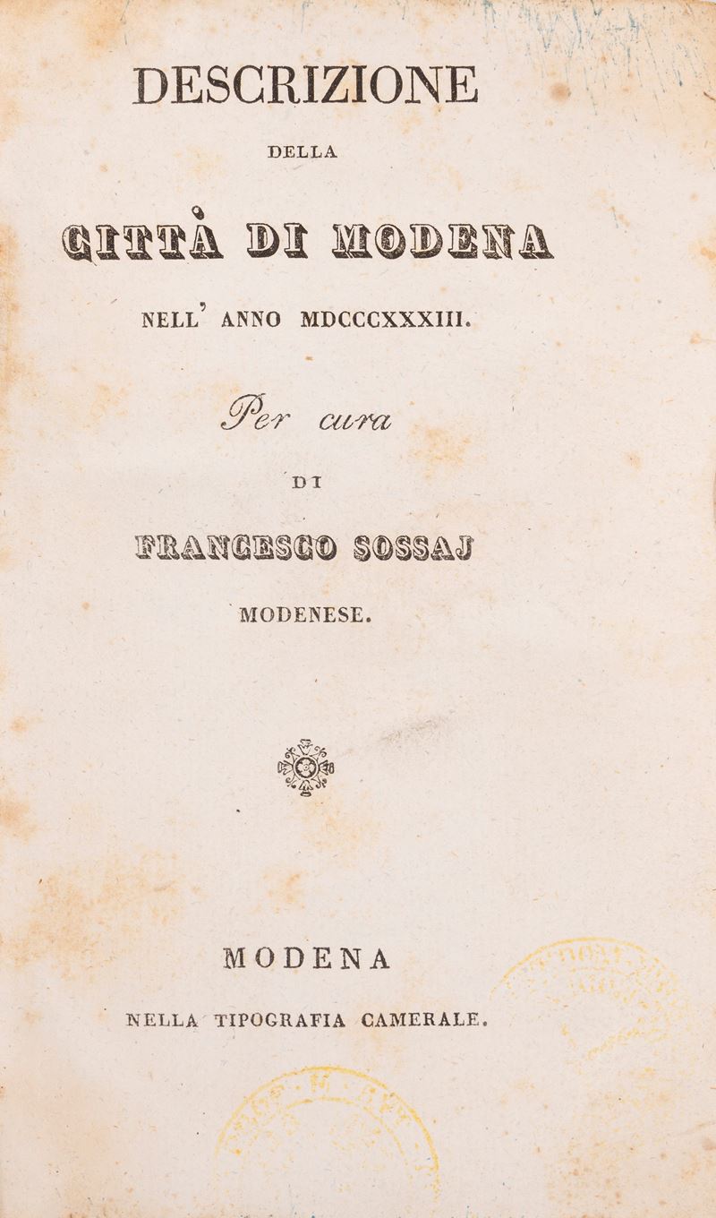 Modena, Tipografia camerale, 1833. 16°. With a large map of Modena at the end of the volume, foxing, contemporary half-leather and marbled paper binding, gilded embellishments on the spine, signs of aging. Fading ownership stamps on the title page.