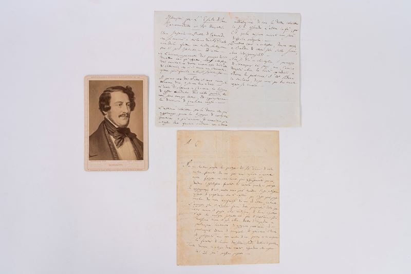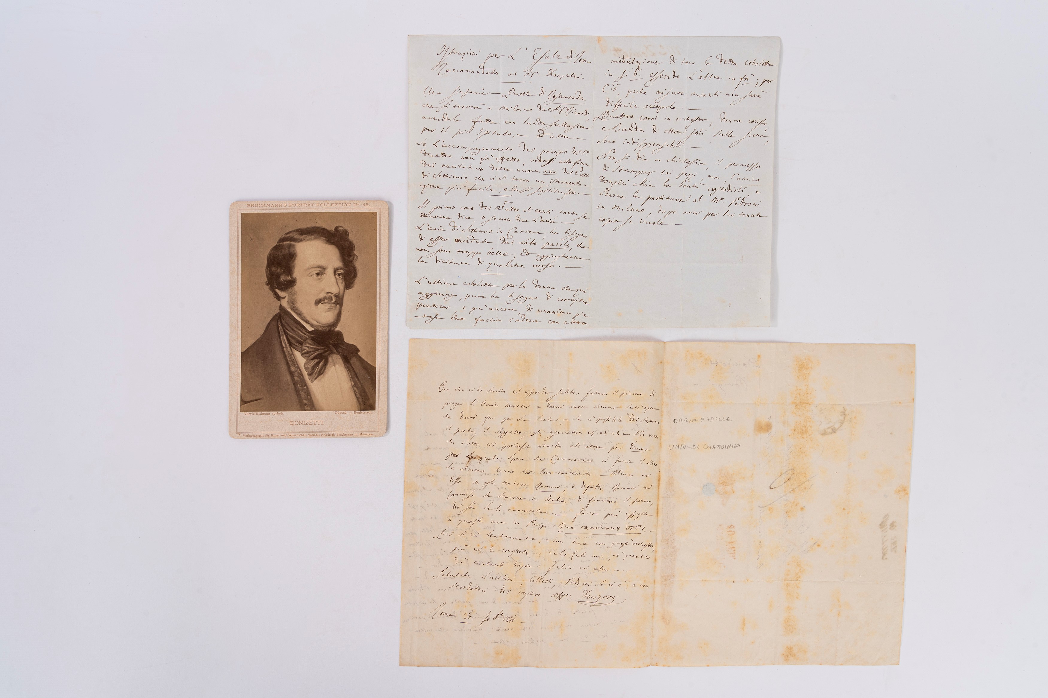 A fine collection of Donizetti memorabilia: a photographic portrait from Bruckmann's Portrait Kollektion , 170 x 112 mm.; a signed autograph letter to Domenico Donzelli, 241 x 185 mm., two pages; another letter with the "Instructions for the Exile of Rome", also addressed to Donzelli, unsigned and undated [but 1840], two pages, 207 x 130 mm.