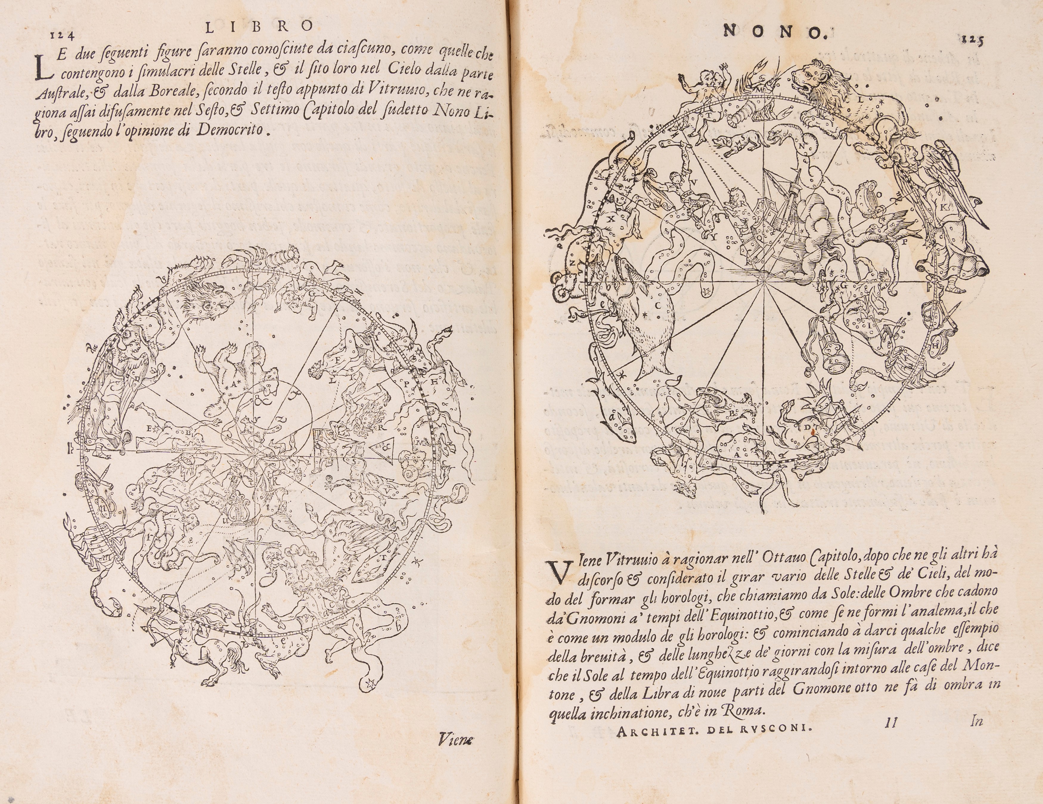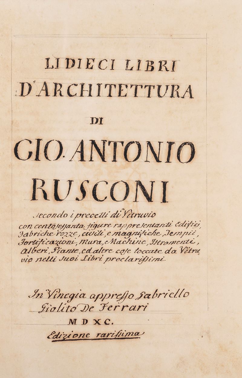 First edition of this Italian translation of Vitruvius's treatise describing construction techniques and materials used in the second half of the sixteenth century. This copy has several missing pages, replaced with elegant drawings.
