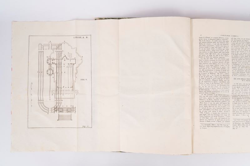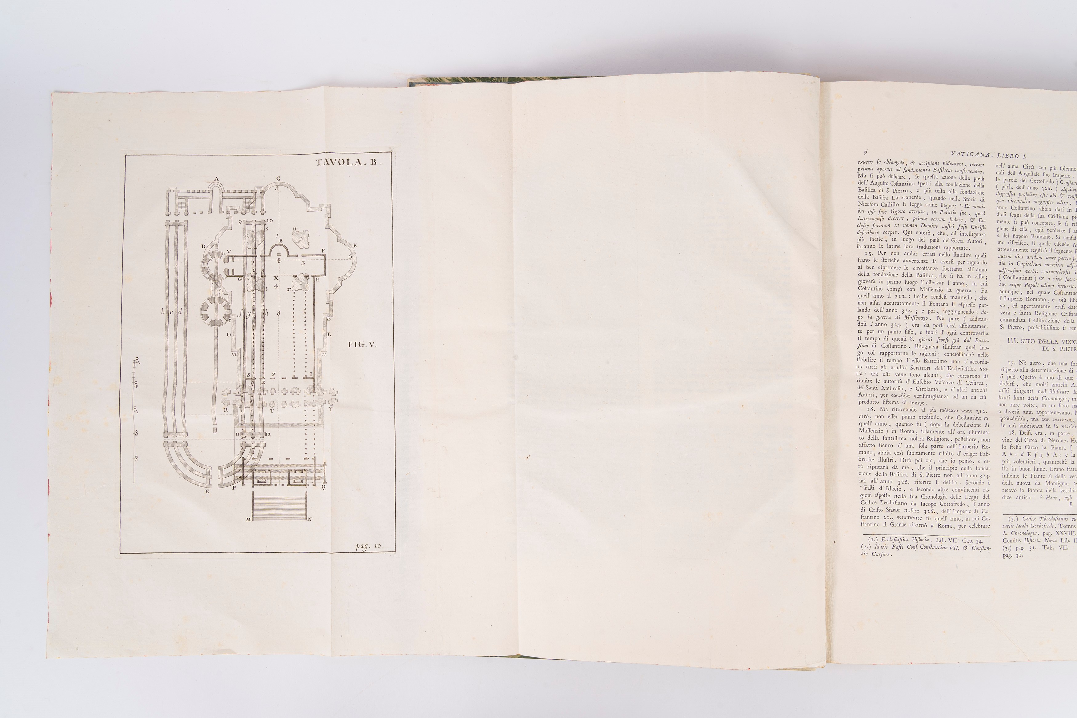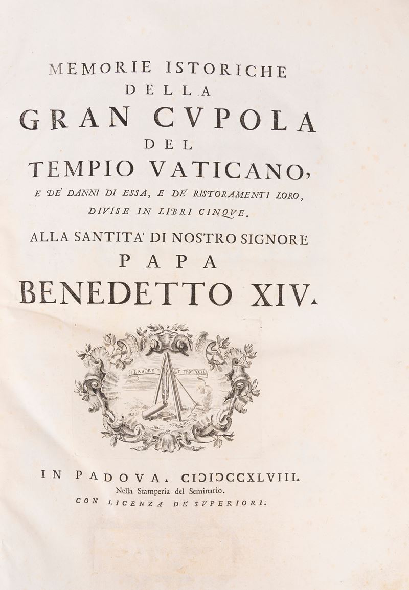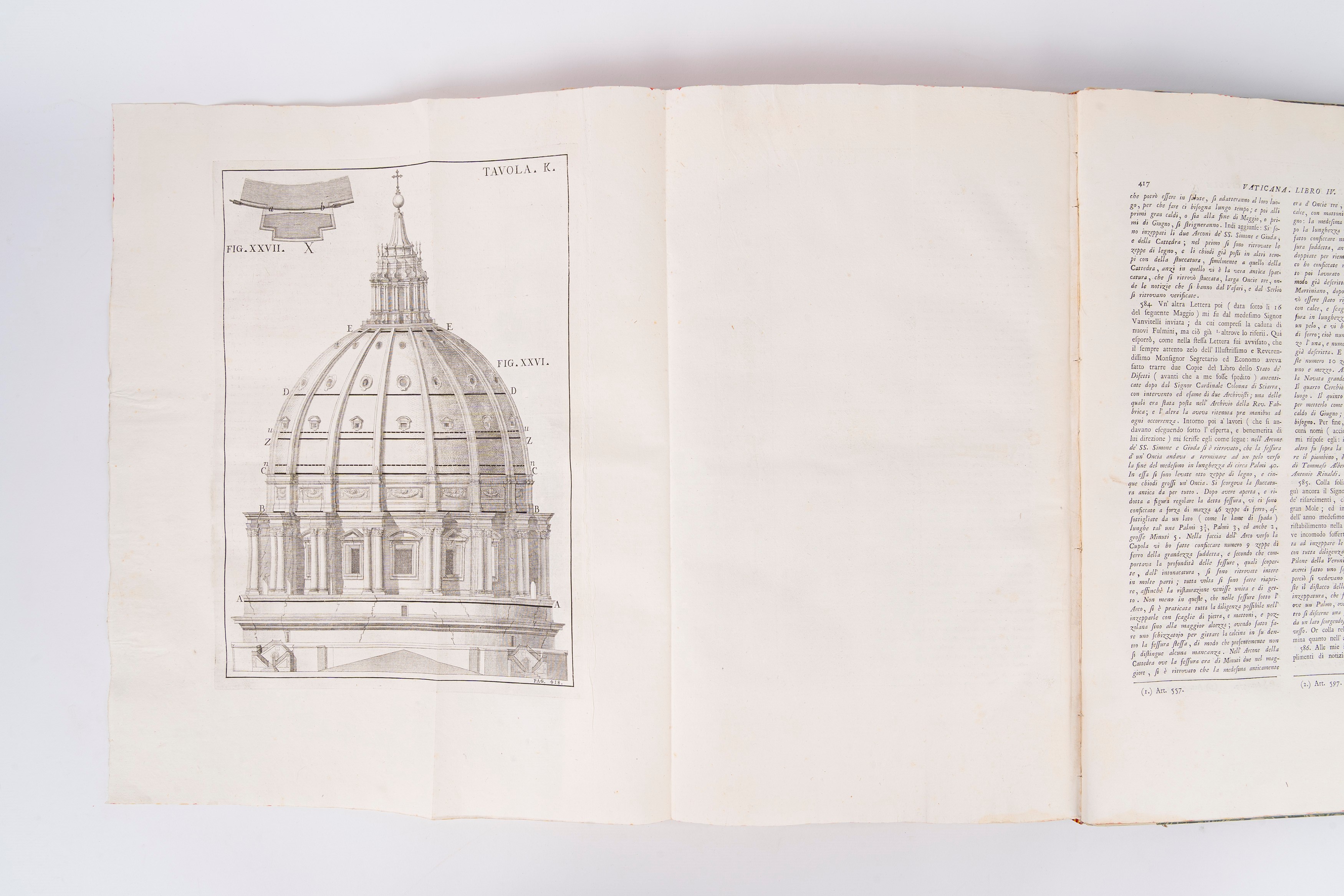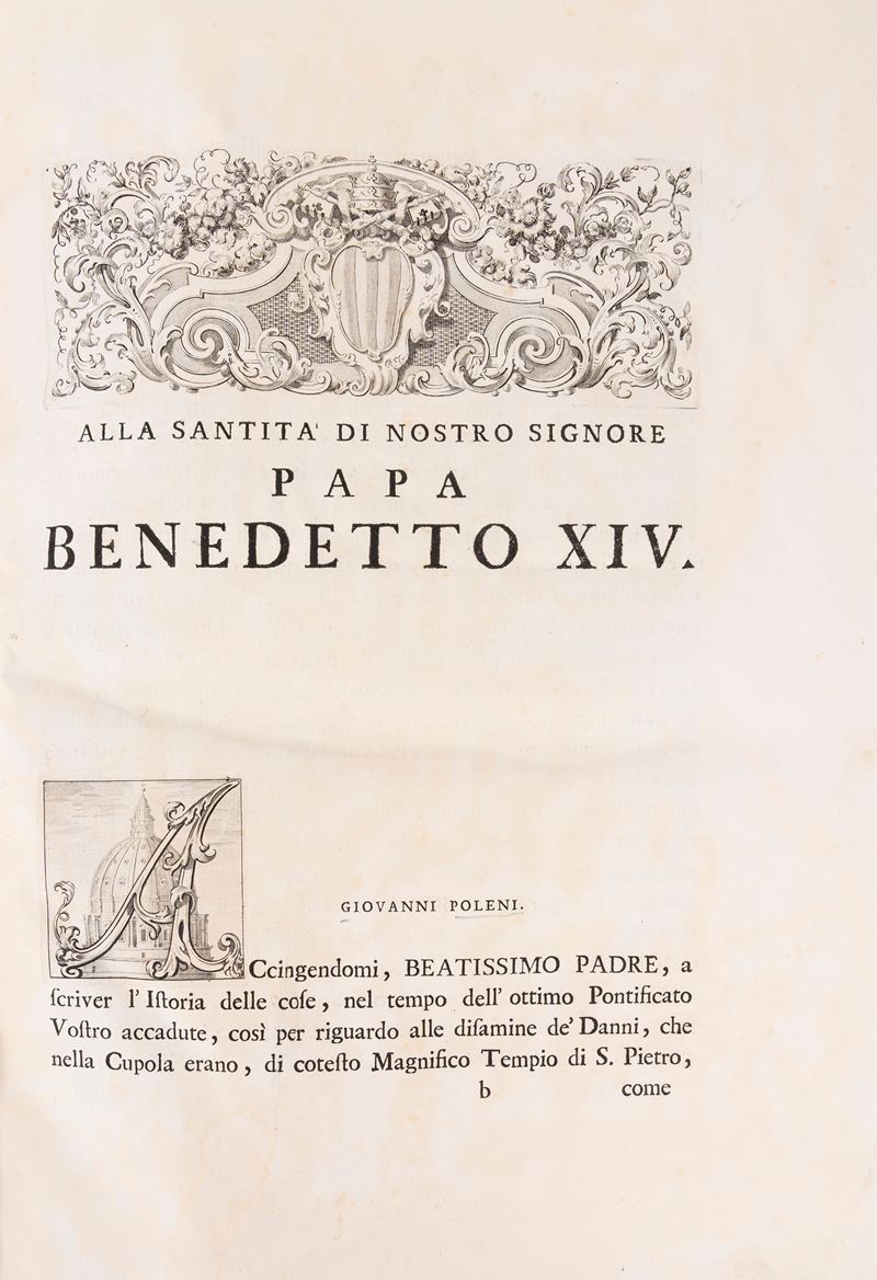 An elegant illustrated volume complete with 28 plates documenting the architectural consolidation project for the dome of St. Peter's in the Vatican, conceived by Poleni and subsequently realized by the renowned architect Luigi Vanvitelli. Giovanni Poleni (1683-1761), an Italian mathematician, physicist, and engineer, was an extraordinarily versatile scholar: he systematically studied the work of Vitruvius, in 1739 he obtained from the Serenissima the establishment of one of the first European chairs of Experimental Physics in Padua, and, the following year, he founded the first physics laboratory at an Italian university.