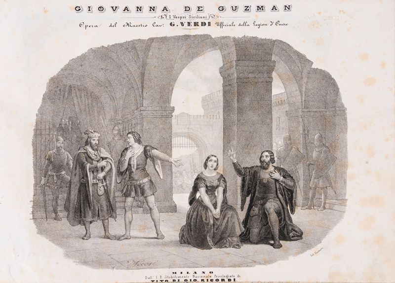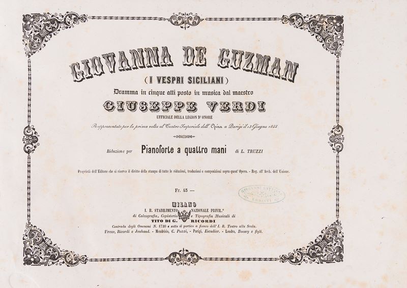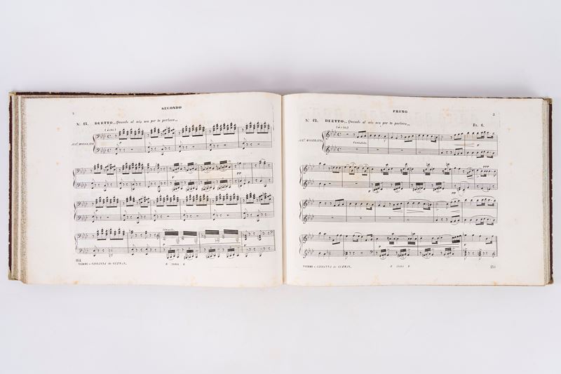 Milan, Tito di Gio. Ricordi, 1856. 2nd. Oblong. Engraving frontispiece, title page within a typographical frame, some light foxing, contemporary half-leather and chagrin binding, gilt title on the spine, minor defects.