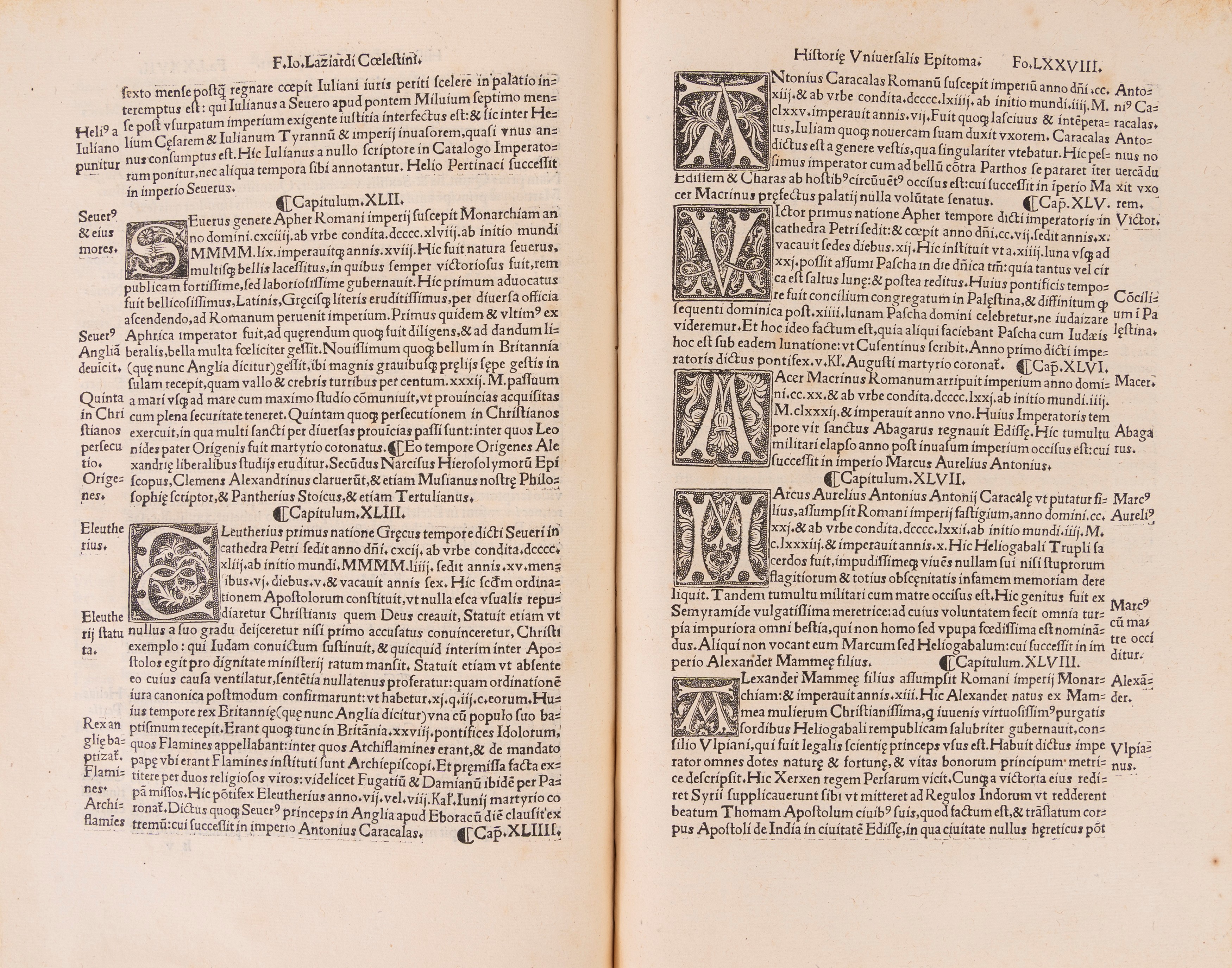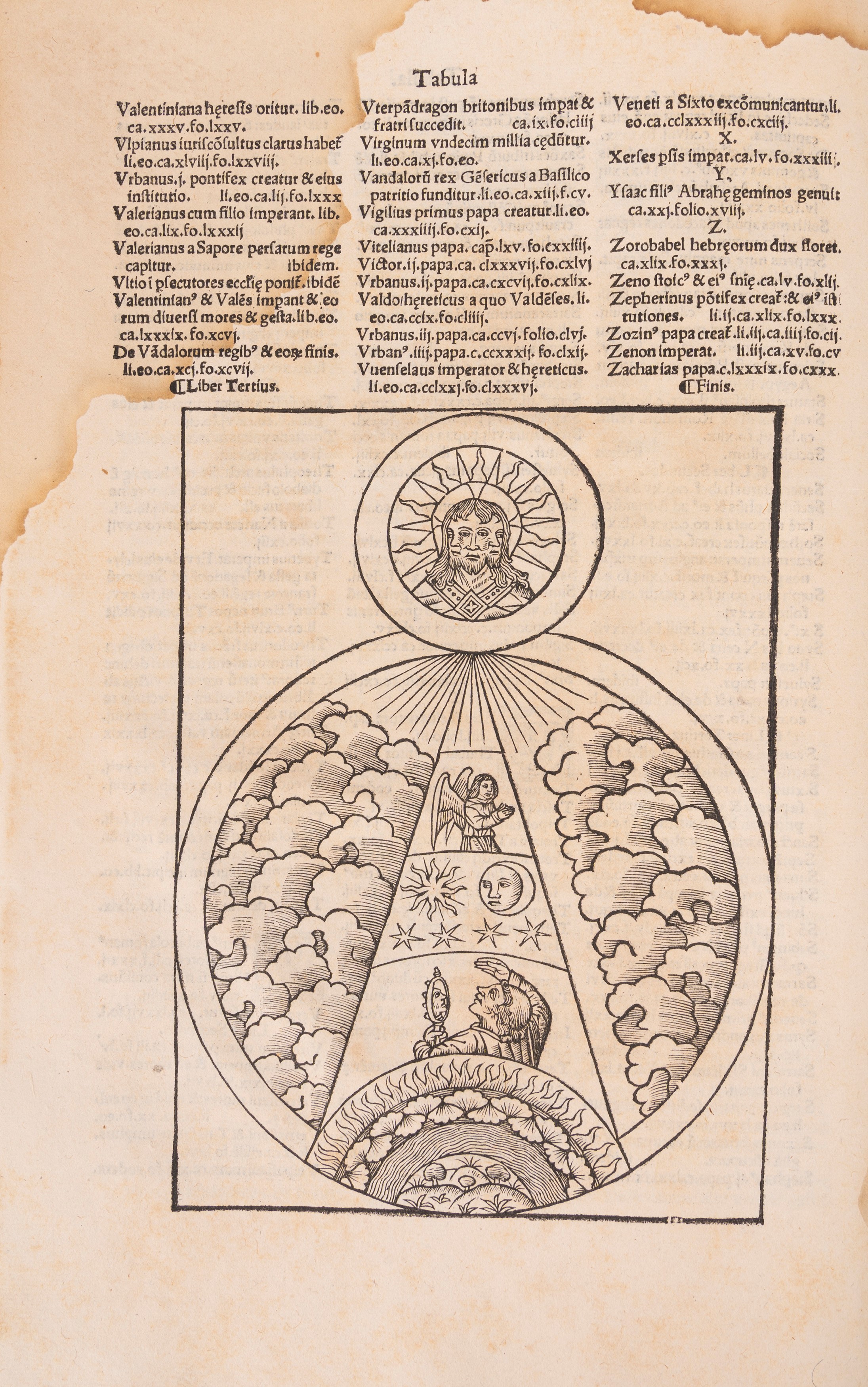 After examining the ancient Semitic period, as well as the classical Greek and Roman periods, the work focuses primarily on European history from the founding of the Holy Roman Empire. Chapters on India, Persia, and Africa are included in the early biblical sections. There were apparently three separate editions of this work containing the symbols of Le Fèvre, Kerver, or Conrad Resch within the elaborate woodcut title, and Le Fèvre's edition appears to be the rarest, as Renouard-Moreau omits any mention of his symbol (Renouard 600 and 602), which appears in our copy, citing only the symbols of Kerver and Conrad Resch.