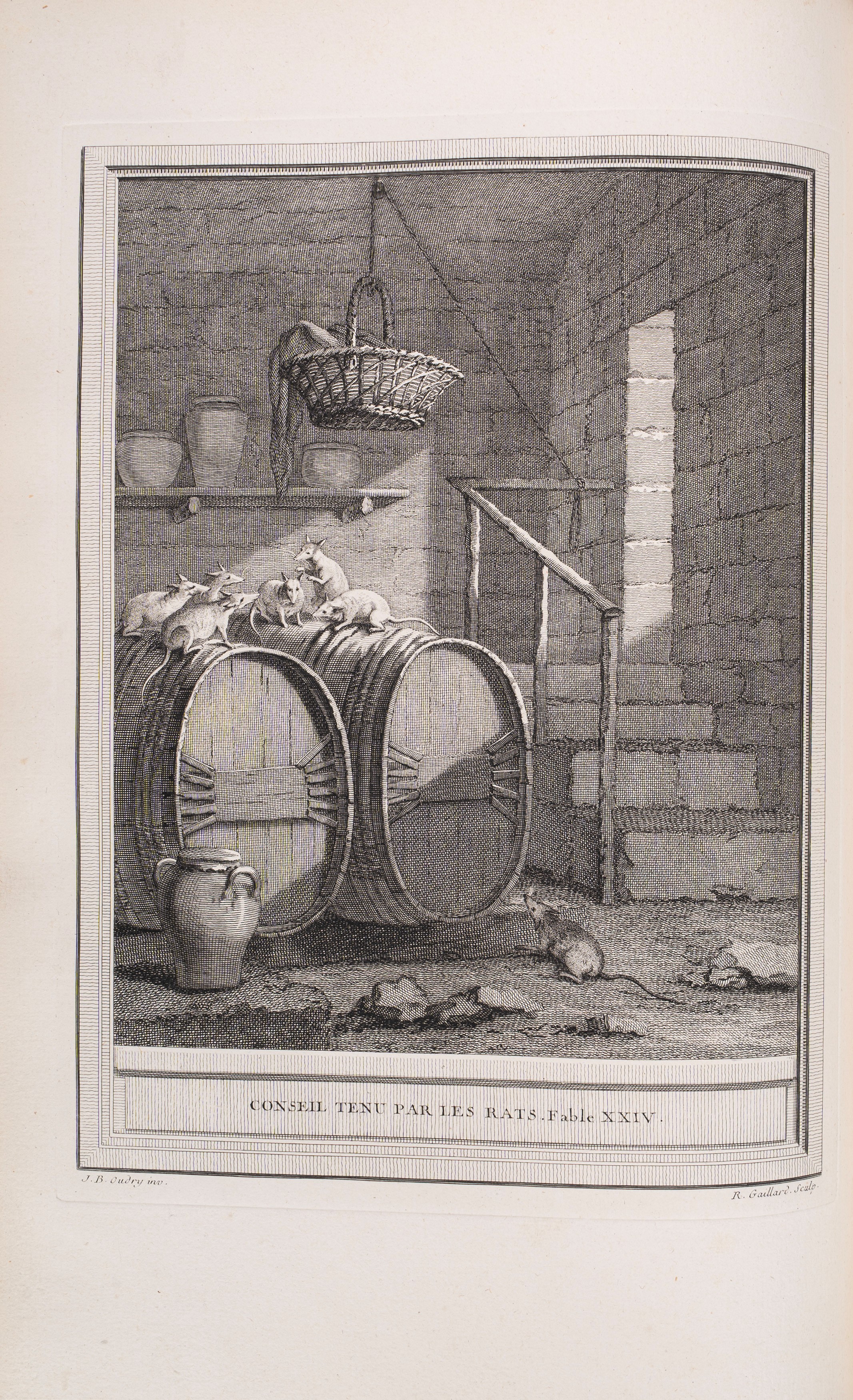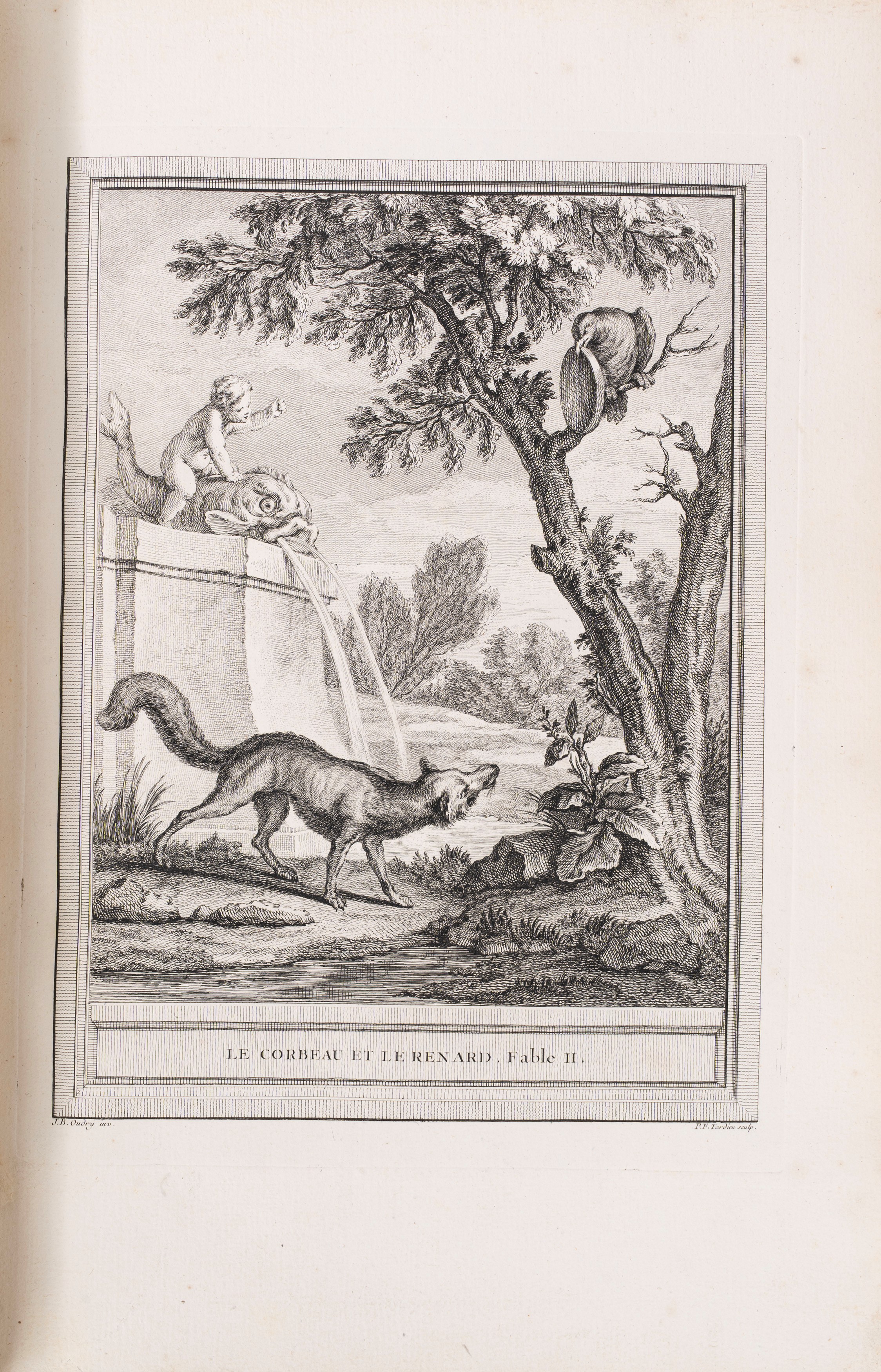 This celebrated edition of the Fables de la Fontaine is a masterpiece of Rococo illustration and one of the most famous illustrated works of all time. The four volumes contain, in addition to the allegorical frontispiece and portrait of the illustrator, 275 extraordinary copperplates engraved by the finest engravers of the period based on drawings by Jean-Baptiste Oudry (1686–1755), a painter, engraver, porcelain designer, and tapestry cartoonist, and from 1722 the official painter of Louis XV's "royal hunts" ("Peintre du Roy"). The panels were carved by Aubert, Aveline, Baquoy, Beauvais, Beauvarlet, Cars, Chedel, Chenu, Chevillet, Cochin, Cousinet (Elisabeth), Dupuis, Duret, de Fehrt, Fessard, Flipart, Floding, Gaillard, Gallimard, Lebas, Legrand, Lemire, Lempereur, Marvie, Menil, Moitte, Ouvrier, Pasquier, Pelletier, Pitre-Martenasie, Poletnich, Prévost, Radigues, Riland, Rode, Salvador, Sornique, Surugue, Tardieu, and Teucher. The realism with which the animals are portrayed, the beauty of the landscapes that form the backdrop, the liveliness of the scenes, and the fine detail are enchanting.