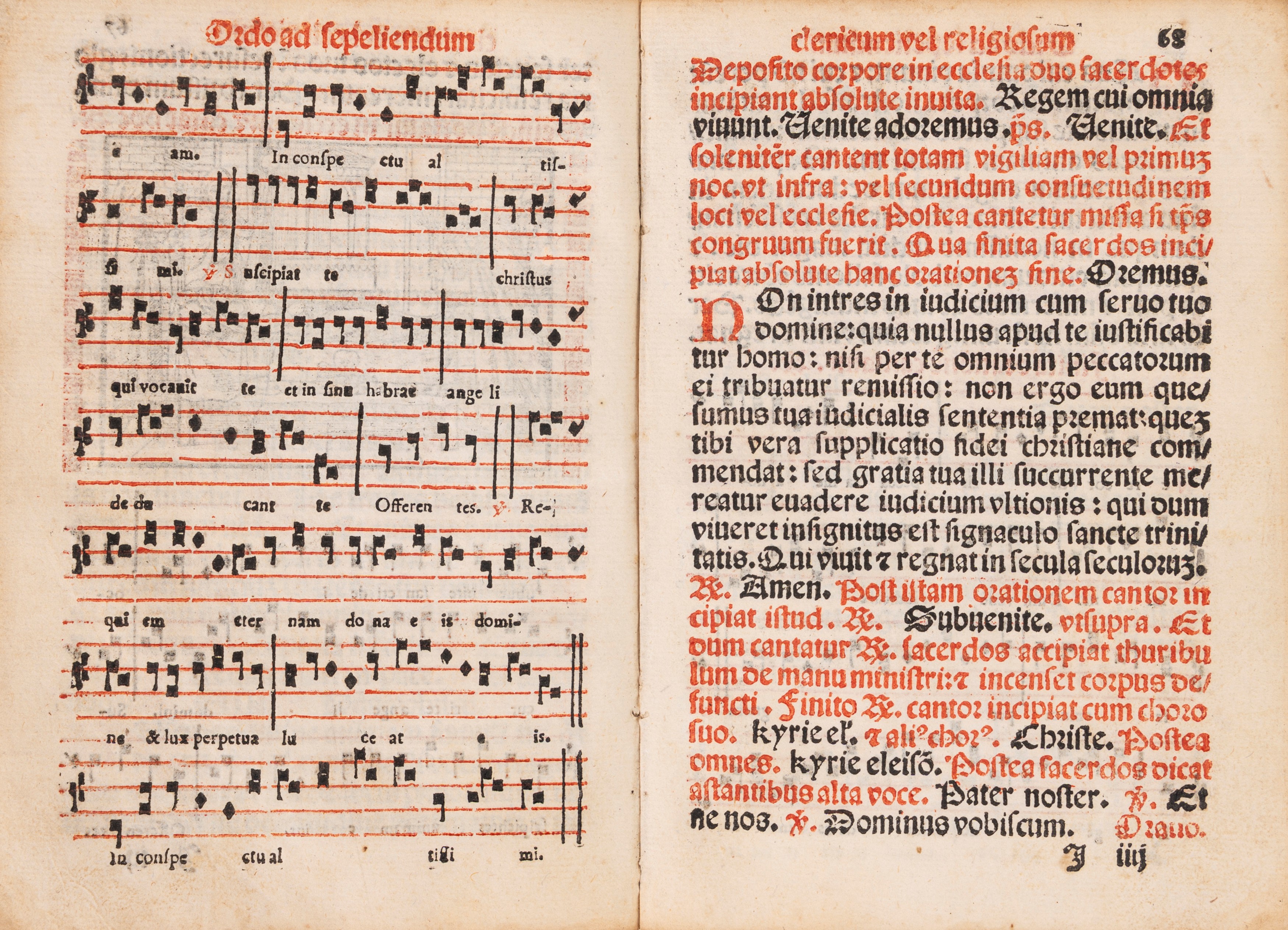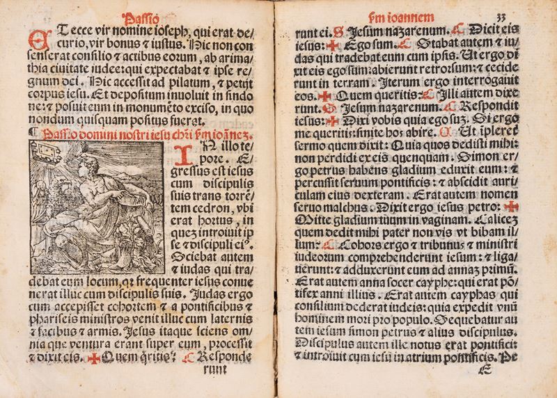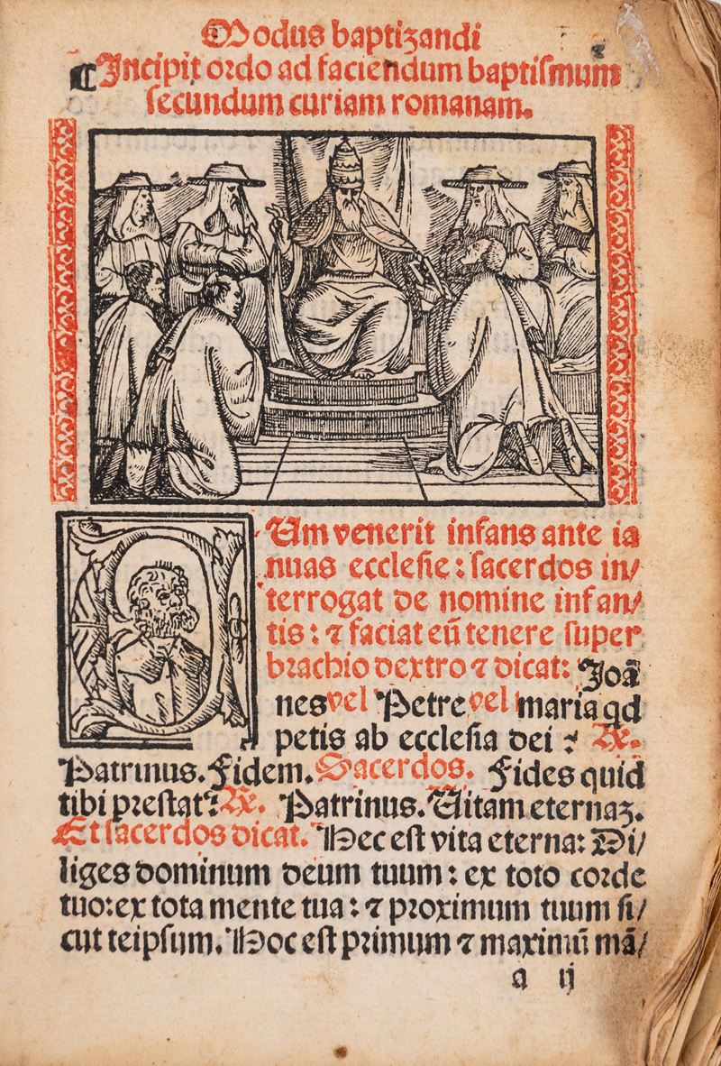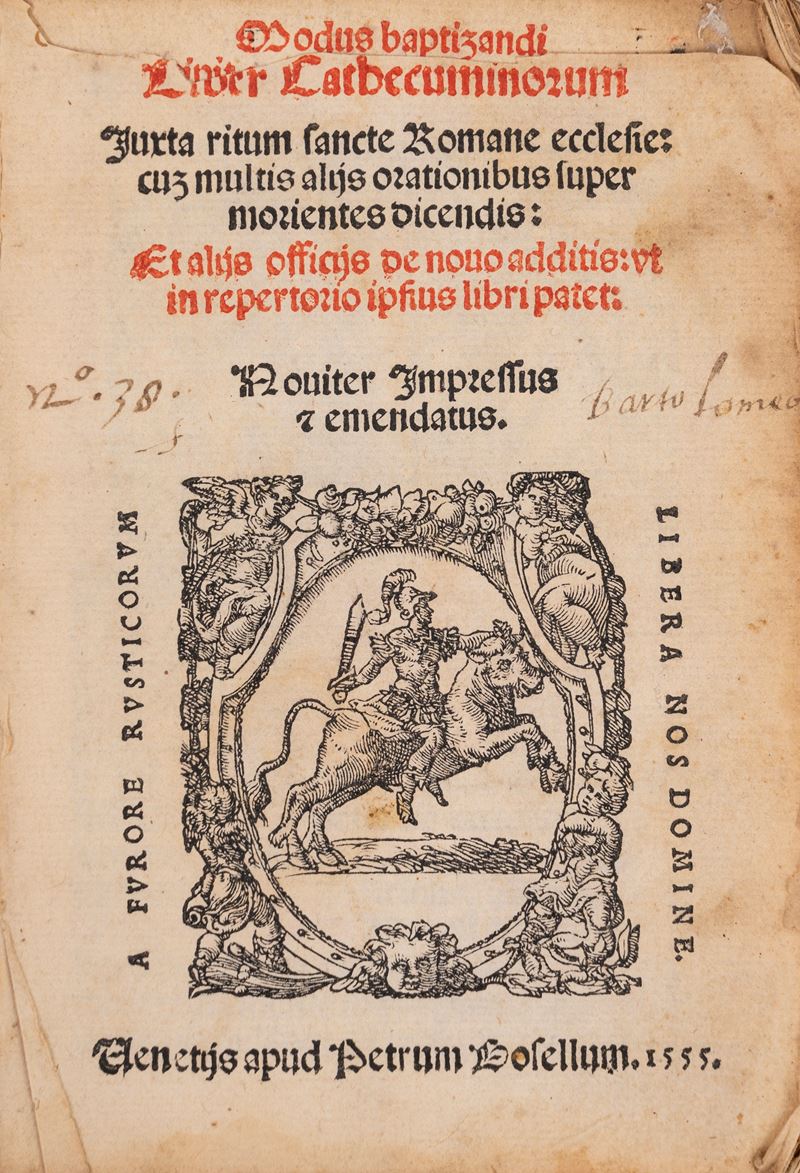 Venetijs, apud Petrum Bosellum, 1555. In 8vo. Title page in red and black with woodcut vignette, text in Gothic character in red and black, beautiful illustrations in the text, musical score, notes in an old hand on the last leaves, contemporary parchment binding, losses and defects. Ownership signature on the title page.
