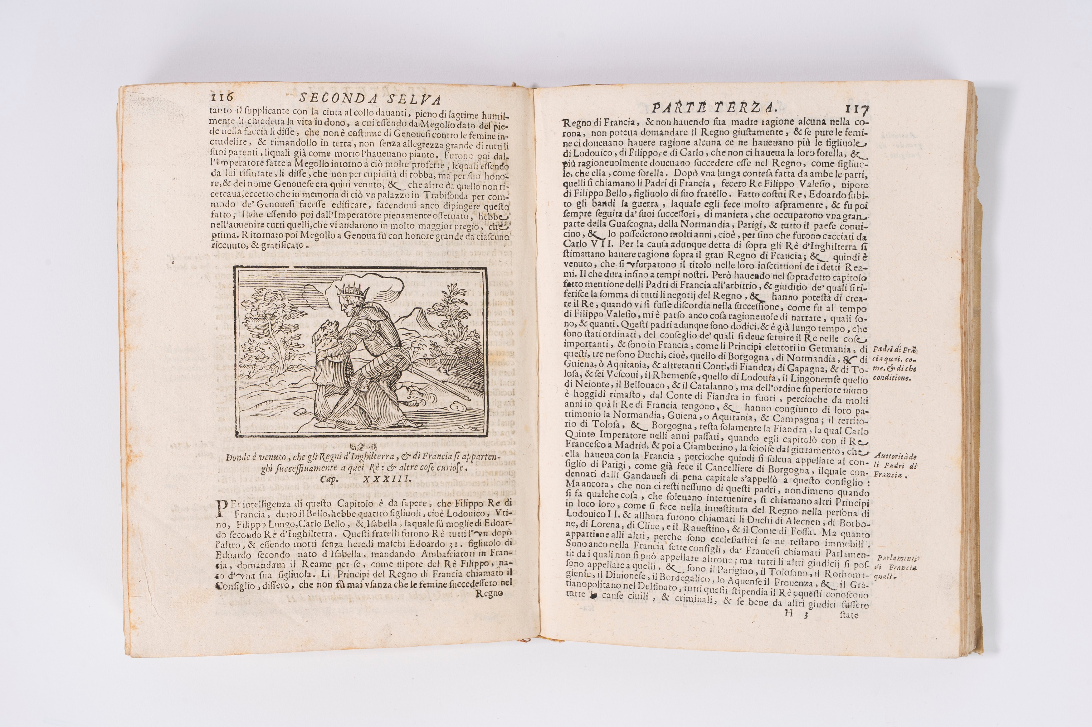 Venice, published by Ghirardo Imberti, 1638. In 4°. Printer's device with motto on a cartouche on the title page; the volume is accompanied by engravings within the text, and a coat of arms with a cartouche at the end. Full parchment binding with a handwritten title on the spine. The last leaf is blank. Woodworms and minor defects in the binding.