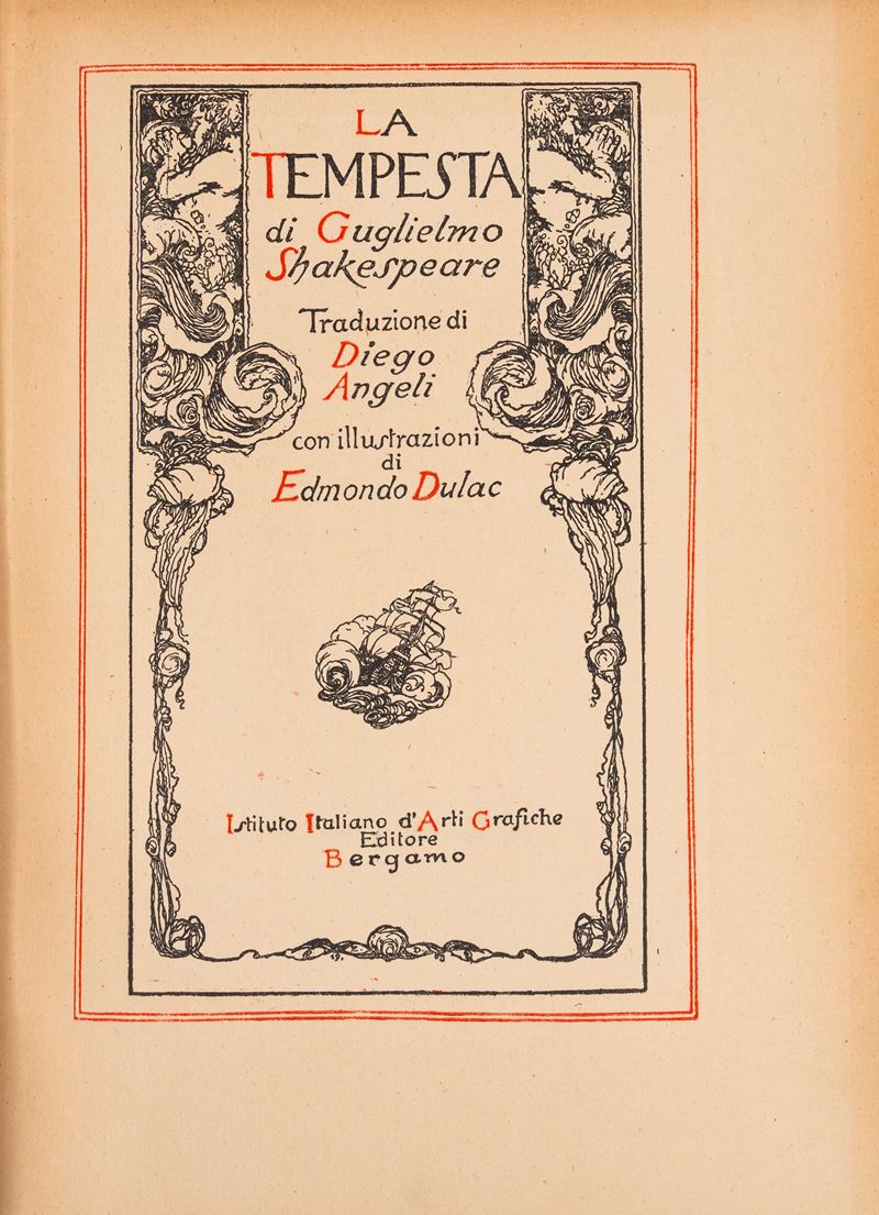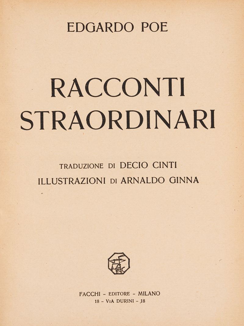 Bergamo, Istituto Italiano d'Arti Grafiche Editore, 1913. Title page with red and black title within a black and white frame, with color plates mounted on cardboard protected by tissue paper, black and white decorations designed by Dulac, usual light uniform browning, publisher's cloth binding, gold title and illustration on the front cover and spine, gilt upper edge, some light foxing. Bookplate on the front pastedown by "B. Pasi". § Together in the lot: Allan Poe E., Racconti straordinari , Milan, Facchi Editore, undated. Half cloth binding with hardback boards and publisher's dust jacket. Translation by Decio Cinti and drawings by Arnaldo Ginna. Copy in excellent condition.